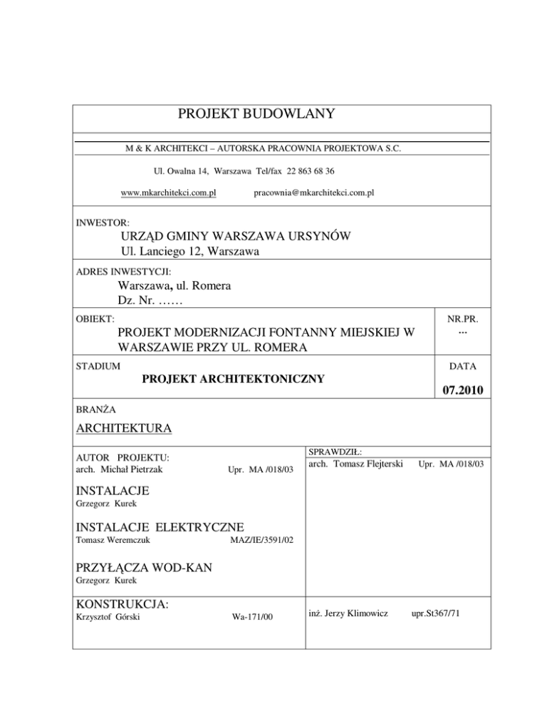 PROJEKT BUDOWLANY M & K ARCHITEKCI – AUTORSKA PRACOWNIA PROJEKTOWA S.C. Ul. Owalna 14, Warszawa Tel/fax 22 863 68 36 www.mkarchitekci.com.pl [email protected] INWESTOR: URZĄD GMINY WARSZAWA URSYNÓW Ul. Lanciego 12, Warszawa ADRES INWESTYCJI: Warszawa, ul. Romera Dz. Nr. …… OBIEKT: NR.PR. PROJEKT MODERNIZACJI FONTANNY MIEJSKIEJ W WARSZAWIE PRZY UL. ROMERA STADIUM … DATA PROJEKT ARCHITEKTONICZNY 07.2010 BRANśA ARCHITEKTURA AUTOR PROJEKTU: arch. Michał Pietrzak SPRAWDZIŁ: Upr. MA /018/03 arch. Tomasz Flejterski Upr. MA /018/03 INSTALACJE Grzegorz Kurek INSTALACJE ELEKTRYCZNE Tomasz Weremczuk MAZ/IE/3591/02 PRZYŁĄCZA WOD-KAN Grzegorz Kurek KONSTRUKCJA: Krzysztof Górski Wa-171/00 inŜ. Jerzy Klimowicz upr.St367/71 SPIS TREŚCI PROJEKT MODERNIZACJI FONTANNY MIEJSKIEJ W WARSZAWIE PRZY UL. ROMERA. TOM I. ARCHITEKTURA Część opisowa. 1. Decyzja Nr 2. Wypis z rejestru gruntów. 3. Oświadczenie inwestora o prawie do dysponowania nieruchomością 4. Kopie uprawnień projektanta oraz zaświadczenie z Izby Architektów 8. Oświadczenie projektanta 9. Opis techniczny wraz z informacją do BIOZ Część graficzna 1.0. Zagospodarowanie terenu, rys. nr 2, skala 1:500 2.0. Rzut główny niecki skala 1:50 3.0. Układ płyt kamiennych nad niecką oraz zestawienie płyt kamiennych skala 1:25 4.0. Układ buzonów podtrzymujących płyty skala 1:50 5.0. Przekrój A-A skala 1:20 6.0. Detal 1 skala 1:10 TOM II. KONSTRUKCJE PRZEKRYCIA NIECKI TOM III. INSTALACJE TOM IV. INSTALACJE ELEKTRYCZNE TOM. V. INSTALACJE - ODWODNIENIE LINIOWE TOM VI. KOSZTORYSY – PRZEDMIAROWY ORAZ INWESTORSKI OPIS TECHNICZNY DO PROJEKTU BUDOWLANEGO MODERNIZACJI FONTANNY MIEJSKIEJ W WARSZAWIE PRZY UL. ROMERA 1.DANE OGÓLNE Inwestor : URZĄD GMINY WARSZAWA URSYNÓW ul. Lanciego 12, Warszawa Adres inwestycji : Warszawa, ul. Romera Dz. Nr. …… Podstawa opracowania : Zlecenie Inwestora, Uzgodnienia z uŜytkownikiem, Mapa sytuacyjno-wysokościowa Inwentaryzacja budowlana i fotograficzna do celów projektowych opracowana MK Architekci w maju 2010 r, Fontanna, maszynownia oraz obszar instalacji związany z zasilaniem fontanny zlokalizowane są na terenie placu przed kościołem , w niewielkim zagłębieniu w stosunku do otaczajacej nawierzchni. Modernizacji podlega dolna i górna niecka fontanny. 1. PRZEDMIOT I ZAKRES OPRACOWANIA Podstawą do opracowania niniejszego projektu są ustalenia z inwestorem oraz projekt konstrukcji i instalacji fontanny w lokalizacji placu przy ul. Romera dz. nr. ewid. …... , w Warszawie. Fazą opracowania jest projekt architektoniczny oraz budowlano-wykonawczy, jego przedmiotem – podanie rozwiązań technicznych oraz załoŜeń wykonania i wykończenia w/w fontanny . Fontanna, maszynownia oraz obszar instalacji związany z zasilaniem fontanny zlokalizowane są na działce skweru miejskiego. Zakres opracowania obejmuje wykonanie przekrycia niecki fontanny, jej uszczelnienie oraz wykonania stacji uzdatniania dla pomp zasilających dysze. 2. OPIS OGÓLNY FONTANNY Modernizowana fontanna ma kształt prostokąta, zbliŜonego do kwadratu o wymiarach po zewnętrznym obrysie -897x893cm. Składa się z dwóch poziomów niecek, do których z poziomu placu prowadzą schody, okalające z czterech stron fontannę. Istniejące niecki dolna i górna zostaną przekryte płytami kamiennymi (granit strzegomski - kolor szary) z atestem antypoślizgowym, ułoŜonymi na ruszcie systemowym. Fontanna otoczona jest pasami odwodnienia - drenami f-my ACO. Instalacja biegnie do stacji uzdatniania (maszynowni) znajdująca się pod posadzka placu. 3. KONSTRUKCJA Projektowana konstrukcja zakłada w części dolnej niecki wyburzenie istniejących słupków, likwidację kraty zabezpieczającej. W przestrzeni dolnej niecki powstanie konstrukcja stalowa, która pozwoli na zamontowanie w części górnej niecki buzonów, a na nich płyt granitowych na ruszcie systemowym. W obrębie niecki dolnej i górnej planuje się, przylegające do istniejących, nowe ścianki Ŝelbetowe grub. 10,0cm oraz płytę Ŝelbetową grub. 10,0cm z zachowaniem spadków o tych samych wartościach co istniejące. Ściany zewnętrzne jak i płytę naleŜy zaizolować termicznie i wodoszczelnie (zastosować polistyren ekstradowany twardy i izolacje przeciwwodne). Przejścia instalacyjne przez zbiornik wykonać typu szczelnego. Usytuowanie otworów w zbiorniku naleŜy sprawdzić z projektem instalacyjnym. Nieckę fontanny projektuje się z betonu B30(C30)-W10. Plac wokół fontanny powinien być odpowiednio oznakowany i zabezpieczony przed wjazdem pojazdów samochodowych. Ścianki niecki od strony gruntu jak i płytę denną naleŜy zaizolować izolacjami przeciwwodnymi. Przejścia powinny być wykonane typu szczelnego. 4.INSTALACJE 4.1 Opis instalacji i urządzeń 4.1 OPIS OGÓLNY FONTANNY Fontanna wykonana będzie w postaci zagłębionej pod poziomem terenu betonowej niecki, przykrytej płytami kamiennymi. Forma obrazów wodnych osiągana będzie poprzez 25 szt. dysz typ Kometa 10-12 LT (KO) bijącymi wodą na wysokość do 1,5m. Dysze zintegrowane będą z podwodnymi agregatami fontannowymi typ Varionaut EC1 (EC). Oświetlenie ww. obrazów wodnych realizowane będzie za pomocą reflektorów ze światłem ledowym typ BEST LED 222+ (LED). Sterowanie agregatami Varionaut EC1 oraz reflektorami BEST LED 222+ odbywać się będzie za pośrednictwem programowalnych sterowników EasyControl poprzez system sygnałów DMX. Obrazy wodne oraz światło będą zsynchronizowane. Woda będzie uzdatniania i dezynfekowana w zestawie urządzeń dla tego celu zamontowanych w wydzielonym pomieszczeniu technicznym. 4.2 OPIS INSTALACJI Przepływ wody w instalacji fontanny podzielony jest na dwa niezaleŜnie pracujące obiegi: uzdatniania wody oraz zasilania dysz. Stacja uzdatniania umieszczona będą w podziemnym pomieszczeniu technicznym. Agregaty fontannowe umieszczone będą w niecce fontanny. Praca fontanny będzie sterowana automatycznie. Zaprogramowanie czasu pracy fo