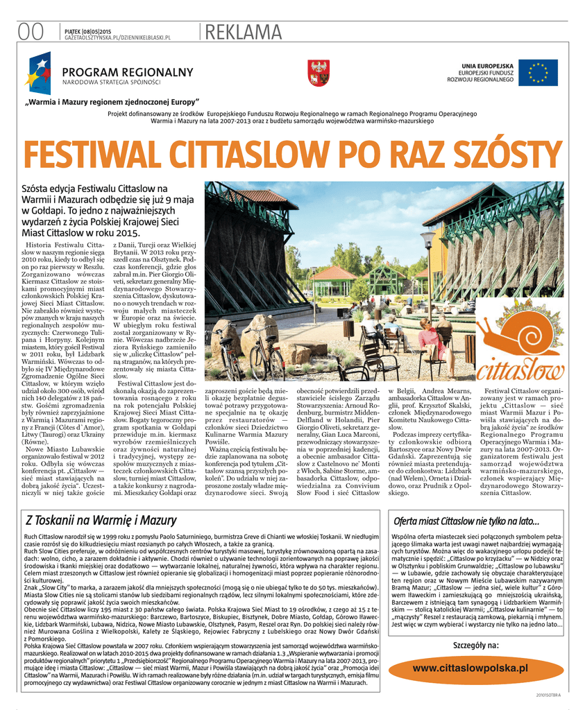 00 PIĄTEK |08|05|2015 GAZETAOLSZTYNSKA.PL/DZIENNIKELBLASKI.PL REKLAMA „Warmia i Mazury regionem zjednoczonej Europy” Projekt dofinansowany ze środków Europejskiego Funduszu Rozwoju Regionalnego w ramach Regionalnego Programu Operacyjnego Warmia i Mazury na lata 2007-2013 oraz z budżetu samorządu województwa warmińsko-mazurskiego FESTIWAL CITTASLOW PO RAZ SZÓSTY Szósta edycja Festiwalu Cittaslow na Warmii i Mazurach odbędzie się już 9 maja w Gołdapi. To jedno z najważniejszych wydarzeń z życia Polskiej Krajowej Sieci Miast Cittaslow w roku 2015. Historia Festiwalu Cittaslow w naszym regionie sięga 2010 roku, kiedy to odbył się on po raz pierwszy w Reszlu. Zorganizowano wówczas Kiermasz Cittaslow ze stoiskami promocyjnymi miast członkowskich Polskiej Krajowej Sieci Miast Cittaslow. Nie zabrakło również występów znanych w kraju naszych regionalnych zespołów muzycznych: Czerwonego Tulipana i Horpyny. Kolejnym miastem, który gościł Festiwal w 2011 roku, był Lidzbark Warmiński. Wówczas to odbyło się IV Międzynarodowe Zgromadzenie Ogólne Sieci Cittaslow, w którym wzięło udział około 300 osób, wśród nich 140 delegatów z 18 państw. Gośćmi zgromadzenia były również zaprzyjaźnione z Warmią i Mazurami regiony z Francji (Côtes d`Amor), Litwy (Taurogi) oraz Ukrainy (Równe). Nowe Miasto Lubawskie organizowało festiwal w 2012 roku. Odbyła się wówczas konferencja pt. „Cittaslow — sieć miast stawiających na dobrą jakość życia“. Uczestniczyli w niej także goście z Danii, Turcji oraz Wielkiej Brytanii. W 2013 roku przyszedł czas na Olsztynek. Podczas konferencji, gdzie głos zabrał m.in. Pier Giorgio Oliveti, sekretarz generalny Międzynarodowego Stowarzyszenia Cittaslow, dyskutowano o nowych trendach w rozwoju małych miasteczek w Europie oraz na świecie. W ubiegłym roku festiwal został zorganizowany w Rynie. Wówczas nadbrzeże Jeziora Ryńskiego zamieniło się w „uliczkę Cittaslow“ pełną straganów, na których prezentowały się miasta Cittaslow. Festiwal Cittaslow jest doskonałą okazją do zaprezentowania rosnącego z roku na rok potencjału Polskiej Krajowej Sieci Miast Cittaslow. Bogaty tegoroczny program spotkania w Gołdapi przewiduje m.in. kiermasz wyrobów rzemieślniczych oraz żywności naturalnej i tradycyjnej, występy zespołów muzycznych z miasteczek członkowskich Cittaslow, turniej miast Cittaslow, a także konkursy z nagrodami. Mieszkańcy Gołdapi oraz zaproszeni goście będą mieli okazję bezpłatnie degustować potrawy przygotowane specjalnie na tę okazję przez restauratorów — członków sieci Dziedzictwo Kulinarne Warmia Mazury Powiśle. Ważną częścią festiwalu będzie zaplanowana na sobotę konferencja pod tytułem „Cittaslow szansą przyszłych pokoleń”. Do udziału w niej zaproszone zostały władze międzynarodowe sieci. Swoją obecność potwierdzili przedstawiciele ścisłego Zarządu Stowarzyszenia: Arnoud Rodenburg, burmistrz MiddenDelfland w Holandii, Pier Giorgio Oliveti, sekretarz generalny, Gian Luca Marconi, przewodniczący stowarzyszenia w poprzedniej kadencji, a obecnie ambasador Cittaslow z Castelnovo ne’ Monti z Włoch, Sabine Storme, ambasadorka Cittaslow, odpowiedzialna za Convivium Slow Food i sieć Cittaslow Z Toskanii na Warmię i Mazury Ruch Cittaslow narodził się w 1999 roku z pomysłu Paolo Saturniniego, burmistrza Greve di Chianti we włoskiej Toskanii. W niedługim czasie rozrósł się do kilkudziesięciu miast rozsianych po całych Włoszech, a także za granicą. Ruch Slow Cities preferuje, w odróżnieniu od współczesnych centrów turystyki masowej, turystykę zrównoważoną opartą na zasadach: wolno, cicho, a zarazem dokładnie i aktywnie. Chodzi również o używanie technologii zorientowanych na poprawę jakości środowiska i tkanki miejskiej oraz dodatkowo — wytwarzanie lokalnej, naturalnej żywności, która wpływa na charakter regionu. Celem miast zrzeszonych w Cittaslow jest również opieranie się globalizacji i homogenizacji miast poprzez popieranie różnorodności kulturowej. Znak „Slow City” to marka, a zarazem jakość dla mniejszych społeczności (mogą się o nie ubiegać tylko te do 50 tys. mieszkańców). Miasta Slow Cities nie są stolicami stanów lub siedzibami regionalnych rządów, lecz silnymi lokalnymi społecznościami, które zdecydowały się poprawić jakość życia swoich mieszkańców. Obecnie sieć Cittaslow liczy 195 miast z 30 państw całego świata. Polska Krajowa Sieć Miast to 19 ośrodków, z czego aż 15 z terenu województwa warmińsko-mazurskiego: Barczewo, Bartoszyce, Biskupiec, Bisztynek, Dobre Miasto, Gołdap, Górowo Iławeckie, Lidzbark Warmiński, Lubawa, Nidzica, Nowe Miasto Lubawskie, Olsztynek, Pasym, Reszel oraz Ryn. Do polskiej sieci należy również Murowana Goślina z Wielkopolski, Kalety ze Śląskiego, Rejowiec Fabryczny z Lubelskiego oraz Nowy Dwór Gdański z Pomorskiego. Polska Krajowa Sieć Cittaslow powstała w 2007 roku. Członkiem wspierającym stowarzyszenia jest samorząd województwa warmińskomazurskiego. Realizował on w latach 2010-2015 dwa projekty dofinansowane w ramach działania 1.3 „Wspieranie wytwarzania i promocji produktów regionalnych” priorytetu 1 „Przedsiębiorczość” Regionalnego Programu Operacyjnego Warmia i Mazury na lata 2007-2013, promujące ideę i miasta Cittaslow: „Cittaslow — sieć miast Warmii, Mazur i Powiśla stawiających na dobrą jakość życia“ oraz „Promocja idei Cittaslow” na Warmii, Mazurach i Powiślu. W ich ramach realizowane były różne działania (m.in. udział w targach turystycznych, emisja filmu promocyjnego czy wydawnictwa) oraz Festiwal Cittaslow organizowany corocznie w jednym z miast Cittaslow na Warmii i Mazurach. w Belgii, Andrea Mearns, ambasadorka Cittaslow w Anglii, prof. Krzysztof Skalski, członek Międzynarodowego Komitetu Naukowego Cittaslow. Podczas imprezy certyfikaty członkowskie