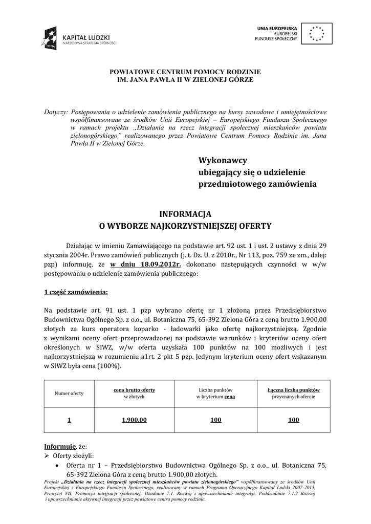 POWIATOWE CENTRUM POMOCY RODZINIE IM. JANA PAWŁA II W ZIELONEJ GÓRZE Dotyczy: Postępowania o udzielenie zamówienia publicznego na kursy zawodowe i umiejętnościowe współfinansowane ze środków Unii Europejskiej – Europejskiego Funduszu Społecznego w ramach projektu „Działania na rzecz integracji społecznej mieszkańców powiatu zielonogórskiego” realizowanego przez Powiatowe Centrum Pomocy Rodzinie im. Jana Pawła II w Zielonej Górze. Wykonawcy ubiegający się o udzielenie przedmiotowego zamówienia INFORMACJA O WYBORZE NAJKORZYSTNIEJSZEJ OFERTY Działając w imieniu Zamawiającego na podstawie art. 92 ust. 1 i ust. 2 ustawy z dnia 29 stycznia 2004r. Prawo zamówień publicznych (j. t. Dz. U. z 2010r., Nr 113, poz. 759 ze zm., dalej: pzp) informuję, że w dniu 18.09.2012r. dokonano następujących czynności w w/w postępowaniu o udzielenie zamówienia publicznego: 1 część zamówienia: Na podstawie art. 91 ust. 1 pzp wybrano ofertę nr 1 złożoną przez Przedsiębiorstwo Budownictwa Ogólnego Sp. z o.o., ul. Botaniczna 75, 65-392 Zielona Góra z ceną brutto 1.900,00 złotych za kurs operatora koparko - ładowarki jako ofertę najkorzystniejszą. Zgodnie z wynikami oceny ofert przeprowadzonej na podstawie warunków i kryteriów oceny ofert określonych w SIWZ, w/w oferta uzyskała 100 punktów na 100 możliwych i jest najkorzystniejszą w rozumieniu a1rt. 2 pkt 5 pzp. Jedynym kryterium oceny ofert wskazanym w SIWZ była cena (100%). Numer oferty cena brutto oferty w złotych Liczba punktów w kryterium cena Łączna liczba punktów przyznanych ofercie 1 1.900,00 100 100 Informuję, że: Oferty złożyli: Oferta nr 1 – Przedsiębiorstwo Budownictwa Ogólnego Sp. z o.o., ul. Botaniczna 75, 65-392 Zielona Góra z ceną brutto 1.900,00 złotych. Projekt „Działania na rzecz integracji społecznej mieszkańców powiatu zielonogórskiego” współfinansowany ze środków Unii Europejskiej z Europejskiego Funduszu Społecznego, realizowany w ramach Programu Operacyjnego Kapitał Ludzki 2007-2013, Priorytet VII. Promocja integracji społecznej, Działanie 7.1. Rozwój i upowszechnianie integracji, Poddziałanie 7.1.2 Rozwój i upowszechnianie aktywnej integracji przez powiatowe centra pomocy rodzinie. POWIATOWE CENTRUM POMOCY RODZINIE IM. JANA PAWŁA II W ZIELONEJ GÓRZE Nie wykluczono żadnego Wykonawcy. Nie odrzucono żadnej oferty. Zawarcie umowy w przedmiotowym postępowaniu może nastąpić zgodnie z dyspozycją art. 94 ust. 1 pkt 2 pzp w zw. z ust. 2 pkt 1 lit. a pzp, tj. w terminie krótszym niż 5 dni od dnia przesłania faksem niniejszego zawiadomienia o wyborze najkorzystniejszej oferty. Na w/w rozstrzygnięcia w postępowaniu przysługują środki ochrony prawnej przewidziane w Dziale VI pzp. 2 część zamówienia: Na podstawie art. 91 ust. 1 pzp wybrano ofertę nr 4 złożoną przez Piotra Lewandowskiego prowadzącego działalność gospodarczą pod firmą Ośrodek Szkolenia PAS Piotr Lewandowski, ul. Jędrzychowska 46, 65-385 Zielona Góra z ceną brutto 2.200,00 złotych za kurs spawania blach spoinami czołowymi metodą MAG jako ofertę najkorzystniejszą. Zgodnie z wynikami oceny ofert przeprowadzonej na podstawie warunków i kryteriów oceny ofert określonych w SIWZ, w/w oferta uzyskała 100 punktów na 100 możliwych i jest najkorzystniejszą w rozumieniu a2rt. 2 pkt 5 pzp. Jedynym kryterium oceny ofert wskazanym w SIWZ była cena (100%). Numer oferty cena brutto oferty w złotych Liczba punktów w kryterium cena Łączna liczba punktów przyznanych ofercie 1 2.200,00 100 100 Informuję, że: Oferty złożyli: Oferta nr 4 – Piotr Lewandowski prowadzący działalność gospodarczą pod firmą Ośrodek Szkolenia PAS Piotr Lewandowski, ul. Jędrzychowska 46, 65-385 Zielona Góra z ceną brutto 2.200,00 złotych. Nie wykluczono żadnego Wykonawcy. Nie odrzucono żadnej oferty. Zawarcie umowy w przedmiotowym postępowaniu może nastąpić zgodnie z dyspozycją art. 94 ust. 1 pkt 2 pzp w zw. z ust. 2 pkt 1 lit. a pzp, tj. w terminie krótszym niż 5 dni od dnia przesłania faksem niniejszego zawiadomienia o wyborze najkorzystniejszej oferty. Na w/w rozstrzygnięcia w postępowaniu przysługują środki ochrony prawnej przewidziane w Dziale VI pzp. Projekt „Działania na rzecz integracji społecznej mieszkańców powiatu zielonogórskiego” współfinansowany ze środków Unii Europejskiej z Europejskiego Funduszu Społecznego, realizowany w ramach Programu Operacyjnego Kapitał Ludzki 2007-2013, Priorytet VII. Promocja integracji społecznej, Działanie 7.1. Rozwój i upowszechnianie integracji, Poddziałanie 7.1.2 Rozwój i upowszechnianie aktywnej integracji przez powiatowe centra pomocy rodzinie. POWIATOWE CENTRUM POMOCY RODZINIE IM. JANA PAWŁA II W ZIELONEJ GÓRZE 3 część zamówienia: Na podstawie art. 91 ust. 1 pzp wybrano ofertę nr 5 złożoną przez Centrum Nauki i Biznesu ŻAK Sp. z o.o., ul. Piotrowska 278, 90-361 Łódź z ceną brutto 1.3500,00 złotych za kurs bukieciarstwa jako ofertę najkorzystniejszą. Zgodnie z wynikami oceny ofert przeprowadzonej na podstawie warunków i kryteriów oceny ofert określonych w SIWZ, w/w oferta uzyskała 100 punktów na 100 możliwych i jest najkorzystniejszą w rozumieniu a3rt. 2 pkt 5 pzp. Jedynym kryterium oceny ofert wskazanym w SIWZ była cena (100%). Numer oferty cena brutto oferty w złotych Liczba punktów w kryterium cena Łączna liczba punktów przyznanych ofercie 5 1.350,00 100 100 6 1.950,00 69,23 69,23 Informuję, że: Oferty złożyli: Oferta nr 5 – Centrum Nauki i Biznesu ŻAK Sp. z o.o., ul. Piotrowska 278, 90-361 Łódź z ceną brutto 1.3500,00 złotych. Oferta nr 6 – Zakład Doskonalenia Zawodowego, ul. Stary Rynek 17, 65-958 Zielona Góra z ceną brutto 1.950,00 złotych. Nie wykluczono żadnego Wykonawcy. Nie odrzucono żadnej oferty. Zawarcie umowy w przedmiotowym postępowaniu może nastąpić zgodnie z dyspozycją art. 94 ust. 1 pkt 2 pzp w zw. z ust. 2 pkt 1 lit. a