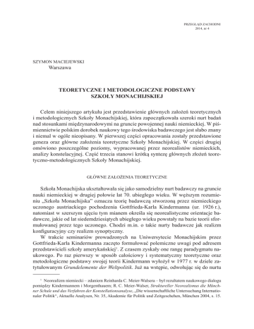 PRZEGLĄD ZACHODNI 2014, nr 4 Szymon Maciejewski Warszawa Teoretyczne i metodologiczne podstawy Szkoły Monachijskiej Celem niniejszego artykułu jest przedstawienie głównych założeń teoretycznych i metodologicznych Szkoły Monachijskiej, która zapoczątkowała szeroki nurt badań nad stosunkami międzynarodowymi na gruncie powojennej nauki niemieckiej. W piśmiennictwie polskim dorobek naukowy tego środowiska badawczego jest słabo znany i niemal w ogóle nieopisany. W pierwszej części opracowania zostały przedstawione geneza oraz główne założenia teoretyczne Szkoły Monachijskiej. W części drugiej omówiono poszczególne poziomy, wypracowanej przez neorealistów niemieckich, analizy konstelacyjnej. Część trzecia stanowi krótką syntezę głównych złożeń teoretyczno-metodologicznych Szkoły Monachijskiej. GŁÓWNE ZAŁOŻENIA TEORETYCZNE Szkoła Monachijska ukształtowała się jako samodzielny nurt badawczy na gruncie nauki niemieckiej w drugiej połowie lat 70. ubiegłego wieku. W węższym rozumieniu „Szkoła Monachijska” oznacza teorię badawczą stworzoną przez niemieckiego uczonego austriackiego pochodzenia Gottfrieda-Karla Kindermanna (ur. 1926 r.), natomiast w szerszym ujęciu tym mianem określa się neorealistyczne orientacje badawcze, jakie od lat siedemdziesiątych ubiegłego wieku powstały na bazie teorii sformułowanej przez tego uczonego. Chodzi m.in. o takie nurty badawcze jak realizm konfiguracyjny czy realizm synoptyczny. W trakcie seminariów prowadzonych na Uniwersytecie Monachijskim przez Gottfrieda-Karla Kindermanna zaczęto formułować polemiczne uwagi pod adresem przedstawicieli szkoły amerykańskiej1. Z czasem zyskały one rangę paradygmatu naukowego. Po raz pierwszy w sposób całościowy i systematyczny teoretyczne oraz metodologiczne podstawy swojej teorii Kindermann wyłożył w 1977 r. w dziele zatytułowanym Grundelemente der Weltpolitik. Już na wstępie, odwołując się do nurtu 1 Neorealizm niemiecki – zdaniem Reinharda C. Meier-Walsera – był rezultatem naukowego dialogu pomiędzy Kindermannem i Morgenthauem; R. C. Meier-Walser, Struktureller Neorealismus die Münchner Schule und das Verfahren der Konstellationsanalyse, „Die wissenschaftliche Untersuchung Internationaler Politik“, Aktuelle Analysen, Nr. 35, Akademie für Politik und Zeitgeschehen, München 2004, s. 15. 26 Szymon Maciejewski realistycznego, autor deklarował, iż głównym celem tej publikacji jest prezentacja oraz naukowe uzasadnienie podstaw teoretycznych oraz dyrektyw metodologicznych Szkoły Monachijskiej2. Identyfikacji Kindermanna z neorealizmem amerykańskim nie należy utożsamiać z akceptacją wszystkich jego założeń teoretycznych. Należy rozumieć ją raczej w kategoriach inspiracji oraz formalnego zaszeregowania. Termin „realistyczny” – jak deklaruje niemiecki badacz – jest przez niego używany z uwagi na długą i bogatą tradycję, która stanowi źródło inspiracji naukowej, jednakże w żadnym razie nie można przypisywać tej orientacji badawczej cech ekskluzywnego nurtu w naukach politycznych3. Z kolei określenie pojęcia „neorealizm” nie oznacza dla Kindermanna bezpośredniego nawiązania do tradycji realizmu strukturalnego4, lecz jest wyrazem jego identyfikacji ze spuścizną tzw. Szkoły Freiburskiej (Freiburger Schule), założonej przez Arnolda Bergstraessera – jednego z czołowych twórców niemieckiej politologii w dwudziestym wieku5. Dla twórcy Szkoły Monachijskiej „bycie realistą” nie wiąże się z roszczeniem sobie prawa do lepszego poznania natury i mechanizmów rządzących stosunkami międzynarodowymi, lecz określa konkretną postawę badawczą, nakierowaną na ich praktyczne badanie poprzez konstruowanie teorii, uwzględniającej doświadczenia historyczne. Jest to nieco odmienne podejście od tego, jakie prezentuje K. Waltz, który otwarcie za cel stawia sobie zbudowanie teorii wolnej od usterek oraz weryfikację już istniejących6. W kontekście sporu, co jest ważniejsze dla nauki: metoda, jej rezultat czy rozwiązanie praktycznego problemu, neorealiści niemieccy skłaniają się ku stanowisku, iż centralną kwestią w pracy badawczej jest przede wszystkim odkrywanie nowych źródeł poznania naukowego, a nie ich praktyczna instrumentalizacja na gruncie polityki7. Zdaniem Helgi Haftendorn badanie stosunków międzynarodowych nie jest możliwe bez usystematyzowanej teorii, gdyż wiąże się ono z kwestią intelektualnego zmierzenia się (intelektuelle Bewältigung) zarówno z ich złożonością, jak i ze sprzecznościami tkwiącymi w ich naturze. Jedynie spójna teoria jest w stanie wyabstrahować pojedyncze fakty lub ich zbiory ze złożonej rzeczywistości oraz ułożyć je w abstrakcyjne modele eklsplanacyjne8. Ponadto na gruncie teorii powstają metody 2 Gottfried-Karl Kindermann, Grundelemente der Weltpolitik – eine Einführung, München/Zürich 1986, s. 11; Kindermann odwoływał się głównie do Hansa Morgenthaua, Kennetha Waltza oraz Henry’ego Kissingera. Warto również dodać, iż to wydanie pracy wstępem opatrzył sam Morgenthau. Był on także autorem jednego z rozdziałów, dotyczącego pokoju w erze nuklearnej (Der Friede im nuklearen Zeitalter). 3 G.-K. Kindermann, op. cit., s. 62. 4 Warto zaznaczyć, iż praca Kindermanna ukazała się w 1977 r., czyli wcześniej niż Waltza, której pierwsze wydanie ukazało się w 1979 r. 5 Arnold Bergstraesser (1896-1964) w swoim dziele pt. Sinn und Grenzen der Verständigung zwischen Nationen opowiadał się za zintegrowaną (synoptyczną) metodą badawczą uwzględniającą m.in. kontekst instytucjonalno-decyzyjny oraz historyczno-kulturowy. 6 Zob. K. N. Waltz, Struktura teorii stosunków międzynarodowych, Warszawa 2010, s. 9. 7 Por. U. Nerlich, Zur Wissenschaft und Praxis der Internationalen Beziehungen, [w:] U. Nerlich (Hrsg.), Krieg und Frieden im industriellen Zeitalter, Gütersloh 1966, s. 10. 8 Por. H. Haftendor
