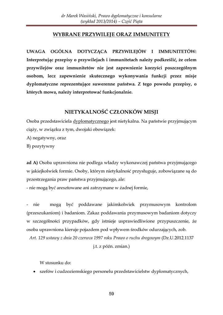 dr Marek Wasiński, Prawo dyplomatyczne i konsularne (wykład 2013/2014) – Część Piąta WYBRANE PRZYWILEJE ORAZ IMMUNITETY UWAGA OGÓLNA DOTYCZĄCA PRZYWILEJÓW I IMMUNITETÓW: Interpretując przepisy o przywilejach i immunitetach należy podkreślić, że celem przywilejów oraz immunitetów nie jest zapewnienie korzyści poszczególnym osobom, lecz zapewnienie skutecznego wykonywania funkcji przez misje dyplomatyczne reprezentujące suwerenne państwa. Z tego powodu przepisy, o których mowa, należy interpretować funkcjonalnie. NIETYKALNOŚĆ CZŁONKÓW MISJI Osoba przedstawiciela dyplomatycznego jest nietykalna. Na państwie przyjmującym ciąży, w związku z tym, dwojaki obowiązek: A) negatywny, oraz B) pozytywny ad A) Osoba uprawniona nie podlega władzy wykonawczej państwa przyjmującego w jakiejkolwiek formie. Osoby, którym nietykalność przysługuje, zobowiązane są do przestrzegania praw państwa przyjmującego, ale: - nie mogą być aresztowane ani zatrzymane w żadnej formie, - nie mogą być poddawane jakimkolwiek przymusowym kontrolom (przeszukaniom) i badaniom. Zakaz poddawania przymusowym badaniom dotyczy w szczególności przypadków, gdy istnieje usprawiedliwione przypuszczenie, że osoba uprawniona kieruje pojazdem pod wpływem środków odurzających, zob. Art. 129 ustawy z dnia 20 czerwca 1997 roku Prawo o ruchu drogowym (Dz.U.2012.1137 j.t. z późn. zmian.) W stosunku do: szefów i cudzoziemskiego personelu przedstawicielstw dyplomatycznych, 59 dr Marek Wasiński, Prawo dyplomatyczne i konsularne (wykład 2013/2014) – Część Piąta szefów i cudzoziemskiego personelu urzędów konsularnych i misji specjalnych państw obcych oraz organizacji międzynarodowych, - którzy korzystają z przywilejów i immunitetów dyplomatycznych lub konsularnych na mocy ustaw, umów bądź powszechnie uznanych zwyczajów międzynarodowych, nie można: a) żądać poddania się badaniu w celu ustalenia zawartości w organizmie alkoholu lub środka działającego podobnie do alkoholu, nawet jeżeli zachodzi uzasadnione podejrzenie, że wskazana osoba mogła kierować pojazdem, b) wymagać poddania pojazdu znajdującego się na drodze sprawdzaniu jego: stanu technicznego, wyposażenia, ładunku, wymiarów, masy lub nacisku osi; c) odebrać im dokumentów stwierdzających uprawnienie do kierowania pojazdem lub jego używania. Wytyczne nr 1 Komendanta Głównego Policji z dnia 3 stycznia 2006 roku w sprawie postępowania policjantów wobec uczestników ruchu drogowego korzystających z immunitetów i przywilejów dyplomatycznych lub konsularnych oraz korzystających z immunitetów krajowych (fragmenty) (Dz.Urz.KGP.2006.4.17, z późn. sprost.) „§ 2 1. Stwierdzenie uprawnień osoby kontrolowanej do korzystania z immunitetu zakrajowego - następuje na podstawie legitymacji wydanej przez Ministra Spraw Zagranicznych, którą osoba ta ma obowiązek posiadać i okazać. §3 Każda interwencja podejmowana wobec osób korzystających z immunitetów lub przywilejów musi być przeprowadzana taktownie, ale stanowczo, z pełnym poszanowaniem przysługujących tym osobom praw. § 4. 1. Policjant ma prawo zatrzymać do kontroli każdy pojazd, również gdy jest on oznakowany tablicami dyplomatycznymi. 2. W każdym przypadku uzasadnionego podejrzenia popełnienia wykroczenia przez kierującego pojazdem wyposażonym w dyplomatyczne tablice 60 dr Marek Wasiński, Prawo dyplomatyczne i konsularne (wykład 2013/2014) – Część Piąta rejestracyjne policjant powinien zatrzymać pojazd i przeprowadzić kontrolę wymaganych dokumentów pojazdu oraz dokumentów osoby kierującej. 3. Jeżeli kierujący pojazdem, w przypadku określonym w ust. 2, jest osobą korzystającą z przywilejów i immunitetów dyplomatycznych lub konsularnych, policjant nie jest uprawniony do nałożenia grzywny w drodze mandatu karnego, skierowania sprawy do sądu jak również wpisania tej osoby do ewidencji kierowców naruszających przepisy ruchu drogowego. § 6. 1. Jeżeli istnieje uzasadnione podejrzenie, że kierujący pojazdem korzystający z immunitetu zakrajowego znajduje się w stanie nietrzeźwości lub w stanie po użyciu alkoholu albo środka działającego podobnie do alkoholu (np. wyczuwalna woń alkoholu z ust, trudności z zachowaniem równowagi po wyjściu z pojazdu, bełkotliwa mowa), policjant: 1) nie może żądać poddania się przez kierującego badaniu w celu ustalenia zawartości w organizmie alkoholu lub środka działającego podobnie do alkoholu, zwanego dalej „badaniem”; 2) jest obowiązany zaproponować kierującemu poddanie się badaniu; 3) uniemożliwia dalsze kierowanie pojazdem w razie odmowy poddania się badaniu lub w przypadku pozytywnego wyniku badania. 2. Uniemożliwienie kierowania, o którym mowa w ust. 1 pkt 3, powinno być połączone z nawiązaniem kontaktu z właściwym przedstawicielstwem dyplomatycznym lub konsularnym oraz przekazaniem pojazdu innej osobie wskazanej przez kontrolowanego i może nastąpić w szczególności przez: 1) zwrócenie się do kontrolowanego o powstrzymanie się od kierowania pojazdem; 2) zaproponowanie przekazania do depozytu kluczyków pojazdu, a w przypadku odmowy oraz gdy osoba kontrolowana znajduje się poza pojazdem, uniemożliwienie jej powrotu do pojazdu przez blokowanie dostępu do drzwi, w miarę możliwości bez naruszenia nietykalności tej osoby; 3) zablokowanie kontrolowanego pojazdu przy użyciu pojazdu (pojazdów) służbowego Policji lub blokady na koła. 61 dr Marek Wasiński, Prawo dyplomatyczne i konsularne (wykład 2013/2014) – Część Piąta 3. Uniemożliwienie kierowania, o którym mowa w ust. 1, powinno trwać do czasu przekazania kierującego do dyspozycji szefa misji lub urzędu, lub otrzymania innych, wyraźnych dyspozycji przekazanych przez dyżurnego Ministerstwa Spraw Zagranicznych dyżurnemu komendy wojewódzkiej (Stołecznej) Policji. §7 Do pojazdu oznaczonego tablicami dyplomatycznymi nie należy wsiada