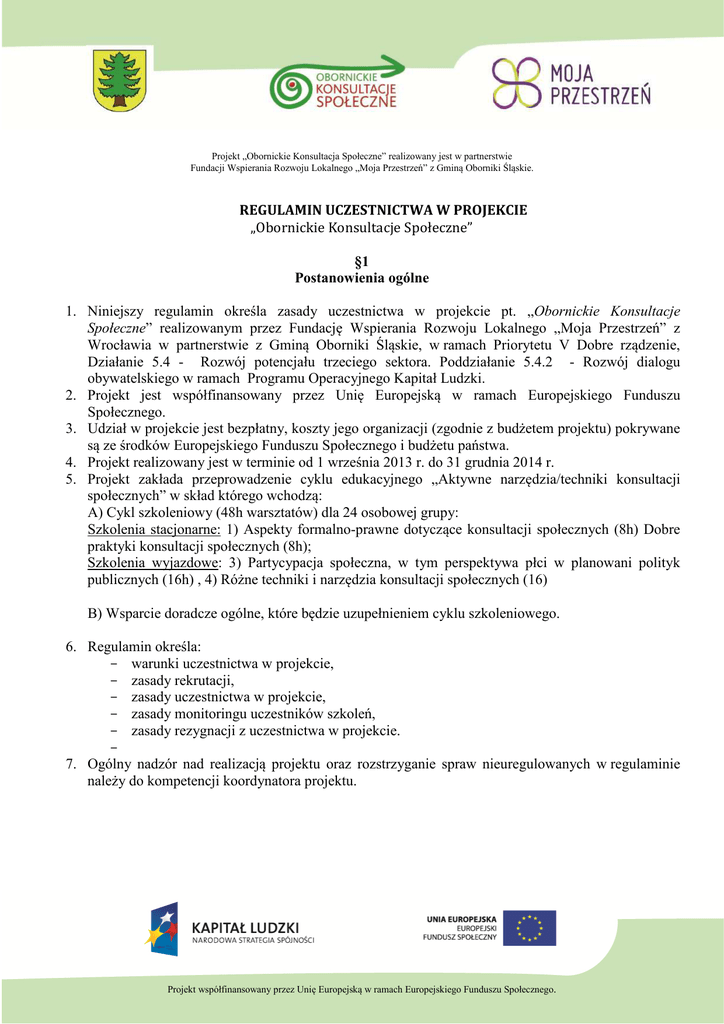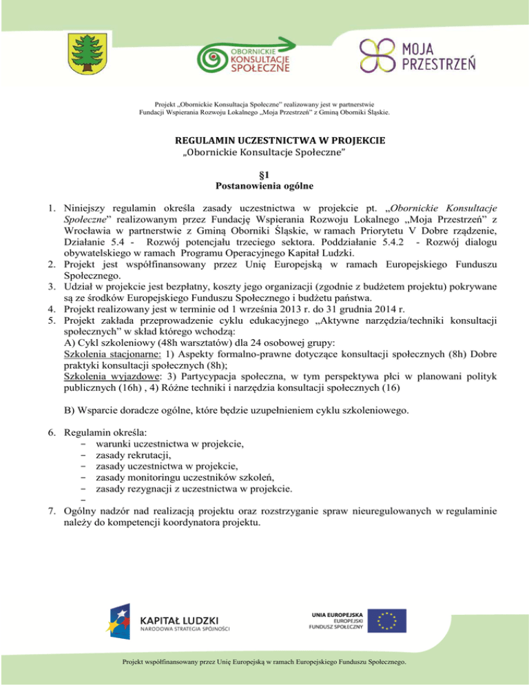 Projekt „Obornickie Konsultacja Społeczne” realizowany jest w partnerstwie Fundacji Wspierania Rozwoju Lokalnego „Moja Przestrzeń” z Gminą Oborniki Śląskie. REGULAMIN UCZESTNICTWA W PROJEKCIE „Obornickie Konsultacje Społeczne” §1 Postanowienia ogólne 1. Niniejszy regulamin określa zasady uczestnictwa w projekcie pt. „Obornickie Konsultacje Społeczne” realizowanym przez Fundację Wspierania Rozwoju Lokalnego „Moja Przestrzeń” z Wrocławia w partnerstwie z Gminą Oborniki Śląskie, w ramach Priorytetu V Dobre rządzenie, Działanie 5.4 - Rozwój potencjału trzeciego sektora. Poddziałanie 5.4.2 - Rozwój dialogu obywatelskiego w ramach Programu Operacyjnego Kapitał Ludzki. 2. Projekt jest współfinansowany przez Unię Europejską w ramach Europejskiego Funduszu Społecznego. 3. Udział w projekcie jest bezpłatny, koszty jego organizacji (zgodnie z budżetem projektu) pokrywane są ze środków Europejskiego Funduszu Społecznego i budżetu państwa. 4. Projekt realizowany jest w terminie od 1 września 2013 r. do 31 grudnia 2014 r. 5. Projekt zakłada przeprowadzenie cyklu edukacyjnego „Aktywne narzędzia/techniki konsultacji społecznych” w skład którego wchodzą: A) Cykl szkoleniowy (48h warsztatów) dla 24 osobowej grupy: Szkolenia stacjonarne: 1) Aspekty formalno-prawne dotyczące konsultacji społecznych (8h) Dobre praktyki konsultacji społecznych (8h); Szkolenia wyjazdowe: 3) Partycypacja społeczna, w tym perspektywa płci w planowani polityk publicznych (16h) , 4) Różne techniki i narzędzia konsultacji społecznych (16) B) Wsparcie doradcze ogólne, które będzie uzupełnieniem cyklu szkoleniowego. 6. Regulamin określa: - warunki uczestnictwa w projekcie, - zasady rekrutacji, - zasady uczestnictwa w projekcie, - zasady monitoringu uczestników szkoleń, - zasady rezygnacji z uczestnictwa w projekcie. 7. Ogólny nadzór nad realizacją projektu oraz rozstrzyganie spraw nieuregulowanych w regulaminie należy do kompetencji koordynatora projektu. Projekt współfinansowany przez Unię Europejską w ramach Europejskiego Funduszu Społecznego. Projekt „Obornickie Konsultacja Społeczne” realizowany jest w partnerstwie Fundacji Wspierania Rozwoju Lokalnego „Moja Przestrzeń” z Gminą Oborniki Śląskie. §2 Warunki uczestnictwa w projekcie 1. Projekt skierowany jest do osób spełniających łącznie poniższe warunki: - wiek 24-64 lata, - są osobami zamieszkującymi na obszarach wiejskich - Gminy Oborniki Śląskie - są osobami zatrudnionymi w administracji publicznej (tj. samorząd lokalny) lub są osobami zatrudnionymi w organizacjach pozarządowych (w tym członkowie stowarzyszeń, władze organizacji, wolontariusze) 2. Wykaz dokumentów niezbędnych do uczestnictwa w projekcie: a) Wypełnienie formularza zgłoszeniowego. b) Własnoręcznie podpisane oświadczenia potwierdzające spełnianie warunków uczestnictwa w projekcie. §3 Zasady rekrutacji 1. Postępowanie rekrutacyjne jest obligatoryjne dla osób deklarujących udział w projekcie. 2. Rekrutacja zostanie przeprowadzona zgodnie z polityką równych szans. 3. Rekrutację prowadzić będzie Komisja Kwalifikacyjna złożona z kierownika projektu i przedstawiciela Partnera projektu. . 4. Działania rekrutacyjne obejmują następujące etapy: - Etap I wypełnienie przez kandydata Formularza zgłoszeniowego i przekazanie go do biura partner: ul. Parkowa 9, 55-120 Oborniki Śląskie lub przesłanie na adres mailowy [email protected], do 14 października 2013 roku. - Etap II rozmowy indywidualne z zainteresowanymi, w oparciu o wypełniony formularz zgłoszeniowy i przeprowadzoną analizę zainteresowań, motywacji i wiedzy. - Etap III wyłonienie 24 uczestników/uczestniczek 5. Proces rekrutacji będzie trwał od 3 października do 22 października 2013 r. 6. Uczestnicy po zakwalifikowaniu ich przez Komisję Kwalifikacyjną, są zobowiązani do podpisania Deklaracji uczestnictwa w projekcie (dostępnej w Burze Projektu), co jest warunkiem niezbędnym zakwalifikowania się do udziału w projekcie. 7. Komisja Kwalifikacyjna utworzy listę rezerwową uczestników projektu, na której znajdą się osoby niezakwalifikowane do udziału z uwagi na brak miejsc. 8. Osoby z list rezerwowych zostaną włączone do uczestnictwa w projekcie w przypadku rezygnacji lub niedopełnienia warunków przez osoby wcześniej zakwalifikowane. 9. Decyzję o włączeniu do uczestnictwa w projekcie kandydatów z listy rezerwowej podejmuje koordynator projektu. Projekt współfinansowany przez Unię Europejską w ramach Europejskiego Funduszu Społecznego. Projekt „Obornickie Konsultacja Społeczne” realizowany jest w partnerstwie Fundacji Wspierania Rozwoju Lokalnego „Moja Przestrzeń” z Gminą Oborniki Śląskie. §5 Zasady uczestnictwa w projekcie 1. Uczestnik projektu zobowiązany jest do regularnego uczestnictwa w szkoleniach, spotkaniach doradczych potwierdzonych każdorazowo osobistym podpisem na liście obecności. 2. Uczestnik zobowiązuje się do uczestnictwa w co najmniej 80% zajęć. §6 Zasady monitoringu uczestników szkoleń 1. Uczestnik projektu zobowiązuje się do podpisania listy obecności oraz wypełniania ankiet monitorujących prowadzonych w ramach projektu. 2. Uczestnik projektu zobowiązuje się podać dane niezbędne organizatorom do wypełnienia kwestionariusza PEFS. 3. Uczestnik projektu ma prawo wpływać na profilowanie tematyki zajęć realizowanych w projekcie poprzez przekazywanie ustnie lub pisemnie informacji o proponowanych zmianach kierownikowi projektu, animatorom, trenerom odpowiedzialnym za poszczególne elementy w projekcie. 4. Uczestnik projektu akceptuje zasady ewaluacji projektu, co poświadcza osobiście podpisem na oświadczeniu o zgodzie na udostępnianie i przetwarzanie danych osobowych. 5. Uczestnik zobowiązuje się do wypełnienia ankiet do ewaluacji szkoleń przed szkoleniem, po jego zakończeniu oraz w terminie do 6 miesięcy od zakończenia u
