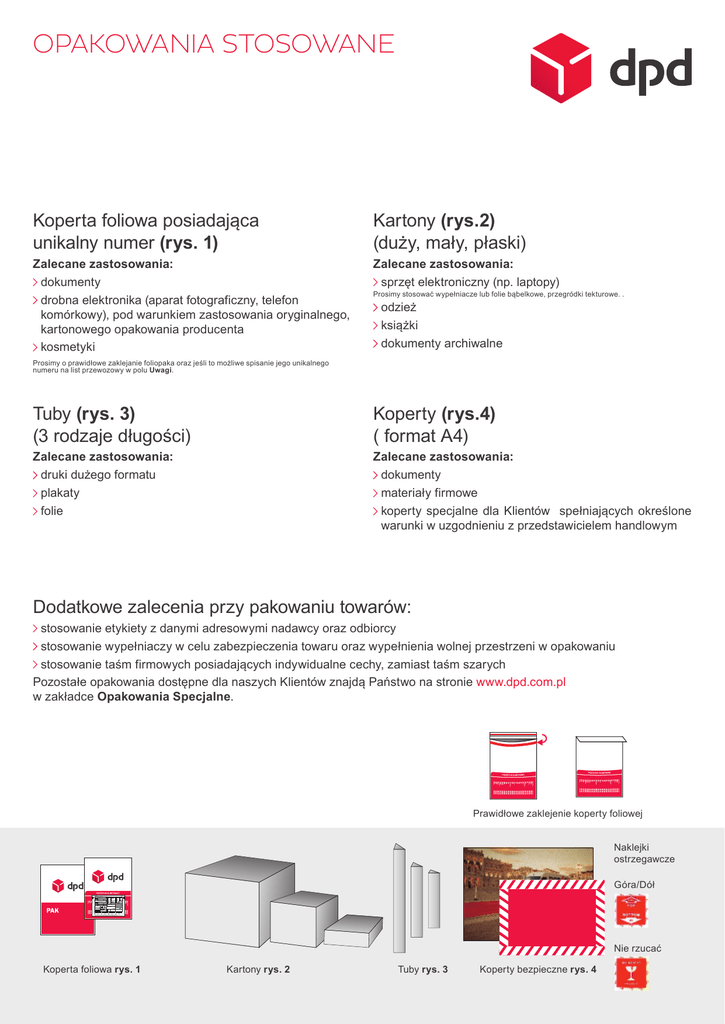 OPAKOWANIA STOSOWANE Koperta foliowa posiadająca unikalny numer (rys. 1) Zalecane zastosowania: d okumenty d robna elektronika (aparat fotograficzny, telefon komórkowy), pod warunkiem zastosowania oryginalnego, kartonowego opakowania producenta k osmetyki Kartony (rys.2) (duży, mały, płaski) Zalecane zastosowania: sprzęt elektroniczny (np. laptopy) Prosimy stosować wypełniacze lub folie bąbelkowe, przegródki tekturowe. . dzież o książki dokumenty archiwalne Prosimy o prawidłowe zaklejanie foliopaka oraz jeśli to możliwe spisanie jego unikalnego numeru na list przewozowy w polu Uwagi. Tuby (rys. 3) (3 rodzaje długości) Koperty (rys.4) ( format A4) Zalecane zastosowania: druki dużego formatu plakaty folie Zalecane zastosowania: dokumenty materiały firmowe koperty specjalne dla Klientów spełniających określone warunki w uzgodnieniu z przedstawicielem handlowym Dodatkowe zalecenia przy pakowaniu towarów: s tosowanie etykiety z danymi adresowymi nadawcy oraz odbiorcy stosowanie wypełniaczy w celu zabezpieczenia towaru oraz wypełnienia wolnej przestrzeni w opakowaniu stosowanie taśm firmowych posiadających indywidualne cechy, zamiast taśm szarych Pozostałe opakowania dostępne dla naszych Klientów znajdą Państwo na stronie www.dpd.com.pl w zakładce Opakowania Specjalne. Prawidłowe zaklejenie koperty foliowej Naklejki ostrzegawcze Góra/Dół Nie rzucać Koperta foliowa rys. 1 Kartony rys. 2 Tuby rys. 3 Koperty bezpieczne rys. 4