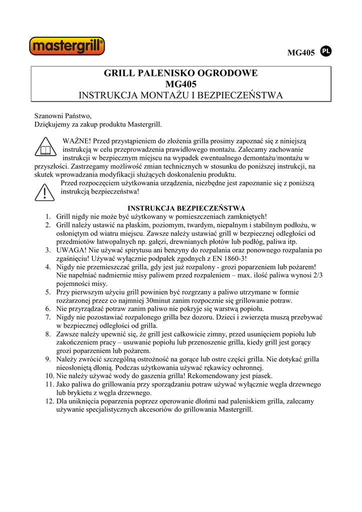 MG405 GRILL PALENISKO OGRODOWE MG405 INSTRUKCJA MONTAśU I BEZPIECZEŃSTWA Szanowni Państwo, Dziękujemy za zakup produktu Mastergrill. WAśNE! Przed przystąpieniem do złoŜenia grilla prosimy zapoznać się z niniejszą instrukcją w celu przeprowadzenia prawidłowego montaŜu. Zalecamy zachowanie instrukcji w bezpiecznym miejscu na wypadek ewentualnego demontaŜu/montaŜu w przyszłości. Zastrzegamy moŜliwość zmian technicznych w stosunku do poniŜszej instrukcji, na skutek wprowadzania modyfikacji słuŜących doskonaleniu produktu. Przed rozpoczęciem uŜytkowania urządzenia, niezbędne jest zapoznanie się z poniŜszą instrukcją bezpieczeństwa! INSTRUKCJA BEZPIECZEŃSTWA 1. Grill nigdy nie moŜe być uŜytkowany w pomieszczeniach zamkniętych! 2. Grill naleŜy ustawić na płaskim, poziomym, twardym, niepalnym i stabilnym podłoŜu, w osłoniętym od wiatru miejscu. Zawsze naleŜy ustawiać grill w bezpiecznej odległości od przedmiotów łatwopalnych np. gałęzi, drewnianych płotów lub podłóg, paliwa itp. 3. UWAGA! Nie uŜywać spirytusu ani benzyny do rozpalania oraz ponownego rozpalania po zgaśnięciu! UŜywać wyłącznie podpałek zgodnych z EN 1860-3! 4. Nigdy nie przemieszczać grilla, gdy jest juŜ rozpalony - grozi poparzeniem lub poŜarem! Nie napełniać nadmiernie misy paliwem przed rozpaleniem – max. ilość paliwa wynosi 2/3 pojemności misy. 5. Przy pierwszym uŜyciu grill powinien być rozgrzany a paliwo utrzymane w formie rozŜarzonej przez co najmniej 30minut zanim rozpocznie się grillowanie potraw. 6. Nie przyrządzać potraw zanim paliwo nie pokryje się warstwą popiołu. 7. Nigdy nie pozostawiać rozpalonego grilla bez dozoru. Dzieci i zwierzęta muszą przebywać w bezpiecznej odległości od grilla. 8. Zawsze naleŜy upewnić się, Ŝe grill jest całkowicie zimny, przed usunięciem popiołu lub zakończeniem pracy – usuwanie popiołu lub przenoszenie grilla, kiedy grill jest gorący grozi poparzeniem lub poŜarem. 9. NaleŜy zwrócić szczególną ostroŜność na gorące lub ostre części grilla. Nie dotykać grilla nieosłoniętą dłonią. Podczas uŜytkowania uŜywać rękawicy ochronnej. 10. Nie naleŜy uŜywać wody do gaszenia grilla! Rekomendowany jest piasek. 11. Jako paliwa do grillowania przy sporządzaniu potraw uŜywać wyłącznie węgla drzewnego lub brykietu z węgla drzewnego. 12. Dla uniknięcia poparzenia poprzez operowanie dłońmi nad paleniskiem grilla, zalecamy uŜywanie specjalistycznych akcesoriów do grillowania Mastergrill. INSTRUKCJA MONTAśU I UśYTKOWANIA 1 2 3 A 4 B 5 Elementy składowe i montaŜowe: 1. AŜurowa pokrywa- 1szt 2. Misa- 1szt 3. Górna duŜa obręcz podstawy- 1szt 4. Dolna mała obręcz podstawy- 1szt 5. Nogi- 4szt 6. Ramię- 1szt A. Śruba i nakrętka M6x10mm- 8kpl B. Śruba i nakrętka M6x16mm- 4kpl C. Nakrętka mocująca ramię- 1szt 6 I. Schemat budowy urządzenia II. MontaŜ Prosimy rozpakować urządzenie z opakowania i zidentyfikować poszczególne części. Dokonać montaŜu zgodnie ze schematem i poniŜszą instrukcją. Zalecamy, aby montaŜ był dokonany na utwardzonym, suchym podłoŜu dla uniknięcia zagubienia elementów. Do montaŜu naleŜy uŜyć stosownych narzędzi: śrubokręta oraz kluczy (niezałączone). Upewnić się, czy wszystkie śruby i nakrętki są poprawnie dokręcone! 1. Zamocuj nogi (5) do górnej, szerszej obręczy za pomocą kompletu śrub (A) oraz dolnej, węŜszej obręczy za pomocą kompletu śrub (B). 2. WłóŜ mocowanie ramienia (6) do otworu w górnej części pokrywy (1) a następnie dokręć za pomocą nakrętki (C). 3. NałóŜ misę (2) na uprzednio zmontowaną podstawę (2, 4, 5). 4. NałóŜ pokrywę (1) na misę (2). III. UŜytkowanie UWAGA! Przed przystąpieniem do uŜytkowania grilla naleŜy bezwzględnie zapoznać się z Instrukcją bezpieczeństwa. Podczas uŜytkowania zachować szczególną ostroŜność! UŜywanie środków łatwopalnych nie przeznaczonych do stosowania w grillowaniu moŜe spowodować poparzenia, powstanie poŜaru, zatrucie przyrządzanych potraw bądź zniszczenie powierzchni metalowych! Przed grillowaniem upewnić się czy ruszt oraz misa są czyste i nie wymagają oczyszczenia a urządzenie jest stabilne i nie wykazuje śladów: uszkodzeń mechanicznych, przepalenia paleniska bądź nie posiada ostrych części konstrukcji. 2 Ustawić grill na płaskim, niepalnym podłoŜu, na zewnątrz budynku. Na misie ułoŜyć węgiel drzewny lub brykiet w ilości nieprzekraczającej 2/3 objętości misy. Następnie rozpalić ogień, czekając aŜ węgiel pokryje się warstwą szarego popiołu. Nie chwytać grilla nieosłoniętą dłonią, aby uniknąć poparzenia! IV. Przechowywanie Po skończonej pracy naleŜy upewnić się, czy grill jest zimny. Do dogaszania nie uŜywać wody! Następnie usunąć popiół z misy, oczyścić i umyć ruszt. Grill przechowywać w czystym i niezawilgoconym pomieszczeniu. Nie obciąŜać nadmiernie grilla, aby nie spowodować uszkodzenia nóŜek! V. Postępowanie reklamacyjne Zgłoszenia reklamacyjne z tytułu niezgodności towaru z umową sprzedaŜy powinny być dokonane w miejscu zakupu urządzenia. Prosimy o zwrócenie uwagi, iŜ nie odpowiadamy za uszkodzenia spowodowane niewłaściwym uŜytkowaniem zgodnie z powyŜszą instrukcja obsługi lub uŜytkowaniem niezgodnym z przeznaczeniem produktu. W przypadku reklamowania w/w produktu nabywca zobowiązany jest dostarczyć produkt kompletny i w opakowaniu umoŜliwiającym bezpieczny transport. Artykuły zabrudzone nie będą przyjmowane do naprawy. Floraland Distribution Sp. z o.o. ul. StruŜańska 28, Stanisławów Pierwszy, 05-126 Nieporęt, Poland www.floraland.pl 3