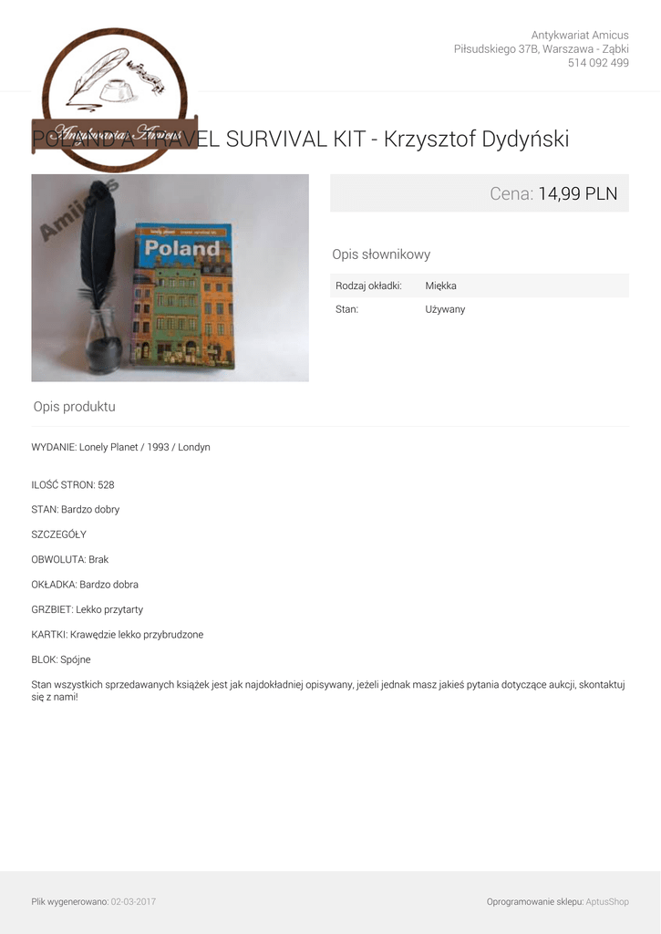 Antykwariat Amicus Piłsudskiego 37B, Warszawa - Ząbki 514 092 499 POLAND A TRAVEL SURVIVAL KIT - Krzysztof Dydyński Cena: 14,99 PLN Opis słownikowy Rodzaj okładki: Miękka Stan: Używany Opis produktu WYDANIE: Lonely Planet / 1993 / Londyn ILOŚĆ STRON: 528 STAN: Bardzo dobry SZCZEGÓŁY OBWOLUTA: Brak OKŁADKA: Bardzo dobra GRZBIET: Lekko przytarty KARTKI: Krawędzie lekko przybrudzone BLOK: Spójne Stan wszystkich sprzedawanych książek jest jak najdokładniej opisywany, jeżeli jednak masz jakieś pytania dotyczące aukcji, skontaktuj się z nami! Plik wygenerowano: 02-03-2017 Oprogramowanie sklepu: AptusShop Antykwariat Amicus Piłsudskiego 37B, Warszawa - Ząbki 514 092 499 Galeria Plik wygenerowano: 02-03-2017 Powered by TCPDF (www.tcpdf.org) Oprogramowanie sklepu: AptusShop