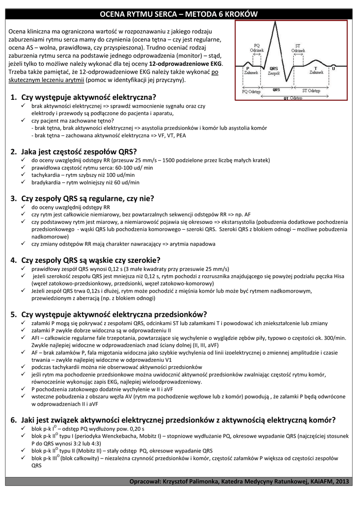 OCENA RYTMU SERCA – METODA 6 KROKÓW Ocena kliniczna ma ograniczona wartość w rozpoznawaniu z jakiego rodzaju zaburzeniami rytmu serca mamy do czynienia (ocena tętna – czy jest regularne, ocena AS – wolna, prawidłowa, czy przyspieszona). Trudno oceniać rodzaj zaburzenia rytmu serca na podstawie jednego odprowadzenia (monitor) – stąd, jeżeli tylko to możliwe należy wykonać dla tej oceny 12-odprowadzeniowe EKG. Trzeba także pamiętać, że 12-odprowadzeniowe EKG należy także wykonać po skutecznym leczeniu arytmii (pomoc w identyfikacji jej przyczyny). 1. Czy występuje aktywność elektryczna? brak aktywności elektrycznej => sprawdź wzmocnienie sygnału oraz czy elektrody i przewody są podłączone do pacjenta i aparatu, czy pacjent ma zachowane tętno? - brak tętna, brak aktywności elektrycznej => asystolia przedsionków i komór lub asystolia komór - brak tętna – zachowana aktywność elektryczna => VF, VT, PEA 2. Jaka jest częstość zespołów QRS? do oceny uwzględnij odstępy RR (przesuw 25 mm/s – 1500 podzielone przez liczbę małych kratek) prawidłowa częstość rytmu serca: 60-100 ud/ min tachykardia – rytm szybszy niż 100 ud/min bradykardia – rytm wolniejszy niż 60 ud/min 3. Czy zespoły QRS są regularne, czy nie? do oceny uwzględnij odstępy RR czy rytm jest całkowicie niemiarowy, bez powtarzalnych sekwencji odstępów RR => np. AF czy podstawowy rytm jest miarowy, a niemiarowość pojawia się okresowo => ekstarsystolia (pobudzenia dodatkowe pochodzenia przedsionkowego - wąski QRS lub pochodzenia komorowego – szeroki QRS. Szeroki QRS z blokiem odnogi – możliwe pobudzenia nadkomorowe) czy zmiany odstępów RR mają charakter nawracający => arytmia napadowa 4. Czy zespoły QRS są wąskie czy szerokie? prawidłowy zespół QRS wynosi 0,12 s (3 małe kwadraty przy przesuwie 25 mm/s) jeżeli szerokość zespołu QRS jest mniejsza niż 0,12 s, rytm pochodzi z rozrusznika znajdującego się powyżej podziału pęczka Hisa (węzeł zatokowo-przedsionkowy, przedsionki, węzeł zatokowo-komorowy) Jeżeli zespół QRS trwa 0,12s i dłużej, rytm może pochodzić z mięśnia komór lub może być rytmem nadkomorowym, przewiedzionym z aberracją (np. z blokiem odnogi) 5. Czy występuje aktywność elektryczna przedsionków? załamki P mogą się pokrywać z zespołami QRS, odcinkami ST lub załamkami T i powodować ich zniekształcenie lub zmiany załamki P zwykle dobrze widoczna są w odprowadzeniu II AFI – całkowicie regularne fale trzepotania, powtarzające się wychylenie o wyglądzie zębów piły, typowo o częstości ok. 300/min. Zwykle najlepiej widoczne w odprowadzeniach znad ściany dolnej (II, III, aVF) AF – brak załamków P, fala migotania widoczna jako szybkie wychylenia od linii izoelektrycznej o zmiennej amplitudzie i czasie trwania – zwykle najlepiej widoczne w odprowadzeniu V1 podczas tachykardii można nie obserwować aktywności przedsionków jeśli rytm ma pochodzenie przedsionkowe można uwidocznić aktywność przedsionków zwalniając częstość rytmu komór, równocześnie wykonując zapis EKG, najlepiej wieloodprowadzeniowy. P pochodzenia zatokowego dodatnie wychylenie w II i aVF wsteczne pobudzenia z obszaru węzła AV (rytm ma pochodzenie węzłowe lub z komór) powodują , że załamki P będą odwrócone w odprowadzeniach II i aVF 6. Jaki jest związek aktywności elektrycznej przedsionków z aktywnością elektryczną komór? O blok p-k I – odstęp PQ wydłużony pow. 0,20 s O blok p-k II typu I (periodyka Wenckebacha, Mobitz I) – stopniowe wydłużanie PQ, okresowe wypadanie QRS (najczęściej stosunek P do QRS wynosi 3:2 lub 4:3) O blok p-k II typu II (Mobitz II) – stały odstęp PQ, okresowe wypadanie QRS O blok p-k III (blok całkowity) – niezależna czynność przedsionków i komór, częstość załamków P większa od częstości zespołów QRS Opracował: Krzysztof Palimonka, Katedra Medycyny Ratunkowej, KAiAFM, 2013