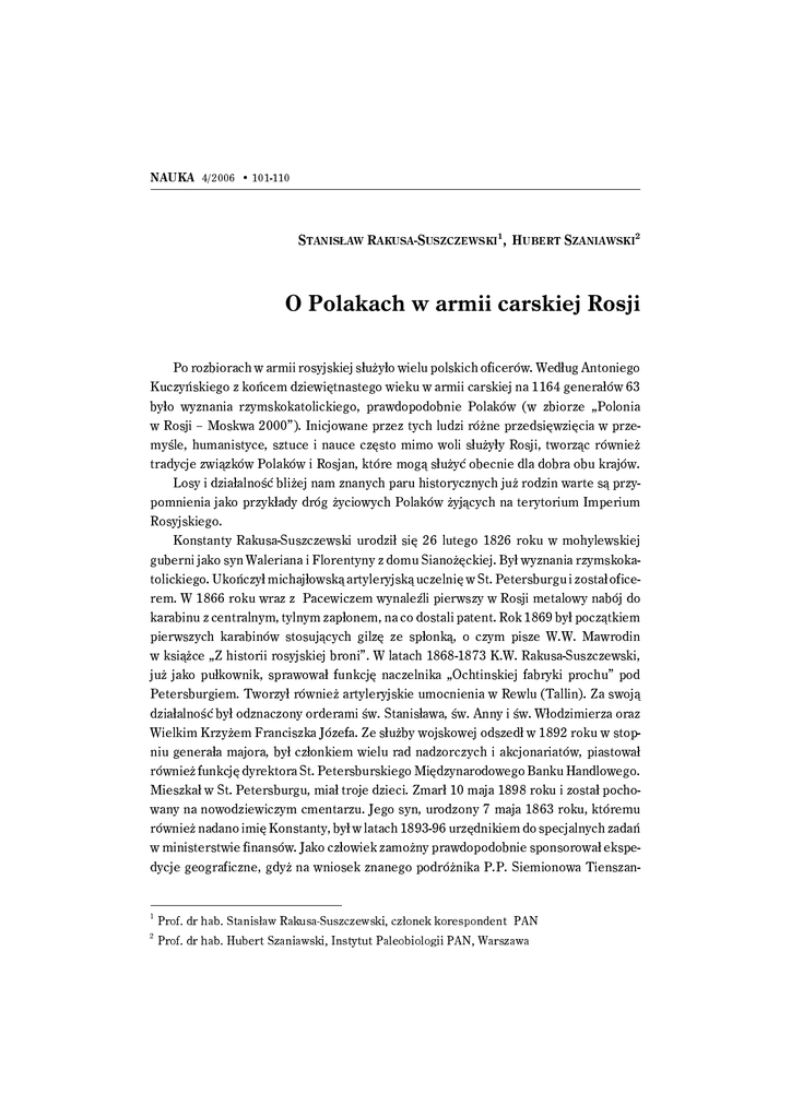 NAUKA 4/2006 • 101-110 TANISŁAW RAKUSA-SUSZCZEWSKI1, S UBERT SZANIAWSKI2 H O Polakach w armii carskiej Rosji Po rozbiorach w armii rosyjskiej służyło wielu polskich oficerów. Według Antoniego Kuczyńskiego z końcem dziewiętnastego wieku w armii carskiej na 1164 generałów 63 było wyznania rzymskokatolickiego, prawdopodobnie Polaków (w zbiorze „Polonia w Rosji – Moskwa 2000”). Inicjowane przez tych ludzi różne przedsięwzięcia w przemyśle, humanistyce, sztuce i nauce często mimo woli służyły Rosji, tworząc również tradycje związków Polaków i Rosjan, które mogą służyć obecnie dla dobra obu krajów. Losy i działalność bliżej nam znanych paru historycznych już rodzin warte są przypomnienia jako przykłady dróg życiowych Polaków żyjących na terytorium Imperium Rosyjskiego. Konstanty Rakusa-Suszczewski urodził się 26 lutego 1826 roku w mohylewskiej guberni jako syn Waleriana i Florentyny z domu Sianożęckiej. Był wyznania rzymskokatolickiego. Ukończył michajłowską artyleryjską uczelnię w St. Petersburgu i został oficerem. W 1866 roku wraz z Pacewiczem wynaleźli pierwszy w Rosji metalowy nabój do karabinu z centralnym, tylnym zapłonem, na co dostali patent. Rok 1869 był początkiem pierwszych karabinów stosujących gilzę ze spłonką, o czym pisze W.W. Mawrodin w książce „Z historii rosyjskiej broni”. W latach 1868-1873 K.W. Rakusa-Suszczewski, już jako pułkownik, sprawował funkcję naczelnika „Ochtinskiej fabryki prochu” pod Petersburgiem. Tworzył również artyleryjskie umocnienia w Rewlu (Tallin). Za swoją działalność był odznaczony orderami św. Stanisława, św. Anny i św. Włodzimierza oraz Wielkim Krzyżem Franciszka Józefa. Ze służby wojskowej odszedł w 1892 roku w stopniu generała majora, był członkiem wielu rad nadzorczych i akcjonariatów, piastował również funkcję dyrektora St. Petersburskiego Międzynarodowego Banku Handlowego. Mieszkał w St. Petersburgu, miał troje dzieci. Zmarł 10 maja 1898 roku i został pochowany na nowodziewiczym cmentarzu. Jego syn, urodzony 7 maja 1863 roku, któremu również nadano imię Konstanty, był w latach 1893-96 urzędnikiem do specjalnych zadań w ministerstwie finansów. Jako człowiek zamożny prawdopodobnie sponsorował ekspedycje geograficzne, gdyż na wniosek znanego podróżnika P.P. Siemionowa Tienszan1 2 Prof. dr hab. Stanisław Rakusa-Suszczewski, członek korespondent PAN Prof. dr hab. Hubert Szaniawski, Instytut Paleobiologii PAN, Warszawa 102 Stanisław Rakusa-Suszczewski, Hubert Szaniawski skiego został członkiem Imperatorskiego Rosyjskiego Geograficznego Towarzystwa w Petersburgu. Konstanty Konstantynowicz pełnił wiele eksponowanych funkcji w przemyśle zbrojeniowym i bankowości, co ułatwiała mu pozycja ojca. W roku 1900 Konstanty był chrzestnym mojego (S. R-S.) ojca urodzonego na Białorusi. W latach 1914-1917 pełnił funkcję dyrektora rosyjskiego przedsiębiorstwa zaopatrzenia wojskowego i fabryki gilz i rur im. Włodzimierza Baranowskiego oraz dyrektora rosyjsko-bałtyckiego akcjonariatu stoczni newskiej. O nim rosyjski generał A.A. Ignatiev, który przeszedł po rewolucji na stronę sowietów, wspomina w swoich pamiętnikach („50-lat w mundurze”– tłum. polskie Warszawa 1958). „Spotykałem tego polskiego Pana na występach baletu w teatrze Maryjnym, spasionego na artyleryjskich interesach, przedstawiciela francuskiej firmy zbrojeniowej Schneider i Crezou”. Konstanty K. Rakusa-Suszczewski był wraz A.P. Mellerem absolwentem michajłowskiej artyleryjskiej uczelni, a później założycielem w Petersburgu towarzystwa akcyjnego produkcji optyczno-mechanicznej i fabryki, na której powstanie wyłożył 1,2 miliona rubli. Fabryka ta znana jest współcześnie pod nazwą LOMO. Produkuje lasery, urządzenia satelitarne, teleskopy i wiele innych urządzeń. Zatrudnia 29 tys. pracowników i posiada muzeum eksponujące pamiątki sięgające czasów jej założenia (byłem tam w 2005 roku i przyjmowano mnie jako „spadkobiercę” nazwiska). Przedsięwzięcia te wchodziły w strefę wpływów rosyjsko-azjatyckiego banku z kapitałem francuskim. K.K. Rakusa-Suszczewski bywał we Francji i odwiedzał swoją znajomą Matyldę Krzesińską, znakomitą baletnicę, o czym wspomina ona w pamiętnikach. Po rewolucji sowieckiej Konstanty wyjechał z Rosji, mieszkał w Paryżu, zmarł około 1942 roku. Andrzej Hipolitowicz Wilkicki pochodził ze szlachty guberni mińskiej. Urodzony w 1858 roku, ukończył Mikołajewską Akademię Morską w St. Petersburgu ze specjalnością hydrografa geodety. W tym samym czasie kończył ją i mój (S. R-S.) dziad. W latach 1882-85 Andrzej Wilkicki prowadził prace hydrograficzne na Bałtyku, Morzu Białym i jeziorze Onega. Dwa lata później kierował pierwszą rosyjską ekspedycją hydrograficzną do Arktyki i na Nową Ziemię. Imperatorskie Rosyjskie Geograficzne Towarzystwo wysoko oceniło wyniki jego prac, nagradzając dwoma złotymi medalami. W latach 1894-96 Andrzej Wilkicki ponownie prowadził ekspedycję w Arktyce, badając rejon wybrzeży od Peczory do ujścia Jeniseju. Wytyczył nowe szlaki nawigacyjne i poprawił stare. Dwa lata później pracował na Morzu Karskim, wykonując mapy batymetryczne, prowadząc obserwacje oceanologiczne i meteorologiczne. Od roku 1907 był kierownikiem hydrografii w Ministerstwie Morskim. Dbał o znaki nawigacyjne, latarnie morskie, locje, produkcję narzędzi nawigacyjnych i nowych map. Występował również z inicjatywą budowy przez rosyjsko-bałtycki akcjonariat i newską stocznię w St. Petersburgu dwóch statków lodołamaczy. Wiosną 1909 roku „Taimyr” i Wajgacz” zostały spuszczone na wodę. Zasługi Andrzeja Hipolitowicza Wilkickiego upamiętniają nazwy O Polakach w armii carskiej Rosji 103 geograficzne jego imienia na morzach Barentsa i Bialym i na Nowej Ziemi. Zmarł w 1913 roku. Pochowany został w St. Petersburgu. Borys, syn Andrzeja, 