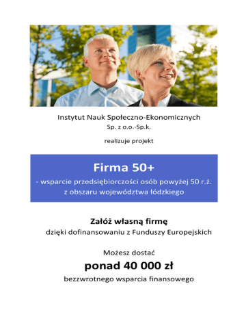 Instytut Nauk Społeczno-Ekonomicznych Sp. z o.o.-Sp.k. realizuje projekt Firma 50+ - wsparcie przedsiębiorczości osób powyżej 50 r.ż. z obszaru województwa łódzkiego Załóż własną firmę dzięki dofinansowaniu z Funduszy Europejskich Możesz dostać ponad 40 000 zł bezzwrotnego wsparcia finansowego Cel główny projektu Założenie trwałych firm na terenie województwa łódzkiego przez 99 ze 110 uczestników i uczestniczek projektu (61 kobiet i 49 mężczyzn). Okres realizacji projektu 01 września 2016 r. – 30 kwietnia 2018 r. Kto może wziąć udział w projekcie? Osoba, która: ukończyła 50 lat, zamieszkuje w województwie łódzkim (projekt skierowany do osób z woj. łódzkiego, a w szczególności z powiatów: brzezińskiego, kutnowskiego, łaskiego, łęczyckiego, poddębickiego, tomaszowskiego, radomszczańskiego, zduńskowolskiego oraz łódzkiego wschodniego, pabianickiego, zgierskiego, bełchatowskiego, łowickiego, opoczyńskiego, piotrkowskiego, pajęczańskiego, sieradzkiego, wieluńskiego, wieruszowskiego, rawskiego, skierniewickiego), jest bezrobotna, poszukująca pracy pozostająca bez zatrudnienia lub bierna zawodowo, chce założyć działalność gospodarczą na terenie województwa łódzkiego i prowadzić ją przez co najmniej 12 miesięcy. Sprawdź szczegóły na stronie www.dotacje.inse.pl. Kiedy można zgłaszać się do projektu? Nabór formularzy rekrutacyjnych już trwa, szczegóły: www.dotacje.inse.pl Jakim wsparciem zostanie objęty uczestnik projektu? 100% uczestników projektu weźmie udział w: warsztatach z podstaw prowadzenia działalności gospodarczej oraz grze symulacyjnej, warsztatach i doradztwie indywidualnym z opracowania biznesplanu. Dodatkowe korzyści dla uczestników: obiad i przerwa kawowa, dofinansowanie kosztów dojazdu. 90% uczestników projektu otrzyma: bezzwrotną dotację na rozpoczęcie działalności gospodarczej w wysokości do 22 700,76 zł, finansowe wsparcie pomostowe w wysokości do 1 750 zł przez okres od 6 do 12 miesięcy, doradcze wsparcie pomostowe: doradztwo grupowe i wsparcie mentora. Szczegóły rekrutacji dostępne: na stronie internetowej: www.dotacje.inse.pl pod numerem telefonu: 42 633 17 19 pod adresem e-mail: [email protected] w siedzibie biura projektu w godz. 10-15 Wejdź na stronę www.dotacje.inse.pl i pobierz formularz rekrutacyjny Biuro projektu: Instytut Nauk Społeczno-Ekonomicznych Sp. z o.o. – Sp. k. ul. Piotrkowska 55 lok. 111 90-413 Łódź prawa oficyna, I piętro Więcej informacji o projekcie: na stronie: www.dotacje.inse.pl pod nr tel.: 42 633 17 19 pod adresem e-mail: [email protected] Projekt Firma 50+ wsparcie przedsiębiorczości osób powyżej 50 r.ż. z obszaru województwa łódzkiego jest współfinansowany ze środków Unii Europejskiej w ramach Europejskiego Funduszu Społecznego, Regionalny Program Operacyjny Województwa Łódzkiego, Oś priorytetowa VIII Zatrudnienie, Działanie VIII.3 Wsparcie przedsiębiorczości, Poddziałanie VIII.3.1 Wsparcie przedsiębiorczości w formach bezzwrotnych. Dofinansowanie projektu: 4 649 856,44 zł.