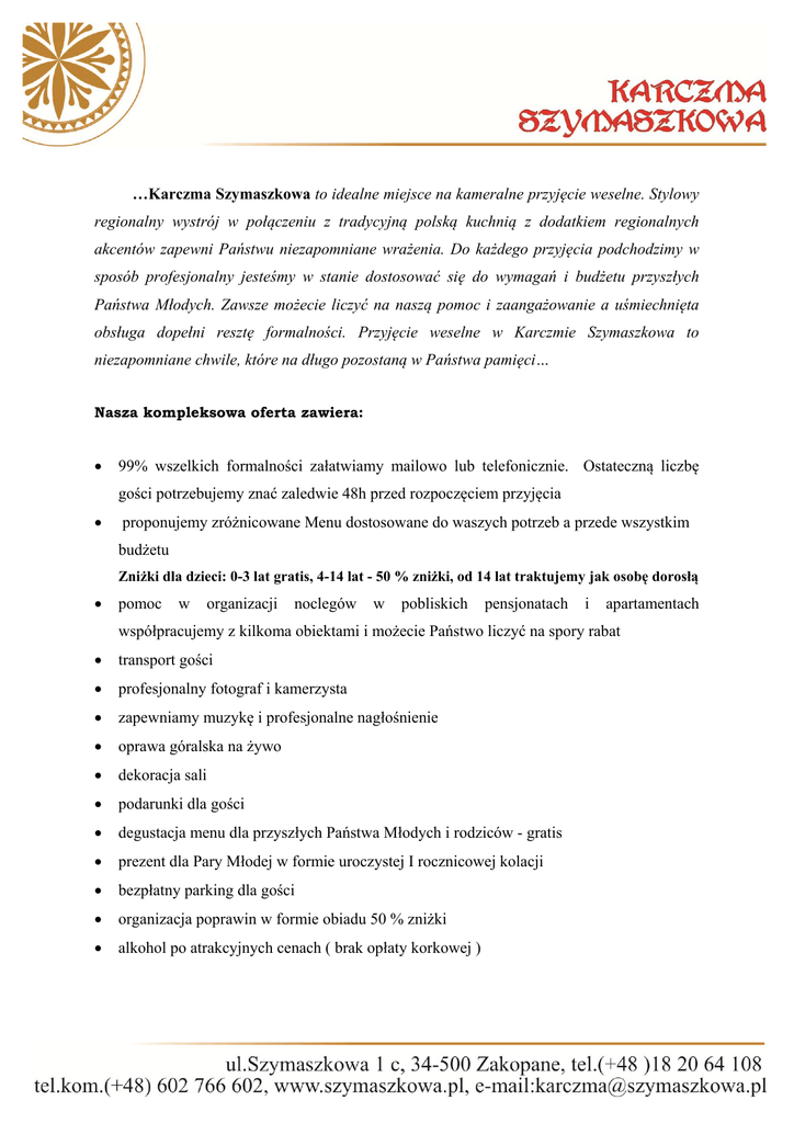 …Karczma Szymaszkowa to idealne miejsce na kameralne przyjęcie weselne. Stylowy regionalny wystrój w połączeniu z tradycyjną polską kuchnią z dodatkiem regionalnych akcentów zapewni Państwu niezapomniane wrażenia. Do każdego przyjęcia podchodzimy w sposób profesjonalny jesteśmy w stanie dostosować się do wymagań i budżetu przyszłych Państwa Młodych. Zawsze możecie liczyć na naszą pomoc i zaangażowanie a uśmiechnięta obsługa dopełni resztę formalności. Przyjęcie weselne w Karczmie Szymaszkowa to niezapomniane chwile, które na długo pozostaną w Państwa pamięci… Nasza kompleksowa oferta zawiera: 99% wszelkich formalności załatwiamy mailowo lub telefonicznie. Ostateczną liczbę gości potrzebujemy znać zaledwie 48h przed rozpoczęciem przyjęcia proponujemy zróżnicowane Menu dostosowane do waszych potrzeb a przede wszystkim budżetu Zniżki dla dzieci: 0-3 lat gratis, 4-14 lat - 50 % zniżki, od 14 lat traktujemy jak osobę dorosłą pomoc w organizacji noclegów w pobliskich pensjonatach i apartamentach współpracujemy z kilkoma obiektami i możecie Państwo liczyć na spory rabat transport gości profesjonalny fotograf i kamerzysta zapewniamy muzykę i profesjonalne nagłośnienie oprawa góralska na żywo dekoracja sali podarunki dla gości degustacja menu dla przyszłych Państwa Młodych i rodziców - gratis prezent dla Pary Młodej w formie uroczystej I rocznicowej kolacji bezpłatny parking dla gości organizacja poprawin w formie obiadu 50 % zniżki alkohol po atrakcyjnych cenach ( brak opłaty korkowej ) Przykładowe Menu Powitanie chlebem i solą Uroczysty toast z winem musującym Kolacja Weselna cz. I Zakąska Oscypek z grilla z żurawiną Zupa Tradycyjny staropolski rosół z domowym makaronem Danie główne Filet z kurczaka po gazdowsku z zapiekanym boczkiem i oscypkiem oraz polędwiczki wieprzowe w sosie z borowików z dodatkiem opiekanych ziemniaków i zestawu surówek Deser Sernik królewski z sosem z malin Kolacja Weselna cz. II ( godz. 19:00) Góralska peklowana szynka w ziołowej marynacie serwowana przez Szefa Kuchni z dodatkiem sosu chrzanowego i żurawiny Kolacja Weselna cz. IV ( godz. 21:00) Uroczyste krojenie tortu weselnego Kolacja Weselna cz. III( godz. 23:00) Zapiekana micha pierogów ruskich smażonych na wiejskim maśle Kolacja Weselna cz. V ( godz. 01:00) Szaszłyk zakopiański z boczkiem papryką i cebulą serwowany z ziemniakami opiekanymi i zestawem surówek Kolacja Weselna cz. VI ( godz. 03:00) Kociołek tatrzański z domowymi kluseczkami z wiejskim pieczywem Pakiet napoi: kawa, herbata, woda, soki, napoje gazowane ( w ilości nieograniczonej ) Przez cały okres Wesela będziecie Państwo mogli korzystać z ,,Bufetu regionalnego zimnego” mięsa pieczone i wędliny (schab nadziewany, pieczony karczek, szynka, boczek, pasztet domowy, kiełbasa wiejska, kabanos) deska serów: żółtych, pleśniowych, regionalnych (oscypki, bunc, korbace) regionalne zakopiańskie moskole z masłem czosnkowym i bryndzą smalec ze skwarkami, chleb domowy , ogórki kiszone sosy (czosnkowy, barbecue, musztardowy) sałatka z kurczakiem w panierce, sałatka grecka z fetą i marynowanymi kurkami owoce oraz ciasta domowe ( szarlotka, sernik, piernik )