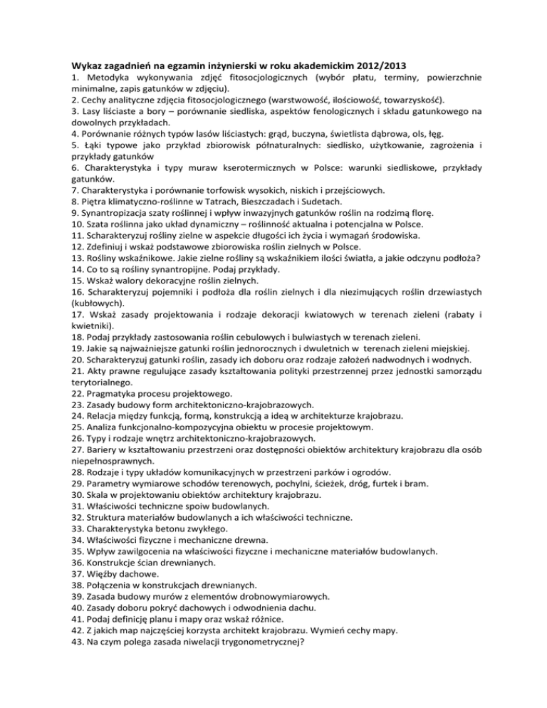 Wykaz zagadnień na egzamin inżynierski w roku akademickim 2012/2013 1. Metodyka wykonywania zdjęć fitosocjologicznych (wybór płatu, terminy, powierzchnie minimalne, zapis gatunków w zdjęciu). 2. Cechy analityczne zdjęcia fitosocjologicznego (warstwowość, ilościowość, towarzyskość). 3. Lasy liściaste a bory – porównanie siedliska, aspektów fenologicznych i składu gatunkowego na dowolnych przykładach. 4. Porównanie różnych typów lasów liściastych: grąd, buczyna, świetlista dąbrowa, ols, łęg. 5. Łąki typowe jako przykład zbiorowisk półnaturalnych: siedlisko, użytkowanie, zagrożenia i przykłady gatunków 6. Charakterystyka i typy muraw kserotermicznych w Polsce: warunki siedliskowe, przykłady gatunków. 7. Charakterystyka i porównanie torfowisk wysokich, niskich i przejściowych. 8. Piętra klimatyczno-roślinne w Tatrach, Bieszczadach i Sudetach. 9. Synantropizacja szaty roślinnej i wpływ inwazyjnych gatunków roślin na rodzimą florę. 10. Szata roślinna jako układ dynamiczny – roślinność aktualna i potencjalna w Polsce. 11. Scharakteryzuj rośliny zielne w aspekcie długości ich życia i wymagań środowiska. 12. Zdefiniuj i wskaż podstawowe zbiorowiska roślin zielnych w Polsce. 13. Rośliny wskaźnikowe. Jakie zielne rośliny są wskaźnikiem ilości światła, a jakie odczynu podłoża? 14. Co to są rośliny synantropijne. Podaj przykłady. 15. Wskaż walory dekoracyjne roślin zielnych. 16. Scharakteryzuj pojemniki i podłoża dla roślin zielnych i dla niezimujących roślin drzewiastych (kubłowych). 17. Wskaż zasady projektowania i rodzaje dekoracji kwiatowych w terenach zieleni (rabaty i kwietniki). 18. Podaj przykłady zastosowania roślin cebulowych i bulwiastych w terenach zieleni. 19. Jakie są najważniejsze gatunki roślin jednorocznych i dwuletnich w terenach zieleni miejskiej. 20. Scharakteryzuj gatunki roślin, zasady ich doboru oraz rodzaje założeń nadwodnych i wodnych. 21. Akty prawne regulujące zasady kształtowania polityki przestrzennej przez jednostki samorządu terytorialnego. 22. Pragmatyka procesu projektowego. 23. Zasady budowy form architektoniczno-krajobrazowych. 24. Relacja między funkcją, formą, konstrukcją a ideą w architekturze krajobrazu. 25. Analiza funkcjonalno-kompozycyjna obiektu w procesie projektowym. 26. Typy i rodzaje wnętrz architektoniczno-krajobrazowych. 27. Bariery w kształtowaniu przestrzeni oraz dostępności obiektów architektury krajobrazu dla osób niepełnosprawnych. 28. Rodzaje i typy układów komunikacyjnych w przestrzeni parków i ogrodów. 29. Parametry wymiarowe schodów terenowych, pochylni, ścieżek, dróg, furtek i bram. 30. Skala w projektowaniu obiektów architektury krajobrazu. 31. Właściwości techniczne spoiw budowlanych. 32. Struktura materiałów budowlanych a ich właściwości techniczne. 33. Charakterystyka betonu zwykłego. 34. Właściwości fizyczne i mechaniczne drewna. 35. Wpływ zawilgocenia na właściwości fizyczne i mechaniczne materiałów budowlanych. 36. Konstrukcje ścian drewnianych. 37. Więźby dachowe. 38. Połączenia w konstrukcjach drewnianych. 39. Zasada budowy murów z elementów drobnowymiarowych. 40. Zasady doboru pokryć dachowych i odwodnienia dachu. 41. Podaj definicję planu i mapy oraz wskaż różnice. 42. Z jakich map najczęściej korzysta architekt krajobrazu. Wymień cechy mapy. 43. Na czym polega zasada niwelacji trygonometrycznej? 44. Omów zasady pomiaru tachimetrycznego. 45. Wymień trzy podstawowe segmenty systemu GPS. 46. Wymień rodzime gatunki drzew i krzewów i określ ich rolę w terenach zieleni w ujęciu regionalnym . 47. Scharakteryzuj rolę drzew i krzewów iglastych w terenach zieleni publicznej i ogrodach przydomowych . 48. Wymień i scharakteryzuj podstawowe typy koron roślin drzewiastych – podaj przykłady wykorzystania w terenach zieleni. 49. Scharakteryzuj rolę i wymagania stawiane roślinom okrywowym. 50. Scharakteryzuj rolę pnączy we współczesnej architekturze krajobrazu. 51. Określ wymagania stawiane drzewom alejowym . Podaj podstawowe gatunki i ich odmiany. 52. Omów podział żywopłotów oraz funkcję jaką pełnią w terenach zieleni . 53. Wymień podstawowe grupy roślin wrzosowatych (Ericaceae) określ ich rolę w terenach zieleni. 54. Omów rolę drzew i krzewów ozdobnych z kwiatów w terenach zieleni w aspekcie pór roku. 55. Scharakteryzuj podział ogrodniczy róż, określ ich walory dekoracyjne i możliwości wykorzystania w szerokim aspekcie użytkowym. 56. Scharakteryzuj rodzaje murów oporowych, określ rodzaje materiałów i podaj zasady budowy. 57. Wymień podstawowe warstwy ogrodów na dachach (ekstensywny i intensywny)- określ ich funkcje i materiały z jakich są zbudowane. 58. Wymień materiały stosowane do budowy różnego rodzaju zbiorników wodnych. Określ ich trwałość i podaj w jakich warunkach mogą być stosowane. 59. Wymień warstwy i rodzaje materiałów z jakich budowane są drogi i ścieżki w terenach Zieleni i ogrodach. 60. Trawniki. Zasady i metody wykonania. Podstawowe gatunki traw i ich funkcje. Podstawowe pielęgnacje trawników. 61. Przyczyny zamierania drzew w mieście, nieinwazyjne metody określania kondycji 62. Sposoby zapobiegania zamierania drzew w mieście. 63. Cięcia techniczne i pielęgnacyjne w koronach drzew. 64. Ochrona drzew na budowach. 65. Leczenie ran na drzewach. 66. Należy podać nazwę i rok uchwalenia ustawy, regulującej obecnie ochronę zabytków w Polsce. Jakie obiekty, związane ze specjalnością zawodową architekta krajobrazu, obejmuje definicja przedmiotu ochrony? 67. Jakie prawa i obowiązki, wynikające z Ustawy o ochronie zabytków i opiece nad zabytkami ma właściciel parku, wpisanego do rejestru zabytków, planujący jego rewaloryzację? 68. Należy wymienić instytucje, które prowadzą rejestr zabytków i ewidencję zabytków. Jakie informacje zawiera decyzja o wpisaniu obiektu do rejestru zabytków? 