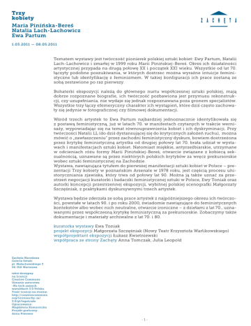 Trzy kobiety Maria Pinińska-Bereś Natalia Lach-Lachowicz Ewa Partum 1.03.2011 — 08.05.2011 Tematem wystawy jest twórczość pionierek polskiej sztuki kobiet: Ewy Partum, Natalii Lach-Lachowicz i zmarłej w 1999 roku Marii Pinińskiej-Bereś. Okres ich działalności artystycznej przypada na drugą połowę XX i początek XXI wieku. Wszystkie od lat 70. łączyły podobne poszukiwania, w których dostrzec można wyraźne intuicje feministyczne lub identyfikację z feminizmem. W takiej konfiguracji ich prace zostaną ze sobą zestawione po raz pierwszy. Bohaterki ekspozycji należą do głównego nurtu współczesnej sztuki polskiej, mają dobrze rozpoznane biografie, ich twórczość pozbawiona jest przymusu rekonstrukcji, czy uzupełniania, nie wydaje się jednak rozpoznawana poza gronem specjalistów. Wszystkie trzy łączy efemeryczny charakter ich wystąpień, które dziś często zachowały się jedynie w fotograficznej czy filmowej dokumentacji. Wśród trzech artystek to Ewa Partum najbardziej jednoznacznie identyfikowała się z postawą feministyczną, już w latach 70. w manifestach czytanych w trakcie wernisaży, wypowiadając się na temat równouprawnienia kobiet i ich dyskryminacji. Przy twórczości Natalii LL (do dziś dystansującej się do krytycznych założeń ruchu), można mówić o „zawłaszczeniu” przez zachodni feministyczny dyskurs, bowiem dostrzeżona przez krytykę feministyczną artystka od drugiej połowy lat 70. brała udział w wystawach i manifestacjach sztuki kobiet. Natomiast miękkie, antyrzeźbiarskie, utrzymane w odcieniach różu formy Marii Pinińskiej-Bereś, otwarcie związane z kobiecą seksualnością, uznawane są przez niektórych polskich krytyków za wręcz prekursorskie wobec sztuki feministycznej na Zachodzie. Wystawa, nawiązująca tytułem do pierwszej manifestacji sztuki kobiet w Polsce – prezentacji Trzy kobiety w poznańskim Arsenale w 1978 roku, jest częścią procesu uhistoryczniania zjawiska, który trwa od połowy lat 90. Można ją także uznać za przestrzeń negocjacji kuratorki i badaczki feministycznej sztuki w Polsce, Ewy Toniak oraz autorki koncepcji przestrzennej ekspozycji, wybitnej polskiej scenografki Małgorzaty Szczęśniak, z praktykami dyskursywnymi trzech artystek. Wystawa będzie zderzała ze sobą prace artystek z najpóźniejszego okresu ich twórczości, powstałe w latach 90. i po roku 2000, świadomie nawiązujące do feministycznych kontekstów albo wobec nich neutralne, otwarcie ironiczne – z dziełami z lat 70., uznawanymi przez współczesną krytykę feministyczną za prekursorskie. Zobaczymy także dokumentacje i materiały archiwalne z lat 70. i 80. kuratorka wystawy Ewa Toniak projekt ekspozycji Małgorzata Szczęśniak (Nowy Teatr Krzysztofa Warlikowskiego) współprojektant ekspozycji Łukasz Kwietniewski współpraca ze strony Zachęty Anna Tomczak, Julia Leopold Zachęta Narodowa Galeria Sztuki pl. Małachowskiego 3 00-916 Warszawa tekst dostępny na licencji Creative Commons Uznanie autorstwa -Na tych samych warunkach 3.0 Polska. Treść licencji na stronie: http://creativecommons. org/licenses/by-sa/ 3.0/pl/legalcode Opracowanie: Magdalena Komornicka Projekt graficzny: Anna Piwowar -1- Trzy kobiety Maria Pinińska-Bereś Natalia Lach-Lachowicz Ewa Partum grupa 1 Ewa Partum 1 Trzy kobiety - trzy artystki należące do głównego nurtu współczesnej sztuki polskiej, mające dobrze rozpoznawalne biografie, szczegółowo uzupełnione katalogi własnej twórczości i monumentalne wystawy monograficzne… … co jeszcze łączy Marię Pinińską-Bereś, Natalię Lach-Lachowicz i Ewę Partum? FORMA Przyjrzyjcie się dokładnie pracom Samoidentyfikacja (1980), Zmiana (1974-1979), i Kobiety, małżeństwo jest przeciwko wam! (1980) Ewy Partum zaprezentowanym na wystawie i odpowiedzcie na pytania. Forma dzieła sztuki - wygląd dzieła sztuki, na który składają się rodzaj i właściwości tworzywa oraz sposób jego ukształtowania. Jaką techniką zostały wykonane prace? Pośród serii fotomontaży składających się na pracę Samoidentyfikacja odnajdziecie jedną „prawdziwą” fotografię. Jak myślisz, ile czasu trzeba poświęcić, aby dokładnie obejrzeć te prace? Czy pracę Zmiany trzeba obejrzeć w całości? Czy konieczne jest oglądanie pracy wiedo od początku? notatki -2- Trzy kobiety Maria Pinińska-Bereś Natalia Lach-Lachowicz Ewa Partum grupa 1 2 IDEA Przyjrzyjcie się uważnie pracom: Kobiety, małżeństwo jest przeciwko wam! (1980), Marriage disaster (1987) i Mój problem jest problemem kobiety (1978). Zastanówcie się teraz jaka jest ich wymowa. Idea, treść dzieła sztuki – rozumiana najczęściej jako ogólny sens dzieła, jego wymowa ideologiczna lub zespół procesów i zdarzeń przedstawionych w dziele. Czy w tej pracy są wykorzystane przedstawienia, gesty, przedmioty, znaki coś symbolizują? Jaką funkcję pełnią tytuły prac? Jak artystka manifestuje swoje poglądy? Do kogo skierowane są te prace? Czy dzieło sztuki może oddziaływać na społeczeństwo i zmieniać poglądy i zachowania? Czy prace Ewy Partum można interpretować jako feministyczne? Odpowiedź uzasadnijcie. Feminizm (nie ma jednej definicji tego terminu): —feminizm oznacza opór przeciwko hierarchii płciowej, w której jedna płeć dominuje, a druga jest jej podległa. —feminizm przedstawia opinię, że rola kobiety jest skonstruowana społecznie, a więc narzucona przez społeczeństwo – a nie nadana przez Boga czy naturę. —feminizm oznacza zrozumienie, co wyróżnia kobiety jako grupę społeczną oraz im plikuje identyfikację do pewnego stopnia z grupą zwaną „kobietami” notatki -3- Trzy kobiety Maria Pinińska-Bereś Natalia Lach-Lachowicz Ewa Partum grupa 1 3 INTERPRETACJA Przyjrzyjcie się lepiej pracy Samoidentyfikacja z 1980 i odpowiedzcie na pytania. Interpretacja - próba analizy dzieła sztuki, badania, tłumaczenia i wyjaśniania jego sensu i znaczenia
