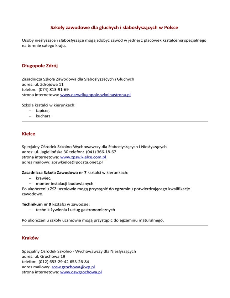 Szkoły zawodowe dla głuchych i słabosłyszących w Polsce Osoby niesłyszące i słabosłyszące mogą zdobyć zawód w jednej z placówek kształcenia specjalnego na terenie całego kraju. Długopole Zdrój Zasadnicza Szkoła Zawodowa dla Słabosłyszących i Głuchych adres: ul. Zdrojowa 11 telefon: (074) 813-91-69 strona internetowa: www.oszwdlugopole.szkolnastrona.pl Szkoła kształci w kierunkach: – tapicer, – kucharz. Kielce Specjalny Ośrodek Szkolno-Wychowawczy dla Słabosłyszących i Niesłyszących adres: ul. Jagiellońska 30 telefon: (041) 366-18-67 strona internetowa: www.zpsw.kielce.com.pl adres mailowy: [email protected] Zasadnicza Szkoła Zawodowa nr 7 kształci w kierunkach: – krawiec, – monter instalacji budowlanych. Po ukończeniu ZSZ uczniowie mogą przystąpić do egzaminu potwierdzającego kwalifikacje zawodowe. Technikum nr 9 kształci w zawodzie: – technik żywienia i usług gastronomicznych Po ukończeniu szkoły uczniowie mogą przystąpić do egzaminu maturalnego. Kraków Specjalny Ośrodek Szkolno - Wychowawczy dla Niesłyszących adres: ul. Grochowa 19 telefon: (012) 653-29-42 653-26-84 adres mailowy: [email protected] strona internetowa: www.oswgrochowa.pl Technikum nr 27 (4-letnie) kształci w zawodzie: • technik mechanik, • technik mechatronik, • technik technologii odzieży, • technik żywienia i usług gastronomicznych, • technik budownictwa, • technik handlowiec, Zasadnicza Szkoła Zawodowa nr 29 (3-letnia) kształci w zawodzie: • kucharz, • krawiec, • fryzjer, • fotograf, • blacharz samochodowy, • monter zabudowy i robót wykończeniowych w budownictwie Szkoła Policealna nr 20 (1 roczna lub 2 letnia) kształci w zawodzie: • technik administracji, • technik usług kosmetycznych, • technik informatyk, • florysta, • asystent osoby niepełnosprawnej. Lublin Specjalny Ośrodek Szkolno - Wychowawczy dla Dzieci i Młodzieży Niepełnosprawnych im. Prof. Zofii Sękowskiej w Lublinie adres: ul. Wyścigowa 31 telefon: (081) 532-19-44, 532-80-57 adres mailowy: [email protected] strona internetowa: www.soswlublin.pl Zasadnicza Szkoła Zawodowa kształci w zawodzie: • kucharz, • introligator. Technikum nr 2 kształci w zawodzie: • technik informatyk, • technik masażysta - dla uczniów z dysfunkcją wzroku. Szkoła Policealna nr 2 kształci w zawodzie: • technik informatyk Lubliniec Specjalny Ośrodek Szkolno - Wychowawczy im. Konrada Mańki w Lublińcu adres: ul. P. Stalmacha 90 telefon: (034) 356-32-41 / 2 telefon: (34) 356-33-66 adres mailowy: [email protected] strona internetowa: www.lubliniec.idn.org.pl Zasadnicza Szkoła Zawodowa Specjalnej nr 1 kształci w zawodzie: • kucharz, • pracownik pomocniczy obsługi hotelowej, • murarz-tynkarz, • mechanik pojazdów samochodowych, • fryzjer, • sprzedawca, • ogrodnik. Technikum Specjalne nr 4 kształci w zawodzie: • technik informatyk, • technik żywienia i usług gastronomicznych. Policealna Szkoła Zawodowa kształci w zawodzie: • florysta. Łódź Specjalny Ośrodek Szkolno - Wychowawczy Nr 1 im. Janusza Korczaka w Łodzi, adres: ul. Siedlecka 7/21 telefon: (0-42) 684-60-19 684-51-48 adres mailowy: [email protected] strona internetowa: www.sosw1.szkoly.lodz.pl Zasadnicza Szkoła Zawodowa dla Słabosłyszących kształci w zawodzie: • kucharz, • stolarz, • monter sieci, instalacji i urządzeń sanitarnych, • ogrodnik, • fryzjer, • krawiec. 4-letnie Technikum dla niesłyszących i słabo słyszących nr 24 kształci w zawodzie: • technik cyfrowych procesów komputerowych, • technik informatyk, • technik żywienia i usług gastronomicznych. Poznań Ośrodek Szkolno - Wychowawczy dla Dzieci Niesłyszących w Poznaniu Zasadnicza Szkoła Zawodowa dla Dzieci Niesłyszących adres: ul. Bydgoska 4 A telefon: (061) 877-57-19 877-03-24 adres mailowy: [email protected] strona internetowa: www.slysze.edu.pl Zasadnicza Szkoła Zawodowa kształci w zawodach: • kucharz małej gastronomii, • cukiernik, • ogrodnik Szkoła policealna kształci w zawodzie technik informatyk. Uczniowie zdobywają kwalifikacje: montaż i naprawa komputerów, administracja i budowa sieci komputerowych, tworzenie stron internetowych (w tym grafika komputerowa) i baz danych. Przemyśl Specjalny Ośrodek Szkolno - Wychowawczy nr 2 im. dra Janusza Korczaka w Przemyślu adres: ul. Czarnieckiego 27 telefon: (016) 678-90-13 wew. 39 strona internetowa: www.sosw2przemysl.com adres mailowy: [email protected] Zasadnicza Szkoła Zawodowa prowadzi kształcenie w kierunkach: • ślusarz, • krawiec, • kucharz. Technikum prowadzi kształcenie w zawodach: • technik technologii odzieży, • technik mechanik, • technik żywienia i usług gastronomicznych, • technik informatyk. Szkoła policealna kształci w zakresie: • technik informatyk, • technik turystyki wiejskiej. Racibórz Specjalny Ośrodek Szkolno - Wychowawczy dla Niesłyszących i Słabosłyszących w Raciborzu adres: ul. Karola Miarki 4 telefon: (032) 415-24-57, centr. 415-22-55 strona internetowa: [email protected] adres mailowy: www.oswnis.pl Zasadnicza Szkoła Zawodowa dla Głuchych kształci w zawodach: – krawiec, – stolarz, – fotograf. Technikum kształci w zawodzie: – fototechnik, – technik informatyk, – technik żywienia i usług gastronomicznych. Szkoła Policealna przygotowuje do zawodów: – terapia zajęciowa, – florystyka, – technik informatyk. Radom Ośrodek Szkolno - Wychowawczy im. Janusza Korczaka w Radomiu adres: ul. Wernera 6 telefon: (048) 362-56-34 strona internetowa: www.oswradom.edupage.org adres mailowy: [email protected] Zasadnicza Szkoła Zawodowa nr 3 kształci w zawodach: – sprzedawca, – piekarz – sprzedawca, – kucharz, – blacharz samochodowy, – cukiernik, – introligator, – murarz- tynkarz, – monter zabudowy i robót wykończeniowych w budownictwie. Sławno Specjalny Ośrodek Szkolno – Wychowawczy dla Dzieci i Młodzieży Niepełnosp