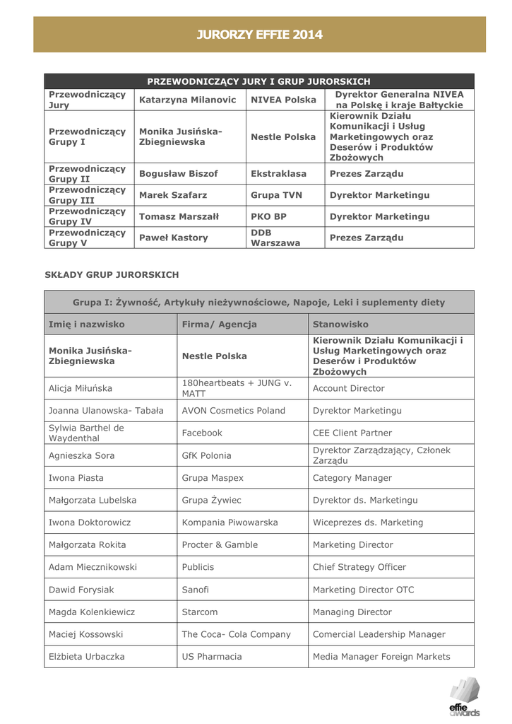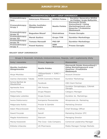 JURORZY EFFIE 2014 PRZEWODNICZĄCY JURY I GRUP JURORSKICH Przewodniczący Jury Katarzyna Milanovic NIVEA Polska Przewodniczący Grupy I Monika JusińskaZbiegniewska Nestle Polska Bogusław Biszof Ekstraklasa Prezes Zarządu Marek Szafarz Grupa TVN Dyrektor Marketingu Tomasz Marszałł PKO BP Dyrektor Marketingu Paweł Kastory DDB Warszawa Prezes Zarządu Przewodniczący Grupy II Przewodniczący Grupy III Przewodniczący Grupy IV Przewodniczący Grupy V Dyrektor Generalna NIVEA na Polskę i kraje Bałtyckie Kierownik Działu Komunikacji i Usług Marketingowych oraz Deserów i Produktów Zbożowych SKŁADY GRUP JURORSKICH Grupa I: Żywność, Artykuły nieżywnościowe, Napoje, Leki i suplementy diety Imię i nazwisko Firma/ Agencja Stanowisko Monika JusińskaZbiegniewska Nestle Polska Kierownik Działu Komunikacji i Usług Marketingowych oraz Deserów i Produktów Zbożowych Alicja Miłuńska 180heartbeats + JUNG v. MATT Account Director Joanna Ulanowska- Tabała AVON Cosmetics Poland Dyrektor Marketingu Sylwia Barthel de Waydenthal Facebook CEE Client Partner Agnieszka Sora GfK Polonia Dyrektor Zarządzający, Członek Zarządu Iwona Piasta Grupa Maspex Category Manager Małgorzata Lubelska Grupa Żywiec Dyrektor ds. Marketingu Iwona Doktorowicz Kompania Piwowarska Wiceprezes ds. Marketing Małgorzata Rokita Procter & Gamble Marketing Director Adam Miecznikowski Publicis Chief Strategy Officer Dawid Forysiak Sanofi Marketing Director OTC Magda Kolenkiewicz Starcom Managing Director Maciej Kossowski The Coca- Cola Company Comercial Leadership Manager Elżbieta Urbaczka US Pharmacia Media Manager Foreign Markets Grupa II: Retail, Usługi, Dobra konsumenckie, E-commerce, Motoryzacja Imię i nazwisko Firma/ Agencja Stanowisko Bogusław Biszof Ekstraklasa Prezes Zarządu Alina Prawdzik Audioteka COO Chief Operating Officer Bartłomiej Szmaj BP Polska Head of Marketing Jarosław Kwiecień General Motors Poland Opel Fleet Sales Manager Jacek Karolak K2 Dyrektor Strategii Przemek Porada Leroy Merlin Menedżer ds. Internetu Damian Zapłata Loyalty Partner Polska CEO Urszula Reichman Mercedes-Benz Polska Marketing Manager Beata Szcześniak OMD Dyrektor zarządzający Urszula Uchańska Philips Dyrektor Marketingu Paweł Ostrowski Platforma nc+ Digital Projects & e-Commerce Director Michał Leman PLL LOT Dyrektor Marketingu Emilia Bratkowska Rainbow Tours Dyrektor Marketingu Agnieszka Kwaśniewska Saatchi & Saatchi Michał Kociankowski Synergion Managing Partner Saatchi & Saatchi Think Tank Badacz rynku i strategii komunikacji Grupa III: Pro bono, CSR, Promocja miejsc i wydarzeń oraz, media i rozrywka Imię i nazwisko Firma/ Agencja Stanowisko Marek Szafarz Grupa TVN Dyrektor Marketingu Grażyna Skarżyńska Albert Lumberjacker Partner, Managing Director Aleksandra Jurkiewicz DDB Warszawa Strategy Director Dorota Żurkowska- Bytner Discovery Networks CEEMEA Vice-President, Ad Sales Development Jaromir Sroga Eurozet Dyrektor Biura Reklamy Mirella Panek- Owsiańska FOB Prezeska i Dyrektorka Generalna Ewa Maria Kulik- Bielińska Fundacja im. Stefana Batorego Dyrektor Fundacji Renata Wasiak Havas Media Managing Director Paweł Jakubowski Lemon Sky Strategy Director Jakub Kossut MediaCom Warszawa Dyrektor Zarządzający Łukasz Goździor Miasto Poznań Dyrektor Biura Promocji Miasta Marzena Bala-Przybylska Nivea Polska Marketing Manager Piotr Glen PZU Elżbieta Janczur SOS Wioski Dziecięce Patryk Piputa The Walt Disney Company Polska Rafał Adasiak Ubisoft Dyrektor Marketingu Radek Miklaszewski WALK Partner/Board Member Dyrektor ds. Zaangażowań Społecznych Zastępca Dyrektora Regionu Rosja i Azja Środkowa Director, Disney Media+ Advertising Sales and Promotions Central Eastern Europe Grupa IV: Bankowość, Ubezpieczenia i inwestycje, Telekomunikacja Imię i nazwisko Firma/ Agencja Stanowisko Tomasz Marszałł PKO BP Dyrektor Marketingu Natalia Załęcka Getin Noble Bank Dyrektor Marketingu Marcin Karnowski Google Head of marketing CEE Andrzej Mytych Grupa Aviva Head of Brand & ATL Communications Aviva Poland Maciej Marszałek Link4 Dyrektor Marketingu Wojciech Borowski McCann Worldgroup CEO Anna Jarzynka MEC Mariusz Rzanny Millward Brown Krzysztof Mróz Niezależny ekspert Kierownik Komunikacji i Marketingu Mateusz Mentlewicz Ogilvy One Chief Digital Officer Szymon Biela Orange Polska Kierownik Wydziału Komunikacji Orange Marcin Winkler P4 Head of Internet Marketing Bartosz Niemaczek T-Mobile Polska Paweł Szarkowski T-Mobile Polska Managing Partner; Client Service Director Dyrektor na Europę Środkową i Wschodnią Lead Strategist for Financial Services Marketing Dyrektor Departamentu Komunikacji Rynkowej Grupa V: Launch, Long term, Limited budget, Media & Technology innovation Imię i nazwisko Firma/ Agencja Stanowisko Paweł Kastory DDB Warszawa Prezes Zarządu Artur Sikora BZ WBK Piotr Chęcielewski Carlsberg Mariusz Jasiński Ford Polska Marta Życińska Grupa PZU Dyrektor Marketingu Katarzyna Okularczyk IBM Dyrektor Marketingu i Komunikacji Katarzyna Niewiada Kruszwica Marketing Director Rafał Jakubowski Niezależny ekspert Marketing Director KFC CEE Marcin Bruś Niezależny ekspert Michał Bonarowski Niezależny ekspert Adam Polasz ONE ELEVEN Dyrektor badań i analiz Paweł Patkowski Orange Polska Dyrektor Wykonawczy ds. Marki i Komunikacji Marketingowej Michał Wolniak VML Poland Chief Strategy Officer Monika Bronowska ZenithOptimedia Group CEO Inga Songin Żywiec Zdrój Marketing & PR Director Dyrektor Obszaru Komunikacji Korporacyjnej i Marketingu Wiceprezes ds. Marketingu i Sprzedaży Z-ca Dyrektora ds. Marketingu/ Kierownik Produktu