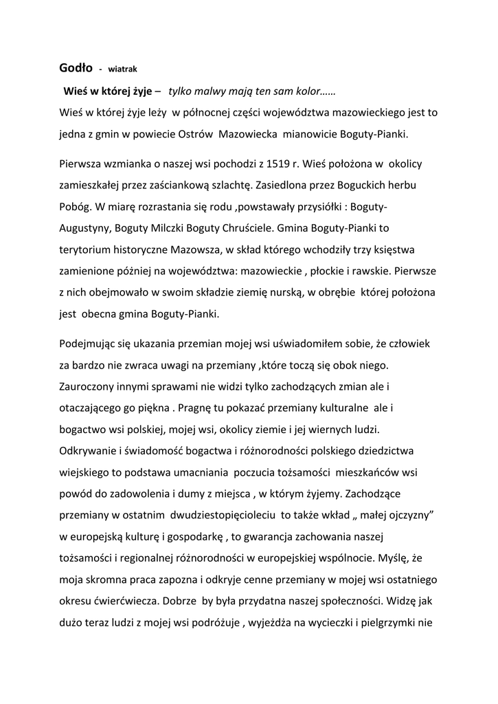 Godło - wiatrak Wieś w której żyje – tylko malwy mają ten sam kolor…… Wieś w której żyje leży w północnej części województwa mazowieckiego jest to jedna z gmin w powiecie Ostrów Mazowiecka mianowicie Boguty-Pianki. Pierwsza wzmianka o naszej wsi pochodzi z 1519 r. Wieś położona w okolicy zamieszkałej przez zaściankową szlachtę. Zasiedlona przez Boguckich herbu Pobóg. W miarę rozrastania się rodu ,powstawały przysiółki : BogutyAugustyny, Boguty Milczki Boguty Chruściele. Gmina Boguty-Pianki to terytorium historyczne Mazowsza, w skład którego wchodziły trzy księstwa zamienione póżniej na województwa: mazowieckie , płockie i rawskie. Pierwsze z nich obejmowało w swoim składzie ziemię nurską, w obrębie której położona jest obecna gmina Boguty-Pianki. Podejmując się ukazania przemian mojej wsi uświadomiłem sobie, że człowiek za bardzo nie zwraca uwagi na przemiany ,które toczą się obok niego. Zauroczony innymi sprawami nie widzi tylko zachodzących zmian ale i otaczającego go piękna . Pragnę tu pokazać przemiany kulturalne ale i bogactwo wsi polskiej, mojej wsi, okolicy ziemie i jej wiernych ludzi. Odkrywanie i świadomość bogactwa i różnorodności polskiego dziedzictwa wiejskiego to podstawa umacniania poczucia tożsamości mieszkańców wsi powód do zadowolenia i dumy z miejsca , w którym żyjemy. Zachodzące przemiany w ostatnim dwudziestopięcioleciu to także wkład „ małej ojczyzny” w europejską kulturę i gospodarkę , to gwarancja zachowania naszej tożsamości i regionalnej różnorodności w europejskiej wspólnocie. Myślę, że moja skromna praca zapozna i odkryje cenne przemiany w mojej wsi ostatniego okresu ćwierćwiecza. Dobrze by była przydatna naszej społeczności. Widzę jak dużo teraz ludzi z mojej wsi podróżuje , wyjeżdża na wycieczki i pielgrzymki nie tylko krajowe ale i zagraniczne. Podróże te integrują ludzi , są pewną otwartą formą społeczną mającą oddziaływanie na środowisko i jego kulturę. Takie działania zrodzone w środowisku pociągają za sobą akcje społeczne. Zmieniają życie wsi na lepsze. Tej społeczności wiele zawdzięczam ale jej też coś dałem z siebie bo prawie wraz z odzyskaniem wolności rozpocząłem pracę w kulturze. Dlatego może łatwiej mi dokonać porównania przemiany ponieważ żyłem wraz z nią . W literaturze anglosaskiej nie odczuwa się „kompleksu prowincji”, którym często się w Polsce straszymy. Tam pracujący Polacy zauważają ,że świat wsi lub małego miasteczka nie różni się od Wielkiego Świata , a jest tylko jego miniaturą . Dobrze jest ,że ci co wracają z emigracji nie robią problemu te wiejskie przemiany bardziej drażnią tych , którzy tu żyją . Moim marzeniem chłopaka kończącego szkołę podstawową było zwiedzenie Francji ponieważ miałem tam rodzinę , którzy przyjeżdżając do Polski opowiadali o życiu na zachodzie . To marzenie po latach spełniło się zresztą przekonałem się w wielu sprawach ,że jeśli dąży się do czego to można osiągnąć cel. Tu w kraju w tym czasie ciężko się żyło, nawet gdy były pieniądze to trudno było coś kupić. Natomiast słuchając wypowiedzi ,że tam jest odwrotnie to trudno było uwierzyć. Udało mi się chłopakowi z dalekiej wsi wyjechać do Francji w latach 80-tych i wtedy zobaczyłem ten zgniły zachód i przez pierwsze trzy noce budząc się w nocy zastanawiałem się czy ja rzeczywiście jestem w innym kraju czy mi się to wszystko śni. To właśnie były moje pierwsze spostrzeżenia , podejrzenia m.in. piękne ogrody nie ogrodzone , dużo pięknych krzewów .I tak sobie myślałem skoro rosną tam dlaczego nie ma ich u nas , przecież klimat podobny. Po powrocie z Francji zacząłem pierwsze przemiany w domu i ogrodzie , które podejrzałem w tym kraju. Trudno mi było pogodzić się z obwarowaniami systemu w naszym kraju. Nastąpił pierwszy bunt skoro gdzieś może być inaczej dlaczego nie u nas tez tak może być. W latach siedemdziesiątych mieszkaliśmy już w pięknym murowanym domu z trudno zdobytymi meblami ale karmę tucznikom nosiło się wiaderkami i codzienne parowanie kartofli. Za kilka tuczników ojciec pamiętam zakupił cegłę na cały dom .We wsi pojawił się pierwszy ciągnik Zetor a drugi radziecki i samochód osobowy Warszawa -samochód ekstra jak na tamte czasy. Pamiętam tą inną wieś stojące kolejki całymi nocami i każdy towar miał odbiorcę, nigdy nie zalegało nic w magazynie. Teraz pod każdy dom przyjeżdża jeden samochód z pieczywem drugi z artykułami spożywczymi. Raz tygodniu obowiązkowo rodzina jedzie na zakupy do Biedronki Brakuje mi w tych latach przeobrażeń smaku chleba , wędliny zresztą wszystkich produktów spożywczych , smak lodów skrobanych łyżką w bańce na mleko pamiętam do dziś, dzisiejszych lodów nie mogę jeść po prostu składniki chemiczne roznoszą organizm. Ogrody , otoczenie domów wiejskich , samochody nie różnią się niczym od tych w krajach zachodnich. Ale najbardziej widoczny postęp nastąpił w rolnictwie te wspaniałe ciągniki i maszyny odciążyły od ciężkiej i mozolnej pracy ale relacje międzysąsiedzkie spadły do minimum . Pamiętam jeszcze jeden telewizor we wsi spotkania z sąsiadami na filmie Polskie drogi ,wspólne zabawy obecnie nikt nikogo nie odwiedza chyba ,że zachodzi potrzeba. Od przełomu po 1989 roku zaniechano wiejskich potańcówek i zabaw karnawałowych. Dla młodzieży co kilka kilometrów wyrosły piękne dyskoteki starsi pozostali przy telewizorach. Przed 1990 roku wykształcenie średnie w mojej wsi było rzadkim przypadkiem najczęściej była to szkołą podstawowa coraz częściej już zawodowa. Obecnie rzadki to przypadek większość posiada średnie i wyższe wykształcenie mówię nie tylko o pracujących zawodowo ale i rolnikach. Szkolenia wyjazdy to też przemiana w urzędach petent inaczej jest traktowany obecnie niż 