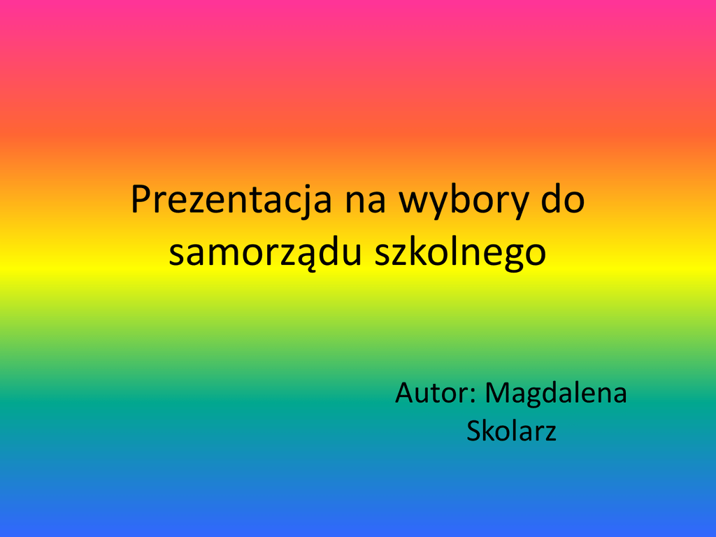 Prezentacja na wybory do samorządu szkolnego Autor: Magdalena Skolarz Trochę o sobie :D Nazywam się Magdalena Skolarz i chodzę do klasy III a Bardzo lubię grać w piłkę nożną oraz w siatkówkę ogólnie kocham W-F :D Interesuję się też muzyką . Obecnie uczę się grać na gitarze i skrzypcach . Oprócz tego należę do zespołu ,, Grojcowianie” , gdzie tańczę i śpiewam • Startuję do Samorządu szkolnego, ponieważ chciałabym zmienić coś w naszej szkole. Sprawić, aby każdy dzień spędzany w niej był dniem udanym, by uczniowie nie stresowali się nauką a szkoła była przyjazna i wesoła. Moje propozycje • Jeśli zostanę przewodniczącą postaram się aby: - raz w miesiącu np. ( w każdy pierwszy piątek miesiąca ) był dzień bez pytania w szkole - odbyło się ok. 5 dyskotek szkolnych - miał miejsce pokaz mody oraz konkurs na miss i misstera w szkole - sprawnie zadziałała poczta walentynkowa • Urządzono walentynki i konkurs na najlepiej ubraną na czerwono osobę w szkole. • Przygotowano ,,Mikołajki z humorem” :D • Zorganizowano przegląd muzyczno-taneczny młodych talentów • Przygotowano akademie z różnych okazji • Miał miejsce ,,Dzień dziecka” Odbył się dzień sprawności fizycznej Zakończenie •JEŚLI PODOBA CI SIĘ MOJE PRZESŁANIE GŁOSUJ NA MNIE !!! :D