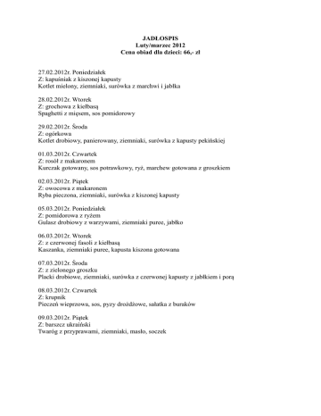 JADŁOSPIS Luty/marzec 2012 Cena obiad dla dzieci: 66,- zł 27.02.2012r. Poniedziałek Z: kapuśniak z kiszonej kapusty Kotlet mielony, ziemniaki, surówka z marchwi i jabłka 28.02.2012r. Wtorek Z: grochowa z kiełbasą Spaghetti z mięsem, sos pomidorowy 29.02.2012r. Środa Z: ogórkowa Kotlet drobiowy, panierowany, ziemniaki, surówka z kapusty pekińskiej 01.03.2012r. Czwartek Z: rosół z makaronem Kurczak gotowany, sos potrawkowy, ryż, marchew gotowana z groszkiem 02.03.2012r. Piątek Z: owocowa z makaronem Ryba pieczona, ziemniaki, surówka z kiszonej kapusty 05.03.2012r. Poniedziałek Z: pomidorowa z ryżem Gulasz drobiowy z warzywami, ziemniaki puree, jabłko 06.03.2012r. Wtorek Z: z czerwonej fasoli z kiełbasą Kaszanka, ziemniaki puree, kapusta kiszona gotowana 07.03.2012r. Środa Z: z zielonego groszku Placki drobiowe, ziemniaki, surówka z czerwonej kapusty z jabłkiem i porą 08.03.2012r. Czwartek Z: krupnik Pieczeń wieprzowa, sos, pyzy drożdżowe, sałatka z buraków 09.03.2012r. Piątek Z: barszcz ukraiński Twaróg z przyprawami, ziemniaki, masło, soczek