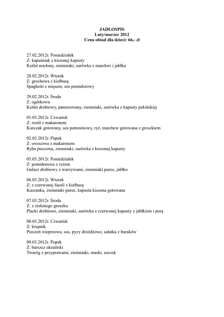 JADŁOSPIS Luty/marzec 2012 Cena obiad dla