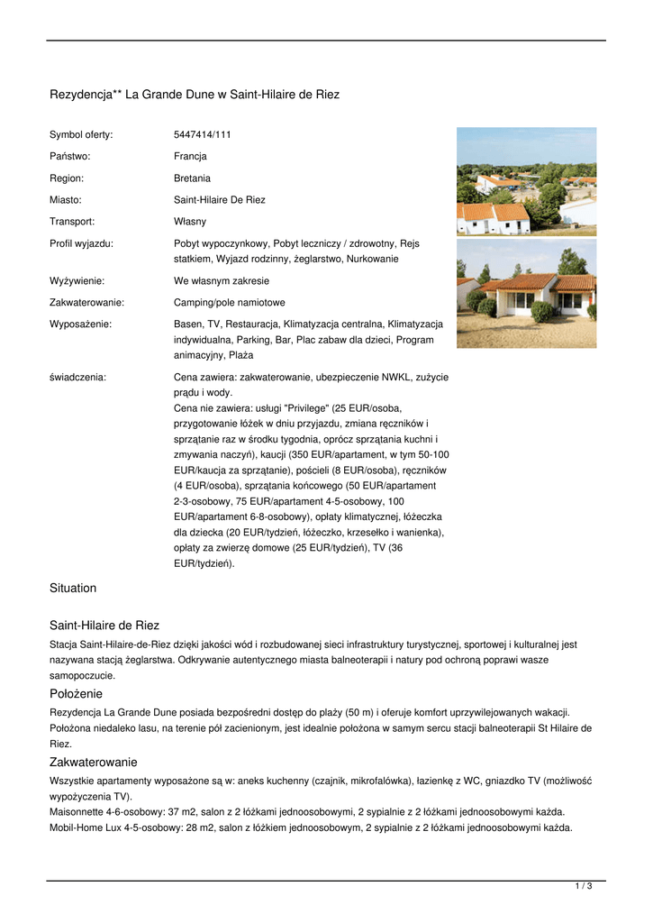 Rezydencja** La Grande Dune w Saint-Hilaire de Riez Symbol oferty: 5447414/111 Państwo: Francja Region: Bretania Miasto: Saint-Hilaire De Riez Transport: Własny Profil wyjazdu: Pobyt wypoczynkowy, Pobyt leczniczy / zdrowotny, Rejs Wyżywienie: We własnym zakresie Zakwaterowanie: Camping/pole namiotowe Wyposażenie: Basen, TV, Restauracja, Klimatyzacja centralna, Klimatyzacja statkiem, Wyjazd rodzinny, żeglarstwo, Nurkowanie indywidualna, Parking, Bar, Plac zabaw dla dzieci, Program animacyjny, Plaża świadczenia: Cena zawiera: zakwaterowanie, ubezpieczenie NWKL, zużycie prądu i wody. Cena nie zawiera: usługi "Privilege" (25 EUR/osoba, przygotowanie łóżek w dniu przyjazdu, zmiana ręczników i sprzątanie raz w środku tygodnia, oprócz sprzątania kuchni i zmywania naczyń), kaucji (350 EUR/apartament, w tym 50-100 EUR/kaucja za sprzątanie), pościeli (8 EUR/osoba), ręczników (4 EUR/osoba), sprzątania końcowego (50 EUR/apartament 2-3-osobowy, 75 EUR/apartament 4-5-osobowy, 100 EUR/apartament 6-8-osobowy), opłaty klimatycznej, łóżeczka dla dziecka (20 EUR/tydzień, łóżeczko, krzesełko i wanienka), opłaty za zwierzę domowe (25 EUR/tydzień), TV (36 EUR/tydzień). Situation Saint-Hilaire de Riez Stacja Saint-Hilaire-de-Riez dzięki jakości wód i rozbudowanej sieci infrastruktury turystycznej, sportowej i kulturalnej jest nazywana stacją żeglarstwa. Odkrywanie autentycznego miasta balneoterapii i natury pod ochroną poprawi wasze samopoczucie. Położenie Rezydencja La Grande Dune posiada bezpośredni dostęp do plaży (50 m) i oferuje komfort uprzywilejowanych wakacji. Położona niedaleko lasu, na terenie pół zacienionym, jest idealnie położona w samym sercu stacji balneoterapii St Hilaire de Riez. Zakwaterowanie Wszystkie apartamenty wyposażone są w: aneks kuchenny (czajnik, mikrofalówka), łazienkę z WC, gniazdko TV (możliwość wypożyczenia TV). Maisonnette 4-6-osobowy: 37 m2, salon z 2 łóżkami jednoosobowymi, 2 sypialnie z 2 łóżkami jednoosobowymi każda. Mobil-Home Lux 4-5-osobowy: 28 m2, salon z łóżkiem jednoosobowym, 2 sypialnie z 2 łóżkami jednoosobowymi każda. 1/3 Do dyspozycji Do dyspozycji: basen z basenem dla dzieci (maj/wrzesień), ping-pong, opiekunka do dziecka, surf, program animacyjny dla dzieci, młodzieży i dorosłych (spotkania sportowe, gry, spektakle, barbecue), plac zabaw dla dzieci, biblioteka, bar, lody, restauracja (30 m), parking, wypożyczalnia rowerów, sprzedaż biletów na wycieczki (wyspa Yeu). Atrakcje Sklepy (900 m w sezonie i 2 km poza sezonem) Żeglarstwo, jazda konna, tenis, golf, strzelanie z łuku Quad, karting, narciarstwo wodne, point-ball Aquapark Piesze i rowerowe wycieczki Koncerty, sklepy czynne całą dobę Zwiedzanie: La Bourrine du Bois Juquaud, błota z solami morskimi Promenady en Chaland Dojazd Samochód: Nantes, w kierunku Bordeaux, przejazd przez Saint Philibert de Gd Lieu, Machecoul, Challans, Saint-Hilaire de Riez. Pociąg: Nantes (70 km) lub Saint-Hilaire de Riez (5 km), następnie taxi. Samolot: lotnisko w Nantes (70 km). TERMINY: od: 2017-06-17 do: 2017-06-24 (8 dni), miejsca: zamów cena od: 477 PLN = 109 EUR od: 2017-06-17 do: 2017-07-01 (15 dni), miejsca: zamów cena od: 1026 PLN = 235 EUR od: 2017-06-24 do: 2017-07-01 (8 dni), miejsca: zamów cena od: 549 PLN = 126 EUR od: 2017-06-24 do: 2017-07-08 (15 dni), miejsca: zamów cena od: 1145 PLN = 263 EUR od: 2017-07-01 do: 2017-07-08 (8 dni), miejsca: zamów cena od: 596 PLN = 137 EUR od: 2017-07-01 do: 2017-07-15 (15 dni), miejsca: zamów cena od: 1193 PLN = 274 EUR od: 2017-07-08 do: 2017-07-15 (8 dni), miejsca: zamów cena od: 596 PLN = 137 EUR od: 2017-07-08 do: 2017-07-22 (15 dni), miejsca: zamów cena od: 1278 PLN = 293 EUR od: 2017-07-15 do: 2017-07-22 (8 dni), miejsca: zamów cena od: 681 PLN = 156 EUR od: 2017-07-15 do: 2017-07-29 (15 dni), miejsca: zamów cena od: 1363 PLN = 313 EUR od: 2017-07-22 do: 2017-07-29 (8 dni), miejsca: zamów cena od: 681 PLN = 156 EUR od: 2017-07-22 do: 2017-08-05 (15 dni), miejsca: zamów cena od: 1363 PLN = 313 EUR od: 2017-07-29 do: 2017-08-05 (8 dni), miejsca: zamów cena od: 681 PLN = 156 EUR od: 2017-07-29 do: 2017-08-12 (15 dni), miejsca: zamów cena od: 1278 PLN = 293 EUR od: 2017-08-05 do: 2017-08-12 (8 dni), miejsca: zamów cena od: 596 PLN = 137 EUR od: 2017-08-05 do: 2017-08-19 (15 dni), miejsca: zamów cena od: 852 PLN = 195 EUR od: 2017-08-12 do: 2017-08-19 (8 dni), miejsca: zamów cena od: 256 PLN = 59 EUR od: 2017-08-12 do: 2017-08-26 (15 dni), miejsca: zamów cena od: 511 PLN = 117 EUR od: 2017-08-19 do: 2017-08-26 (8 dni), miejsca: zamów cena od: 256 PLN = 59 EUR CENNIK: Długość pobytu: 15 dni 8 dni 8 dni 15 dni 8 dni 15 dni 8 dni 15 dni 15 dni 8 dni 15 dni 8 dni Grupa cenowa: F F A A D D C C E E B B 746 1492 1548 774 1366 683 574 1148 1190 595 1050 525 658 1316 1316 658 1190 595 Pobyt w obiekcie (do wyboru) Mobil-Home 4-5-osobowy luskusowy standardowo dla osób: 5 minimalnie: 4 1020 510 382 764 910 1820 Mobil-Home 4-5-osobowy kategoria 2 standardowo dla osób: 5 minimalnie: 4 784 392 294 588 700 1400 domek typu Maisonnette standard 6-osobowy standardowo dla osób: 6 490 245 455 910 770 1540 2/3 (*) domek typu Maisonnette comfort 6-osobowy standardowo dla osób: 6 620 310 615 1230 896 Ubezpieczenie (do wyboru) (*) ubezpieczenie NWKLSKI 14 Ubezpieczenie (opcjonalne) 7 ubezpieczenie od kosztów rezygnacji 2.4 % 2.4 % 1792 779 1558 1558 779 1428 714 7 14 7 14 7 14 14 7 14 7 2.4 % 2.4 % 2.4 % 2.4 % 2.4 % 2.4 % 2.4 % 2.4 % 2.4 % 2.4 % Waluta: EUR Aktualne ceny z systemu S.A.R.T. (-) - cena usługi, podatku kalkulowana przy osobie lub gratis (*) - kwota wliczona w cenę standardową 3/3