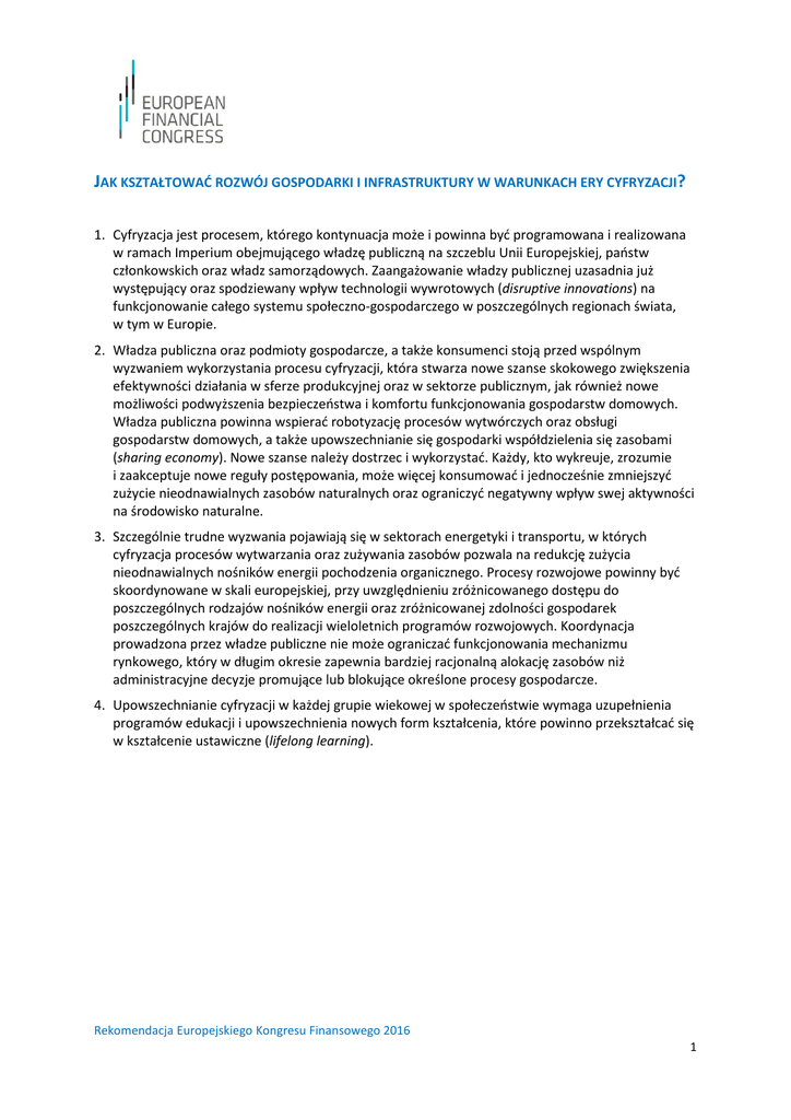 JAK KSZTAŁTOWAĆ ROZWÓJ GOSPODARKI I INFRASTRUKTURY W WARUNKACH ERY CYFRYZACJI? 1. Cyfryzacja jest procesem, którego kontynuacja może i powinna być programowana i realizowana w ramach Imperium obejmującego władzę publiczną na szczeblu Unii Europejskiej, państw członkowskich oraz władz samorządowych. Zaangażowanie władzy publicznej uzasadnia już występujący oraz spodziewany wpływ technologii wywrotowych (disruptive innovations) na funkcjonowanie całego systemu społeczno-gospodarczego w poszczególnych regionach świata, w tym w Europie. 2. Władza publiczna oraz podmioty gospodarcze, a także konsumenci stoją przed wspólnym wyzwaniem wykorzystania procesu cyfryzacji, która stwarza nowe szanse skokowego zwiększenia efektywności działania w sferze produkcyjnej oraz w sektorze publicznym, jak również nowe możliwości podwyższenia bezpieczeństwa i komfortu funkcjonowania gospodarstw domowych. Władza publiczna powinna wspierać robotyzację procesów wytwórczych oraz obsługi gospodarstw domowych, a także upowszechnianie się gospodarki współdzielenia się zasobami (sharing economy). Nowe szanse należy dostrzec i wykorzystać. Każdy, kto wykreuje, zrozumie i zaakceptuje nowe reguły postępowania, może więcej konsumować i jednocześnie zmniejszyć zużycie nieodnawialnych zasobów naturalnych oraz ograniczyć negatywny wpływ swej aktywności na środowisko naturalne. 3. Szczególnie trudne wyzwania pojawiają się w sektorach energetyki i transportu, w których cyfryzacja procesów wytwarzania oraz zużywania zasobów pozwala na redukcję zużycia nieodnawialnych nośników energii pochodzenia organicznego. Procesy rozwojowe powinny być skoordynowane w skali europejskiej, przy uwzględnieniu zróżnicowanego dostępu do poszczególnych rodzajów nośników energii oraz zróżnicowanej zdolności gospodarek poszczególnych krajów do realizacji wieloletnich programów rozwojowych. Koordynacja prowadzona przez władze publiczne nie może ograniczać funkcjonowania mechanizmu rynkowego, który w długim okresie zapewnia bardziej racjonalną alokację zasobów niż administracyjne decyzje promujące lub blokujące określone procesy gospodarcze. 4. Upowszechnianie cyfryzacji w każdej grupie wiekowej w społeczeństwie wymaga uzupełnienia programów edukacji i upowszechnienia nowych form kształcenia, które powinno przekształcać się w kształcenie ustawiczne (lifelong learning). Rekomendacja Europejskiego Kongresu Finansowego 2016 1