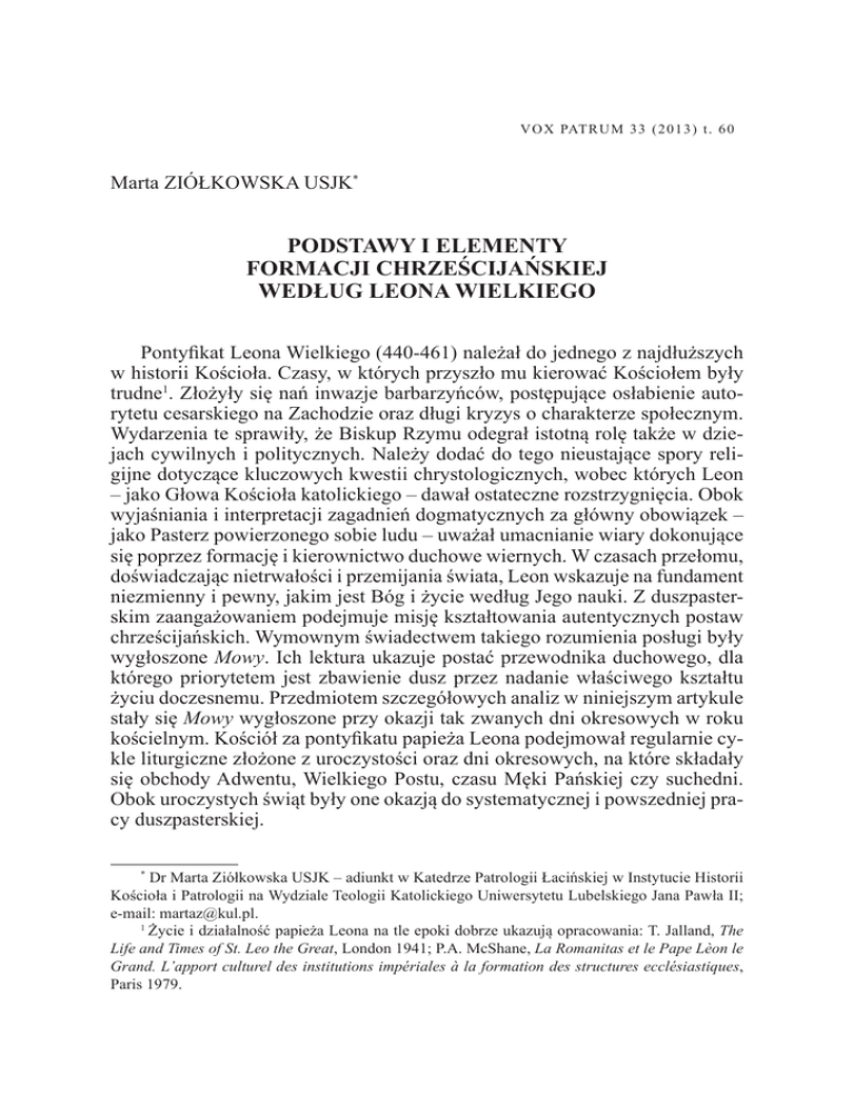 V O X PAT R U M 3 3 ( 2 0 1 3 ) t . 6 0 Marta ZIÓŁKOWSKA USJK* PODSTAWY I ELEMENTY FORMACJI CHRZEŚCIJAŃSKIEJ WEDŁUG LEONA WIELKIEGO Pontyfikat Leona Wielkiego (440-461) należał do jednego z najdłuższych w historii Kościoła. Czasy, w których przyszło mu kierować Kościołem były trudne1. Złożyły się nań inwazje barbarzyńców, postępujące osłabienie autorytetu cesarskiego na Zachodzie oraz długi kryzys o charakterze społecznym. Wydarzenia te sprawiły, że Biskup Rzymu odegrał istotną rolę także w dziejach cywilnych i politycznych. Należy dodać do tego nieustające spory religijne dotyczące kluczowych kwestii chrystologicznych, wobec których Leon – jako Głowa Kościoła katolickiego – dawał ostateczne rozstrzygnięcia. Obok wyjaśniania i interpretacji zagadnień dogmatycznych za główny obowiązek – jako Pasterz powierzonego sobie ludu – uważał umacnianie wiary dokonujące się poprzez formację i kierownictwo duchowe wiernych. W czasach przełomu, doświadczając nietrwałości i przemijania świata, Leon wskazuje na fundament niezmienny i pewny, jakim jest Bóg i życie według Jego nauki. Z duszpasterskim zaangażowaniem podejmuje misję kształtowania autentycznych postaw chrześcijańskich. Wymownym świadectwem takiego rozumienia posługi były wygłoszone Mowy. Ich lektura ukazuje postać przewodnika duchowego, dla którego priorytetem jest zbawienie dusz przez nadanie właściwego kształtu życiu doczesnemu. Przedmiotem szczegółowych analiz w niniejszym artykule stały się Mowy wygłoszone przy okazji tak zwanych dni okresowych w roku kościelnym. Kościół za pontyfikatu papieża Leona podejmował regularnie cykle liturgiczne złożone z uroczystości oraz dni okresowych, na które składały się obchody Adwentu, Wielkiego Postu, czasu Męki Pańskiej czy suchedni. Obok uroczystych świąt były one okazją do systematycznej i powszedniej pracy duszpasterskiej. * Dr Marta Ziółkowska USJK – adiunkt w Katedrze Patrologii Łacińskiej w Instytucie Historii Kościoła i Patrologii na Wydziale Teologii Katolickiego Uniwersytetu Lubelskiego Jana Pawła II; e-mail: [email protected]. 1 Życie i działalność papieża Leona na tle epoki dobrze ukazują opracowania: T. Jalland, The Life and Times of St. Leo the Great, London 1941; P.A. McShane, La Romanitas et le Pape Lèon le Grand. L’apport culturel des institutions impériales à la formation des structures ecclésiastiques, Paris 1979. 526 MARTA ZIÓŁKOWSKA USJK Bazę źródłową niniejszego opracowania stanowią Mowy Leona w wydania przygotowanym przez J.P. Migne’a. Literatura im poświęcona jest dość liczna. Badacze Mów Leona skupiali się głównie na dwóch zagadnieniach: stylu głoszonego kerygmatu oraz chrystologii. Zagadnieniem głoszenia słowa przez papieża Leona zajmowali się m.in. Cavalcanti2, Blümer3 oraz Naldini4, zaś nauka o Chrystusie prezentowana przez papieża koncentrowała uwagę takich badaczy jak Casula5, Dunn6 czy Ronconi7. Temat formacji duchowej, pomimo, że wydaje się być dominującym zagadnieniem w Mowach Leona, od strony wykładni teoretycznej nie spotkał się z większym zainteresowaniem ze strony uczonych, stąd nie mamy monografii ani licznych publikacji rozwijających ten motyw. Trzeba jednak zaznaczyć, że jeżeli autorzy opracowań podejmują refleksję nad duchowym czy moralnym obliczem wspólnoty rzymskiej za czasów Leona, to zazwyczaj zwracają uwagę na wymiar praktyczny w realizacji ideału doskonałości chrześcijańskiej oraz na środki, za pomocą których ona się dokonuje8. Uwzględniając powyższe stwierdzenia prezentowany artykuł koncentruje się na doktrynie teologicznej, która stała się punktem wyjścia do urzeczywistniania ortopraksji. W pierwszej części przedłożenia zaprezentowane zostaną podstawy oraz cele, jakie stawiał papież Leon formacji duchowej w V w. W drugiej zaś przedstawione zostaną poszczególne elementy, które składały się na program formacyjny. Takie ujęcie pozwoli na wskazanie fundamentów, na których opierała się starożytna formacja chrześcijańska oraz jej praktyczne przejawy, realizowane w codziennym dążeniu do świętości. I. PODSTAWY I CEL FORMACJI CHRZEŚCIJAŃSKIEJ „Te czyny Pana naszego przyniosą nam pożytek nie tylko przez swe tajemnicze działanie, ale i jako przykład do naśladowania, jeśli zbawcze środki 2 Por. E. Cavalcanti, Il „dovere della parola” nei Sermoni di Leone Magno, w: Munera Parva. Studi in onore di B. Ulianich, a cura di G. Luongo, Napoli 1999, 311-324; tenże, La predicazione di Leone Magno a Roma, w: La comunità cristiana a Roma, a cura di L. Pani Ermini – P. Siniscalco, Roma 2000, 247-267. 3 Por. W. Blümer, Rerum eloquentia, Frankfurt 1991. 4 Por. M. Naldini (a cura di), I sermoni di Leone Magno. Fra storia e teologia, Firenze 1997. 5 Por. L. Casula, La cristologia di san Leone Magno. Il fondamento dottrinale e soteriologico, Milano 2000. 6 Por. G.D. Dunn, Divine Impassibility and Christology in the Christmas Homilies of Leo the Great, ThS 62(2001) 71-85; tenże, Suffering Humanity and Divine Impassibility: The Christology of the Lenten Homilies of Leo the Great, Augustinianum 41 (2001) 257-271. 7 Por. M. Ronconi, A maiestate humilitas: il rilievo della retorica nella teologia di Leone Magno, Roma 2005. 8 Por. F. Drączkowski, Rewaloryzacja idei postów w nauczaniu Ojców Kościoła, w: Asceza odczłowieczenie czy uczłowieczenie, red. W. Słomka, Homo Meditans III, Lublin 1985, 125-136. PODSTAWY I ELEMENTY FORMACJI CHRZEŚCIJAŃSKIEJ WG LEONA WIELKIEGO 527 zastosujemy w naszym postępowaniu i z treści, złożonej w misteriach, skorzystamy w obyczajach naszych”9. Powyższe słowa stanowią klucz do zrozumienia programu duchowego, który realizował Kościół pod przewodnictwem Leona Wielkiego. Papież z tajemnic wiary czerpał wskazówki dla stylu życia wierzących. Formację wiernych związał z obchodami świąt roku l