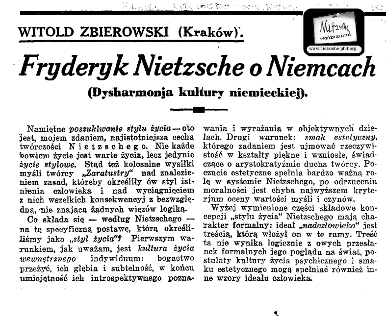 WITOLD ZBIEROWSKI (Kraków). Fryderyk Nietzsche o Niemcach (Dysharmonja kultury niemieckiej). Namiętne poszukiwanie stylu życia—oto jest, mojem zdaniem, najistotniejsza cecha twórczości N i e t z s c h e g o . Nie każde bowiem życie jest warte życia, lecz jedynie życie stylowe. Stąd też kolosalne wysiłki myśli twórcy „Zaratustry" nad znalezie niem zasad, którehy określiły ów styl ist nienia człowieka i nad wyciągnięciem z nich wszelkich konsekwencyj z bezwzglę dną, -nie znającą żadnych więzów logiką. Co składa się — według Nietzschego — na tę specyficzną postawę, którą określi liśmy jako „styl życia"? Pierwszym wa runkiem, jak uważam, jest kultura życia wewnętrznego indywiduum: bogactwo przeżyć, ieh głębia i subtelność, w końcu •umiejętność ich introspektywnego pozna wania i wyrażania w objektywnych dzie łach. Drugi warunek: smak estetyczny, którego zadaniem jest ujmować rzeczywi stość w kształty piękne i wzniosłe, świad czące o arystokratyźmie ducha twórcy. Po czucie estetyczne spełnia bardzo ważną ro lę w systemie Nietzschego, po odrzuceniu moralności jest chyba najwyższem kryterjum oceny wartości myśli i czynów. Wyżej wymienione częśei składowe kon cepcji „stylu życia" Nietzschego mają cha rakter formalny: ideał „nadczłowieka" jest treścią, którą włożył on w te ramy. Treść ta nie wynika logicznie z owych przesła nek formalnych jego poglądu na świat, po stulaty kultury życia psychicznego i sma ku estetycznego mogą spełniać również in ne wzory ideału człowieka. 1 Kwestją genezy i treścią koncepcji „nadczłowieczeństwa" zajmować się tn nie bę dziemy, nie jest ona ważną dla naszyoh ce lów. Zasadniczym bowiem celem niniejsze go szkicu jest znalezienie odpowiedzi na pytanie, czemu Nietzsche widział tak głę boki rozdźwięk miedzy sobą a społeczeń w drodze przemawiają do mnie jako do Polaka i to Polacy sami, jak rzadko biorą mnie za Niemca, to mogłoby się zdawać, ż» należę tylko do Niemców nakrapianyeh". Nie należy zapominać o wielkim jegS kulcie dla kultury francuskiej. „Do małej liczby dawniejszych rrancustwem niemieckiem, mimo że idee jego zna lazły u Niemców tak podatny gruntl Ma zów wciąż powracam — pisał — wierzę tyl my tu do czynienia z dziwnym, paradoksal ko w wykształcenie francuskie i uważam nym wypadkiem kolosalnego wpływu wszystko co poza tem w Europie zwie się twórcy, który z niezwykle ostrą krytyką „wykształceniem" za nieporozumienie, nie odnosi się do swego społeczeństwa i odże mówiąc o wykształceniu niemieckiem. Nie liczne przykłady wyższego wykształcenia, gnuje się od jego uznania. które w Niemczech znalazłem, były wszyst Lecz zapoznajmy się z tern, co pisał o kie pochodzenia francuskiego, przedewszystkiem pani C o s i m e Wagner,— Niemcach autor „Zaratustry". Znane jest polskie pochodzenie N i e t z - zgoła najpierwsza, jaką znałem, powaga s e h e g o r fakt; że'tak często i chętnie w rzeczach smaku". przyznawał się doń, rzuca niemało światła ...„Nie widzę zgoła, w jakiem stuleciu na jego stosunek do społeczeństwa nie dziejów możnaby naraz wyłowić tak cieka mieckiego: „Ja sam zawsze jeszcze nazbyt wych i równocześnie subtelnych psycholo jestem Polakiem, by za C h o p i n a ude gów, jak we współczesnym Paryżu". oddać całej reszty muzyki: czynię tylko „Artysta nie ma w Europie ojczyzny wyjątek dla W a g n e r a Idylli Zygfrydo- poza Paryżem". wej. „Przodkowie moi byli szlachta pol A jakież dziwne wynurzenia znajdujemy ską: stąd to posiadam we krwi wiele in na temat przyjaźni z W a g n e r e = a , stynktów rasowych, kto wie? Może nawet tym Wagnerem, który w twórczości swej liberum veto? "Jeśli pomyślę, jak często sięgał do najgłębszych złoży duszy gex> mańskiej!" „Dla mnie, com jest, jaki je stem, wszystkiemu, co niemieckie, tak'obcy z najgłębszych instynktów, że już bliskość zbudowano państwo! „Czego nie wybaczyłem Wagnerowi nigdyl Że stał się powolny żądaniom Niemców i ł — że stał się pań Niemca przewleka mi trawienie, bylo pier- stwowo niemieckim. Dokąd sięgają Niem- i wsze zetknięcie z Wagnerem także jpier- cy psują kulturę" (!!).' <; iwszem w mem życiu zaczerpnięciem* po Po powyższych 'wynurzeniach mniej nas } wietrza: odczuwałem, czciłem go jako za już zdziwi dobitne podkreślenie uczucia t granicę, jako przeciwieństwa, jako uciele obcości, jakie Nietzsche odczuwał wobec n ( śniony protest przeciw wszystkim „cnotom niemieckim". Wagner był rewolucjonistą — uciekł przed Niemcami". ...„Zważywszy wszystko, nie byłbym wytrzymał swej mło dości bez muzyki Wagnera. Bo byłem ska zany na Niemców. Chcąc się uwolnić od nieznośnego ucisku, trzeba haszyszu. .Wa gner jest odtrutką przeciw wszelkiej niefnieckości par excellence. Na dawniejsze dzieła Wagnera patrzyłem jako na. niśsze od siebie — jeszcze zbyt pospolite, zbyt „niemieckie". Kogóż nie zdumieją poniższe, bezcereimonjalnie drastyczne słowa: f „Biedny Wagner! W cóż to wdepnął! Żebyż był przecież pojechał przynajmniej „niemieckości". „My, którzyśmy w bagnistem powietrzu szóstego dziesiątka lat dziećmi byli, jesteśmy z konieczności pesymistami w kraju płaskości czech". europejskiej, pojęcia niemieckości"... względem „Nie odkryto mnie v v % £ w Niem } ...„Myśleć po niemiecku, czuć po niemiec- j ku — mogę wszystko, ale to przechodzi me siły". — „Cała mała nędzota niemiecka jest chmurą, w której odzwierciedla się bezkre- • sna fata m organa' przyszłości". ...„Niemcy J nie są zdolni do żadnego pojęcia wielkości". Jakto? Czyż to naprawdę mowa o nąro- , dzie, który uważa się za „Herrenvolk"? Czy między świnie! Lecz między Niemców! ; naprawdę mowa o kraju, który chce" nosić ; , Ostatecznie należałoby, dla nauki potom dumne miano „Kult