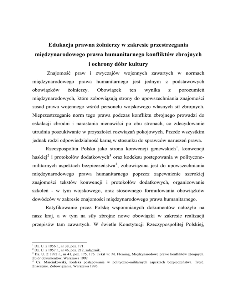 Edukacja prawna żołnierzy w zakresie przestrzegania międzynarodowego prawa humanitarnego konfliktów zbrojnych i ochrony dóbr kultury Znajomość praw i zwyczajów wojennych zawartych w normach międzynarodowego prawa humanitarnego jest jednym z podstawowych obowiązków żołnierzy. Obowiązek ten wynika z porozumień międzynarodowych, które zobowiązują strony do upowszechniania znajomości zasad prawa wojennego wśród personelu wojskowego własnych sił zbrojnych. Nieprzestrzeganie norm tego prawa podczas konfliktu zbrojnego prowadzi do eskalacji zbrodni i narastania nienawiści po obu stronach, co zdecydowanie utrudnia poszukiwanie w przyszłości rozwiązań pokojowych. Przede wszystkim jednak rodzi odpowiedzialność karną w stosunku do sprawców naruszeń prawa. Rzeczpospolita Polska jako strona konwencji genewskich 1 , konwencji haskiej 2 i protokołów dodatkowych 3 oraz kodeksu postępowania w politycznomilitarnych aspektach bezpieczeństwa 4 , zobowiązana jest do upowszechniania międzynarodowego prawa humanitarnego poprzez zapewnienie szerokiej znajomości tekstów konwencji i protokołów dodatkowych, organizowanie szkoleń - w tym wojskowego, oraz stosownego formułowania obowiązków dowódców w zakresie znajomości międzynarodowego prawa humanitarnego. Ratyfikowanie przez Polskę wspomnianych dokumentów nałożyło na nasz kraj, a w tym na siły zbrojne nowe obowiązki w zakresie realizacji przepisów tam zawartych. W świetle Konstytucji Rzeczypospolitej Polskiej, 1 Dz. U. z 1956 r., nr 38, poz. 171. Dz. U. z 1957 r., nr 46, poz. 212, załącznik. 3 Dz. U. Z 1992 r., nr 41, poz. 175, 176. Tekst w: M. Fleming, Międzynarodowe prawo konfliktów zbrojnych. Zbiór dokumentów, Warszawa 1992 4 Cz. Marcinkowski, Kodeks postępowania w polityczno-militarnych aspektach bezpieczeństwa. Treść. Znaczenie. Zobowiązania, Warszawa 1996. 2 2 wszystkie ratyfikowane konwencje są źródłem obowiązującego prawa 5 . Artykuł 91 Konstytucji RP określa dokładnie miejsce prawa międzynarodowego w wewnętrznym porządku prawnym, natomiast przestrzeganie norm prawa międzynarodowego zostało sformułowane w art. 42-43. Z artykułów konwencji oraz I protokołu dodatkowego wynika między innymi potrzeba upowszechniania i stosowania prawa wojennego. Artykuł 83 I protokołu dodatkowego zobowiązuje nie tylko do zaznajamiania sił zbrojnych z treścią tych aktów, ale i do włączenia ich do programów szkolenia wojskowego. Dodatkowo art. 80 I protokołu dodatkowego zobowiązuje państwa do wydania ustaw i regulaminów w celu zapewnienia należytego stosowania przepisów protokołu w siłach zbrojnych. Przestrzeganie zasad międzynarodowego prawa humanitarnego przez siły zbrojne jest również treścią VII rozdziału „Kodeksu postępowania w politycznomilitarnych aspektach bezpieczeństwa”, który nakłada na państwa uczestniczące aktywnie w procesie OBWE 6 obowiązek szkolenia sił zbrojnych zgodnie z normami prawa wojennego. Szkolenie z prawa wojennego oczywiście nie ma nic wspólnego z przygotowaniami do wszczęcia wojny. Ma za to głębokie racje humanitarne. Konflikty zbrojne wybuchają zazwyczaj z pogwałceniem Karty Narodów Zjednoczonych. Wszczęcie wojny obciąża z reguły osoby związane ze sprawowaniem władzy w państwie, które ponoszą pełną odpowiedzialność za wybuch konfliktu zbrojnego. Natomiast łamania reguł prawa wojennego podczas działań wojennych może dopuścić się każdy żołnierz i urzędnik administracji wojskowej. W tym ujęciu niezwykłej rangi nabierają normy prawne regulujące sposób jej prowadzenia. W obszarze międzynarodowego prawa humanitarnego mieszczą się także normy postępowania sił zbrojnych z dobrami kultury znajdującymi się na obszarze działań taktycznych. Siły 5 6 Art. 87 i 91 Konstytucji RP z 2 kwietnia 1997 r., /Dz. U. z 1997 r., nr 78, poz. 483/. OBWE – Organizacja Bezpieczeństwa i Współpracy w Europie. 3 Zbrojne RP nie wykonują bezpośrednich zadań dotyczących zabezpieczenia dóbr kultury na wypadek konfliktu zbrojnego (oczywiście za wyjątkiem tych, które znajdują się w ich zarządzie), wypełniają jednak szereg zobowiązań mających na celu maksymalne ograniczenie strat w dziedzictwie kulturowym powstałych w wyniku działań zbrojnych. Aspekt ten jest szczególnie istotny, gdyż jak pokazuje historia, straty w dobrach kultury państw i narodów na skutek działań zbrojnych towarzyszyły wszystkim epokom historycznym. Przykładów rabowania dóbr kultury, burzenia zdobytych miast i terytoriów, grabieży i rekwizycji nie brakowało ani w starożytności, ani w średniowieczu, czy też w czasach późniejszych, dwudziestego wieku nie wyłączając. Przez wojny ludzkość traciła dorobek całych pokoleń i dziedzictwo własnej tożsamości. Równocześnie w tych okresach zaczęły stopniowo rozwijać się nowe poglądy na wojnę i jej rolę w niszczeniu dziedzictwa kulturowego państw i społeczeństw. Zmiana poglądów co do dorobku kulturalnego ludzkości i potrzeby zapewnienia jego ochrony, uwidoczniła się dopiero w okresie Renesansu na kanwie nawrotu do źródeł kultury antycznej, rozwoju myśli przyrodniczej i technicznej 7 . Postępowe poglądy co do metod prowadzenia wojny wyniesione z humanistycznych ideałów okresu Renesansu miały też swój wpływ na postawę wojskowych ówczesnej Polski. Począwszy od hetmana Tarnowskiego - również wielu innych wybitnych dowódców polskich głosiło zbliżone poglądy co do potrzeby zapewnienia ochrony dobrom kultury 8 . Stanowisko takie może być pozytywnym przykładem dla współczesnych dowódców, w jakim kierunku winni zmierzać w tworzeniu doktryn obronnych i regulaminów wojskowych. 7 W. Białek, Decyzja Ministra Obrony Narodowej RP w sprawie przestrzegania zasad ochrony dóbr kultury w działaniach sił zbrojnych Rzeczypospolitej Polskiej w ujęciu retrospektywnym, w: Edukacja obywatelska w wojsku. Prawo w konflikcie zbroj