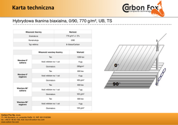 Karta techniczna Hybrydowa tkanina biaxialna, 0/90, 770 g/m2, UB, TS ————————————————————————————————————————————————————————————————————Własność tkaniny Wartość Gramatura 770 g/m2 +/- 5% Konstrukcja 0/90 Typ włókna E-Glass/Carbon Warstwa 0° szklana Warstwa 0° węglowa Warstwa 90° szklana Warstwa 90° węglowa Własność warstwy tkaniny Wartość Tex 1200 tex Ilość włókien na 1 cal 6 gg Gramatura 283g/m2 Tex 800 tex Ilość włókien na 1 cal 6 gg Gramatura 189 g/m2 Tex 600 tex Ilość włókien na 1 cal 7 gg Gramatura 165 g/m2 Tex 800 tex Ilość włókien na 1 cal 4 gg Gramatura 126 g/m2 Carbon Fox Sp. z o.o. 71-149 Szczecin, ul. Leopolda Staffa 12, NIP: 8513162396 tel.: +48 91 46 00 108, mail: [email protected] www.carbon-fox.com Carbon Fox Sp. z o.o. 71-149 Szczecin, ul. Leopolda Staffa 12, NIP: 8513162396 tel.: +48 91 46 00 108, mail: [email protected] www.carbon-fox.com Właściwość nici 1 Wartość Materiał nici Poliester teksturowany DTex 78 Ilość włókien na 1 cal 6 gg Długość ściegu 2,5 mm Typ ściegu Trykotowy Gramatura 7 g/m2 Właściwość nici 2 Wartość Materiał nici Niskotopliwy poliester DTex 110 Ilość włókien na 1 cal 1 gg Długość ściegu 2,5 mm Typ ściegu Trykotowy Gramatura 2 g/m2