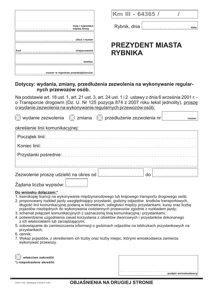 Km III - 64365 / imiê i nazwisko nazwa firmy / Rybnik, dnia data ulica i numer kod miejscowoœæ PREZYDENT MIASTA RYBNIKA telefon numer w rejestrze przedsiêbiorców Dotyczy: wydania, zmiany, przed³u¿enia zezwolenia na wykonywanie regularnych przewozów osób. Na podstawie art. 18 ust. 1, art. 21 ust. 3, art. 24 ust. 1 i 2 ustawy z dnia 6 wrzeœnia 2001 r. o Transporcie drogowm (Dz. U. Nr 125 pozycja 874 z 2007 roku tekst jednolity), proszê o wydanie zezwolenia na wykonywanie regularnych przewozów osób: wydanie zezwolenia zmiana przed³u¿enie zezwolenia nr numer okreœlenie linii komunikacyjnej: Pocz¹tek linii: Koniec linii: Przystanki poœrednie: Zezwolenie proszê udzieliæ na okres od do ¯¹dana liczba wypisów: Do wniosku do³¹czam:* 1. kserokopiê licencji na wykonywanie miêdzynarodowego lub krajowego transportu drogowego osób; 2. proponowany rozk³ad jazdy uwzglêdniaj¹cy przystanki, godziny odjazdów œrodków transportowych, d³ugoœæ linii komunikacyjnej podan¹ w kilometrach, odleg³oœci miêdzy przystankami, kursy oraz liczbê pojazdów niezbêdnych do wykonywania codziennych przewozów zgodnie z rozk³adem jazdy; 3. schemat po³¹czeñ komunikacyjnych z zaznaczon¹ lini¹ komunikacyjn¹ i przystankami; 4. potwierdzenie uzgodnienia zasad korzystania z obiektów dworcowych i przystanków dokonanego z ich w³aœcicielami lub zarz¹dzaj¹cymi; 5. zobowi¹zanie do zamieszczenia informacji o godzinach odjazdów na tabliczkach przystankowych na przystankach; 6. cennik; 7. Wykaz pojazdów, z okreœleniem ich liczby oraz liczby miejsc, którymi wnioskodawca zamierza wykonywaæ przewozy. w³aœciwe zakreœliæ *) niepotrzebne skreœliæ podpis wnioskodawcy KK £K KK KmIII 7 (1/2) - aktualizacja 15.03.2011 (J.W.) OBJAŒNIENIA NA DRUGIEJ STRONIE WYDANIE ZEZWOLENIA NA WYKONYWANIE REGULARNYCH PRZEWOZÓW OSÓB - OBJAŒNIENIA 1. Za wydanie zezwolenia pobiera siê op³atê zgodnie z § 13 pkt. 1 rozporz¹dzenia Ministra Infrastruktury z dnia 4 grudnia 2007 r. w sprawie wysokoœci op³at za czynnoœci administracyjne zwi¹zane z wykonywaniem przewozu drogowego oraz egzaminowanie i wydanie certyfikatu kompetencji zawodowych (Dz. U. z 2007 Nr 235 poz 1726), oraz § 1 rozporz¹dzenia Ministra Infrastruktury z dnia 23 grudnia 2003 r. w sprawie stawek op³at uiszczanych przez przewoŸników drogowych za czynnoœci zwi¹zane z opracowaniem analizy sytuacji rynkowej w zakresie krajowego regularnego przewozu osób. Wp³aty nale¿y dokonaæ na konto Urzêdu Miasta Rybnika ul. Boles³awa Chrobrego 2, 44-200 Rybnik, Nr: 20 1140 1179 0000 2224 1800 1003 BRE Bank Oddzia³ Korporacyjny Rybnik, z dopiskiem “Za wydanie zezwolenia - R”. 2. Wniosek wraz z za³¹cznikami nale¿y z³o¿yæ w Kancelarii Urzêdu Miasta (parter, przy wejœciu). 3. Szczegó³owe informacje oraz formularze s¹ do pobrania w Wydziale Komunikacji Urzêdu Miasta Rybnika (parter, pokój 056), tel. 32 439 20 56. Regulacja prawna: 1. Na podstawie ustawy z dnia 6 wrzeœnia 2001 r. - o Transporcie drogowym (Dz. U. Nr 125 pozycja 874 z 2007 roku tekst jednolity); 2. Rozporz¹dzenia Ministra Infrastruktury z dnia 5 lipca 2004 r. - W sprawie okreœlenia wysokoœci op³at za czynnoœci administracyjne zwi¹zane z wykonywaniem transportu drogowego oraz za egzaminowanie i wydawanie certyfikatu kompetencji zawodowych (Dz. U. Nr 159, pozycja 1664 z 2004 r.). 3. Rozporz¹dzenia Ministra Infrastruktury z dnia 23 grudnia 2003 r. - W sprawie stawek op³at uiszczanych przez przewoŸników drogowych za czynnoœci zwi¹zane z opracowaniem analizy sytuacji rynkowej w zakresie krajowego regularnego przewozu osób (Dz. U. Nr 232, pozycja 2331 z 2003 r.). KK £K Potwierdzam odbiór zezwolenia * oraz wypisów* w iloœci * nieporzebne skreœliæ KmIII 7 (2/2) - aktualizacja 15.03.2011 (J.W.) sztuk w dniu data czytelny podpis