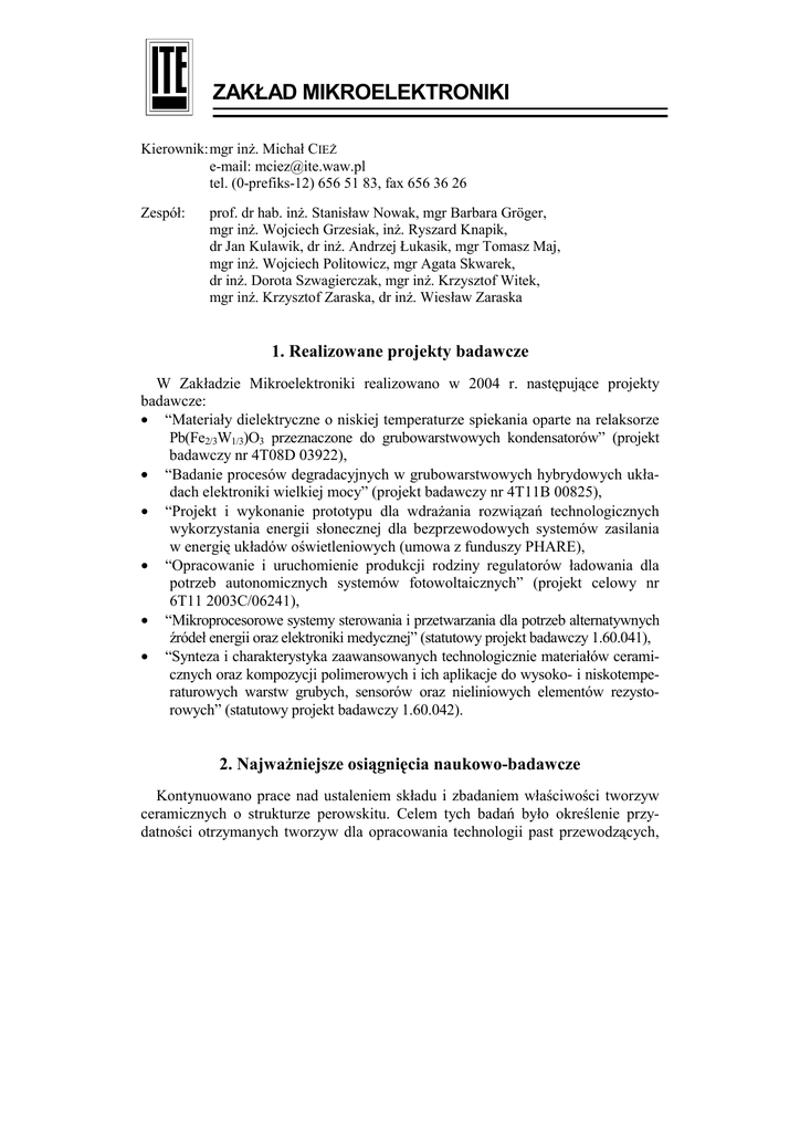 ZAKŁAD MIKROELEKTRONIKI Kierownik:mgr inż. Michał CIEŻ e-mail: [email protected] tel. (0-prefiks-12) 656 51 83, fax 656 36 26 Zespół: prof. dr hab. inż. Stanisław Nowak, mgr Barbara Gröger, mgr inż. Wojciech Grzesiak, inż. Ryszard Knapik, dr Jan Kulawik, dr inż. Andrzej Łukasik, mgr Tomasz Maj, mgr inż. Wojciech Politowicz, mgr Agata Skwarek, dr inż. Dorota Szwagierczak, mgr inż. Krzysztof Witek, mgr inż. Krzysztof Zaraska, dr inż. Wiesław Zaraska 1. Realizowane projekty badawcze W Zakładzie Mikroelektroniki realizowano w 2004 r. następujące projekty badawcze: • “Materiały dielektryczne o niskiej temperaturze spiekania oparte na relaksorze Pb(Fe2/3W1/3)O3 przeznaczone do grubowarstwowych kondensatorów” (projekt badawczy nr 4T08D 03922), • “Badanie procesów degradacyjnych w grubowarstwowych hybrydowych układach elektroniki wielkiej mocy” (projekt badawczy nr 4T11B 00825), • “Projekt i wykonanie prototypu dla wdrażania rozwiązań technologicznych wykorzystania energii słonecznej dla bezprzewodowych systemów zasilania w energię układów oświetleniowych (umowa z funduszy PHARE), • “Opracowanie i uruchomienie produkcji rodziny regulatorów ładowania dla potrzeb autonomicznych systemów fotowoltaicznych” (projekt celowy nr 6T11 2003C/06241), • “Mikroprocesorowe systemy sterowania i przetwarzania dla potrzeb alternatywnych źródeł energii oraz elektroniki medycznej” (statutowy projekt badawczy 1.60.041), • “Synteza i charakterystyka zaawansowanych technologicznie materiałów ceramicznych oraz kompozycji polimerowych i ich aplikacje do wysoko- i niskotemperaturowych warstw grubych, sensorów oraz nieliniowych elementów rezystorowych” (statutowy projekt badawczy 1.60.042). 2. Najważniejsze osiągnięcia naukowo-badawcze Kontynuowano prace nad ustaleniem składu i zbadaniem właściwości tworzyw ceramicznych o strukturze perowskitu. Celem tych badań było określenie przydatności otrzymanych tworzyw dla opracowania technologii past przewodzących, 2 Zakład Mikroelektroniki służących do wytwarzania warstw elektrodowych w ogniwach elektrochemicznych i past dielektrycznych do wytwarzania kondensatorów typu II. W ramach badań tworzyw warystorowych przeprowadzono dokładne cechowanie stabilizacji termicznej warystorów z układem fazy ciekłej Bi2O3/B2O3. Podjęto badania stabilności długookresowej przy obciążeniu elektrycznym. Wstępne wyniki tych badań umożliwiły zawężenie grup składów kompozycji warystorowych do ośmiu tworzyw. W pracach nad rozwiązaniami układowymi dla systemów fotowoltaicznych i elektroniki medycznej opracowano pierwszy w kraju model regulatora ładowania akumulatorów wykorzystujący algorytm wyszukiwania punktu mocy maksymalnej (MPPT) oraz zaprojektowano i wykonano model neurostymulatora żołądka. Rozwiązanie wykorzystujące algorytm MPPT podnosi efektywność autonomicznych systemów fotowoltaicznych. W zakresie kompozytowych tworzyw polimerowowęglowych prace badawcze były ukierunkowane na opracowanie tworzyw o wysokich wartościach temperaturowego współczynnika rezystancji (TWR) i ich możliwościach aplikacyjnych. 2.1. Materiały ceramiczne o strukturze perowskitu na bazie Mn i Al z przeznaczeniem na elektrody ogniw elektrochemicznych i czujników gazów Celem badań było: • poszukiwanie nowych przewodzących materiałów ceramicznych na elektrody ogniw stałych jako alternatywy drogiej platyny, • wykorzystanie materiałów otrzymanych w I etapie pracy do wytworzenia past grubowarstwowych i charakterystyka warstw elektrodowych wykonanych z tych past. Materiały elektrodowe powinny spełnić następujące wymagania: • mieszane przewodnictwo jonowo-elektronowe, • temperaturowy współczynnik rozszerzalności liniowej materiału porównywalny z α podłoża, • katalityczny wpływ na redukcję tlenu, • brak reakcji z podłożem, • odporność termiczna i chemiczna, • porowatość. Wymagania te spełnia droga platyna i niektóre złożone tlenki metali o strukturze perowskitu o ogólnym wzorze ABO3. Badania wykonane w II etapie prac obejmowały: • opracowanie składu i metodyki wytwarzania past z materiałów o strukturze perowskitu o składzie La0,7R0,3(Mn1-xAlx)O3 (R = Dy, Ca; x = 0,3); • dobór szkliw wprowadzanych do past na podstawie obserwacji w mikroskopie grzewczym; Zakład Mikroelektroniki 3 • dobór warunków nanoszenia i wypalania warstw na podłożach Al2O3 i YSZ (tlenek cyrkonu stabilizowany itrem); • analizę rentgenowską składu fazowego i mikrostruktury opracowanych warstw przy użyciu mikroskopu skaningowego; • pomiar rezystywności w zakresie temperatur 25 ÷ 900°C; • pomiary SEM ogniw z elektrodami perowskitowymi w temperaturze 600 ÷ 900°C. Warstwy otrzymano przez ucieranie w moździerzu naważonych w odpowiednich proporcjach następujących składników: • przewodzących tlenków o strukturze perowskitu: La0,7Dy0,3MnO3; La0,7Ca0,3MnO3; La0,7Dy0,3(Mn0,7Al0,3)O3; La0,7Ca0,3(Mn0,7Al0,3)O3; • szkliwa (termisil); • nośnika organicznego (10% roztwór etylocelulozy w terpineolu); • rozcieńczalnika. Pasty nanoszono sitodrukiem przez sito stalowe 260 mesh na dwa rodzaje podłoży: alundowe (96% Al2O3) do testów rezystywności oraz YSZ do pomiaru SEM ogniw stałych. Obróbka termiczna naniesionych warstw polegała na suszeniu na wolnym powietrzu przez 15 min. i w temperaturze 125°C przez 15 min. oraz na wypalaniu w ciągu 45 min. w VI-strefowym piecu BTU w temperaturze maksymalnej 980°C (czas przebywania w piku temperaturowym ok. 10 min.). Grubość warstw po wypaleniu wynosiła 10 ÷ 12 µm. Analiza rentgenowska potwierdziła otrzymanie związków o strukturze perowskitu. Na podstawie obserwacji w mikroskopie skaningowym stwierdzono prawidłową, jednorodną i porowatą mikrostrukturę warstw, pozbawioną pęknięć i kraterów. Współpraca warstw perowskitowych z elektrolitem stałym jest dobra, warstwy dobrze przylegają