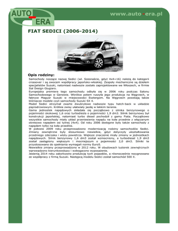 www.auto - era.pl FIAT SEDICI (2006-2014) Opis rodziny: Samochody noszące nazwę Sedici (wł. Szesnaście, gdyż 4x4=16) należą do kategorii crossover i są owocem współpracy japońsko-włoskiej. Zespoły mechaniczne są dziełem specjalistów Suzuki, natomiast nadwozie zostało zaprojektowane we Włoszech, w firmie Ital Design Giugiaro. Europejska premiera tego samochodu odbyła się w 2006 roku podczas Salonu Samochodowego w Genewie. Wkrótce potem ruszyła jego produkcja na Węgrzech, w fabryce Magyar Suzuki w miejscowości Esztergom. Na Węgrzech powstają także bliźniacze modele czyli samochody Suzuki SX 4. Model Sedici otrzymał zwarte dwubryłowe nadwozie typu hatch-back w układzie pięciodrzwiowym. Krótkie zwisy ułatwiały jazdę w lekkim terenie. Gama jednostek napędowych składała się początkowo z silnika benzynowego o pojemności skokowej 1,6 oraz turbodiesla o pojemności 1,9 dm3. Silnik benzynowy był konstrukcji japońskiej, natomiast turbo diesel pochodził z gamy Fiata. Początkowo wszystkie samochody miały układ przeniesienia napędu na koła przednie z włączanym okresowo napędem osi tylnej (4x4). Od roku 2006 dostępne były także samochody z napędem tylko na koła przednie. W połowie 2009 roku przeprowadzono modernizację rodziny samochodów Sedici. Zmiany zewnętrzne były stosunkowo niewielkie, gdyż dotyczyły ukształtowania przedniego zderzaka i wlotu powietrza. Większe znaczenie miały zmiany w jednostkach napędowych. Silnik benzynowy 1,6 dm3 został wzmocniony, a turbodiesel 1,9 dm3 został zastąpiony większym i mocniejszym o pojemności 2,0 dm3. Silniki te przystosowano do spełniania wymagań normy Euro5. Niewielkie zmiany przeprowadzono w 2012 roku. W obudowach lusterek zewnętrznych wprowadzono kierunkowskazy i wzbogacono wyposażenie. Jesienią 2014 roku zakończono produkcję tych pojazdów, a równocześnie rezygnowano ze współpracy z firmą Suzuki. Następcą modelu Sedici został samochód 500 X.