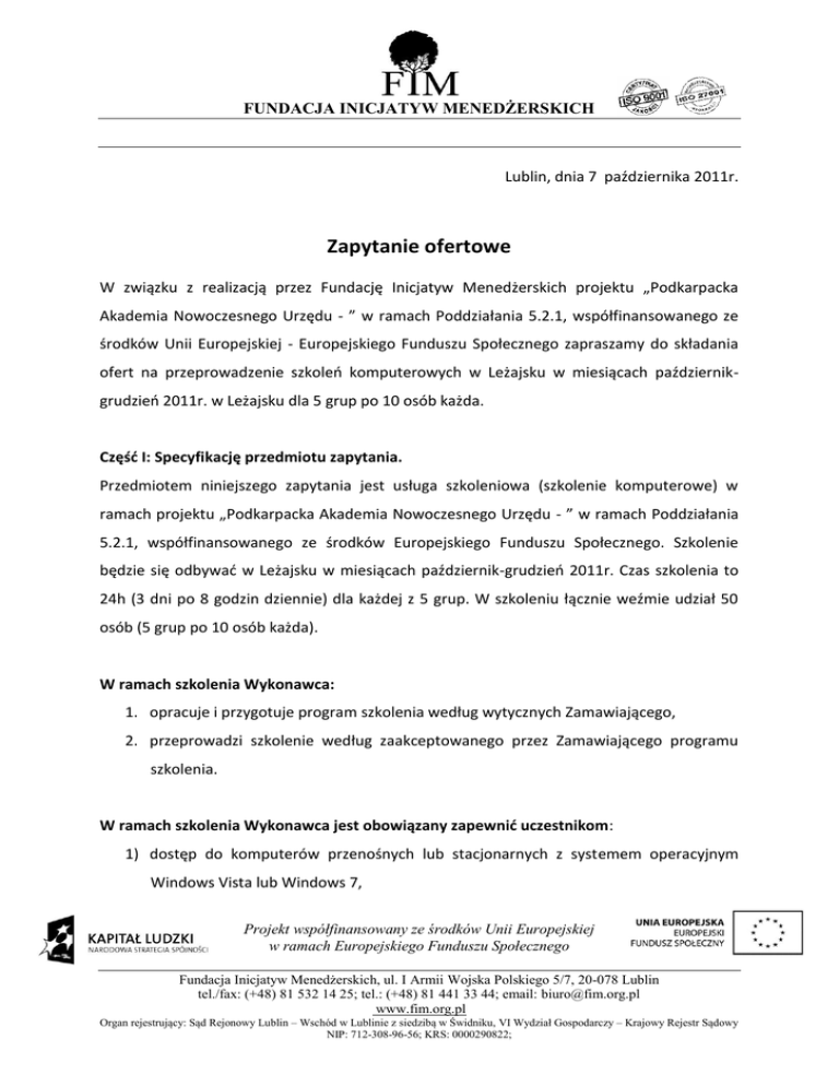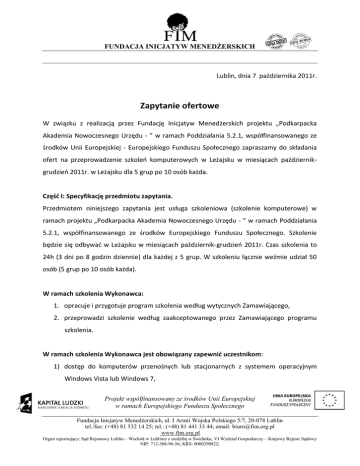 FUNDACJA INICJATYW MENEDŻERSKICH Lublin, dnia 7 października 2011r. Zapytanie ofertowe W związku z realizacją przez Fundację Inicjatyw Menedżerskich projektu „Podkarpacka Akademia Nowoczesnego Urzędu - ” w ramach Poddziałania 5.2.1, współfinansowanego ze środków Unii Europejskiej - Europejskiego Funduszu Społecznego zapraszamy do składania ofert na przeprowadzenie szkoleo komputerowych w Leżajsku w miesiącach październikgrudzieo 2011r. w Leżajsku dla 5 grup po 10 osób każda. Częśd I: Specyfikację przedmiotu zapytania. Przedmiotem niniejszego zapytania jest usługa szkoleniowa (szkolenie komputerowe) w ramach projektu „Podkarpacka Akademia Nowoczesnego Urzędu - ” w ramach Poddziałania 5.2.1, współfinansowanego ze środków Europejskiego Funduszu Społecznego. Szkolenie będzie się odbywad w Leżajsku w miesiącach październik-grudzieo 2011r. Czas szkolenia to 24h (3 dni po 8 godzin dziennie) dla każdej z 5 grup. W szkoleniu łącznie weźmie udział 50 osób (5 grup po 10 osób każda). W ramach szkolenia Wykonawca: 1. opracuje i przygotuje program szkolenia według wytycznych Zamawiającego, 2. przeprowadzi szkolenie według zaakceptowanego przez Zamawiającego programu szkolenia. W ramach szkolenia Wykonawca jest obowiązany zapewnid uczestnikom: 1) dostęp do komputerów przenośnych lub stacjonarnych z systemem operacyjnym Windows Vista lub Windows 7, Projekt współfinansowany ze środków Unii Europejskiej w ramach Europejskiego Funduszu Społecznego Fundacja Inicjatyw Menedżerskich, ul. I Armii Wojska Polskiego 5/7, 20-078 Lublin tel./fax: (+48) 81 532 14 25; tel.: (+48) 81 441 33 44; email: [email protected] www.fim.org.pl Organ rejestrujący: Sąd Rejonowy Lublin – Wschód w Lublinie z siedzibą w Świdniku, VI Wydział Gospodarczy – Krajowy Rejestr Sądowy NIP: 712-308-96-56; KRS: 0000290822; FUNDACJA INICJATYW MENEDŻERSKICH 2) nielimitowany dostęp do Internetu min. 2 Mb/s , 3) dostęp do programów: WORD, EXCEL, Power Point, CORELL, Windows Server, GPO, IIS, AD, WSUS., w najnowszych wersjach, 4) salę w miejscowości Leżajsk, przystosowaną do przeprowadzenia szkolenia komputerowego dla 10 osób na raz, 5) ciepły posiłek-obiad, w każdym dniu szkolenia, dla wszystkich uczestników szkolenia, 6) poczęstunek kawa, herbata, ciastka, 7) materiały szkoleniowe, 8) osobę, posiadająca doświadczenie w przeprowadzaniu szkolenia, która przeprowadzi merytoryczne szkolenie. Tematyka ww. szkolenia: 1) nauka obsługi programów: WORD, EXCEL, Power Point, CORELL, Windows Server, GPO, IIS, AD, WSUS. Częśd II: Wymagania wobec oferenta. O realizację ww. usługi mogą się ubiegad osoby, które posiadają wiedzę oraz przeprowadziły minimum 1 szkolenie z zakresu obsługi ww. programów w ciągu ostatnich 2 latach. Częśd III: Sposoby porozumiewania się z zamawiającym. Ewentualne pytania proszę kierowad do: Berty Węgorek lub Kamila Szeredy ul. I Armii Wojska Polskiego 5/7 20-078 Lublin tel./fax: (+48)81 532 14 25, (+48)81 441 33 44 [email protected]; [email protected] Projekt współfinansowany ze środków Unii Europejskiej w ramach Europejskiego Funduszu Społecznego Fundacja Inicjatyw Menedżerskich, ul. I Armii Wojska Polskiego 5/7, 20-078 Lublin tel./fax: (+48) 81 532 14 25; tel.: (+48) 81 441 33 44; email: [email protected] www.fim.org.pl Organ rejestrujący: Sąd Rejonowy Lublin – Wschód w Lublinie z siedzibą w Świdniku, VI Wydział Gospodarczy – Krajowy Rejestr Sądowy NIP: 712-308-96-56; KRS: 0000290822; FUNDACJA INICJATYW MENEDŻERSKICH 1. Wszelkiego rodzaju oferty, oświadczenia, zapytania, zawiadomienia, informacje itp. (dalej, zbiorczo, „Korespondencja”) Zamawiający i Wykonawcy przekazują w formie pisemnej, telefonicznie lub drogą elektroniczną na podany powyżej adres email. Częśd IV: Termin składania ofert. Oferty, wg wzoru formularza ofertowego stanowiącego załącznik 1, należy składad do dnia 17 października 2011 r. do godziny 10.00: osobiście lub za pośrednictwem poczty tradycyjnej na adres Zamawiającego wskazany w stopce Zapytania Ofertowego. Częśd V: Sposób przygotowania i składania ofert. 1. Oferta powinna byd sporządzona w języku polskim. 2. Oferta powinna zawierad oświadczenie Wykonawcy, że jest związany ofertą przez okres 1 miesiąca od dnia, w którym upływa termin składania ofert. 3. Oferta powinna zawierad w szczególności (wg. wzoru formularza ofertowego stanowiącego załącznik nr. 1). a) kosztorys ofertowy - cenę brutto (z VAT) usług wskazanych w Części I zapytania w przeliczeniu na jedno szkolenie (jedną grupę szkoleniową w wymiarze 24 godzin ), b) wykaz wykonanych usług wg załączonego formularza ofertowego. 4. Wykonawcy ponoszą wszelkie koszty związane z przygotowaniem i złożeniem oferty. 5. Oferty złożone po terminie oznaczonym w pkt. 1 zostaną pozostawione bez merytorycznego ich rozpatrzenia. 6. Oferent może – przed upływem terminu składania ofert – zmienid bądź wycofad ofertę. Projekt współfinansowany ze środków Unii Europejskiej w ramach Europejskiego Funduszu Społecznego Fundacja Inicjatyw Menedżerskich, ul. I Armii Wojska Polskiego 5/7, 20-078 Lublin tel./fax: (+48) 81 532 14 25; tel.: (+48) 81 441 33 44; email: [email protected] www.fim.org.pl Organ rejestrujący: Sąd Rejonowy Lublin – Wschód w Lublinie z siedzibą w Świdniku, VI Wydział Gospodarczy – Krajowy Rejestr Sądowy NIP: 712-308-96-56; KRS: 0000290822; FUNDACJA INICJATYW MENEDŻERSKICH Częśd VI: Kryteria i sposób wyboru najkorzystniejszej oferty. 1. Komisyjna ocena ofert nastąpi w dniu 18 października 2011 r., a informacja o wynikach i wyborze najkorzystniejszej oferty zostanie wysłana pocztą mailową. 2. Oferty zostaną ocenione pod względem stawianych im w niniejszym zapytaniu ofertowym wymogów formalnych oraz merytorycznych. W przypadku, gdy oferta nie będzie spełniad wymogów formalnych zostanie odrzucona. Z tytułu odrzucenia oferty, Oferentom 