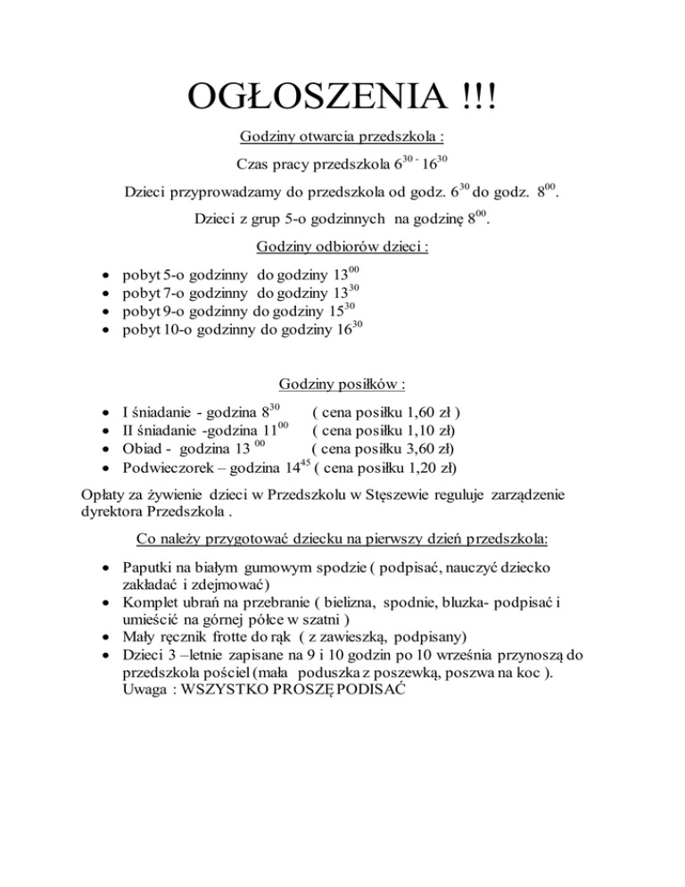 OGŁOSZENIA !!! Godziny otwarcia przedszkola : Czas pracy przedszkola 630 - 1630 Dzieci przyprowadzamy do przedszkola od godz. 630 do godz. 800. Dzieci z grup 5-o godzinnych na godzinę 800. Godziny odbiorów dzieci : pobyt 5-o godzinny do godziny 1300 pobyt 7-o godzinny do godziny 1330 pobyt 9-o godzinny do godziny 1530 pobyt 10-o godzinny do godziny 1630 Godziny posiłków : I śniadanie - godzina 830 ( cena posiłku 1,60 zł ) 00 II śniadanie -godzina 11 ( cena posiłku 1,10 zł) 00 Obiad - godzina 13 ( cena posiłku 3,60 zł) 45 Podwieczorek – godzina 14 ( cena posiłku 1,20 zł) Opłaty za żywienie dzieci w Przedszkolu w Stęszewie reguluje zarządzenie dyrektora Przedszkola . Co należy przygotować dziecku na pierwszy dzień przedszkola: Paputki na białym gumowym spodzie ( podpisać, nauczyć dziecko zakładać i zdejmować) Komplet ubrań na przebranie ( bielizna, spodnie, bluzka- podpisać i umieścić na górnej półce w szatni ) Mały ręcznik frotte do rąk ( z zawieszką, podpisany) Dzieci 3 –letnie zapisane na 9 i 10 godzin po 10 września przynoszą do przedszkola pościel (mała poduszka z poszewką, poszwa na koc ). Uwaga : WSZYSTKO PROSZĘ PODISAĆ Zasady naliczania odpłatności za przedszkole : Reguluje Ustawa o Systemie Oświaty Uchwała nr XXIX/262 /2013 Rady Miejskiej Gminy Stęszew z dnia 5 września 2013r w sprawie określenia czasu bezpłatnego pobytu dziecka w przedszkolu oraz opłat za świadczenia udzielane przez przedszkola prowadzone przez gminę Stęszew Realizacja podstawy programowej w Przedszkolu w Stęszewie odbywa się w godzinach 800-1300, pobyt dzieci w tych godzinach jest darmowy Pozostałe godziny pobytu dziecka kosztują 1,00 zł/1 godz. Stawka godzinowa odpłatności za przedszkole naliczana jest według godzin zdeklarowanych przez rodziców. Zmiany godzin pobytu dziecka w przedszkolu można dokonać tylko w wyjątkowych, uzasadnionych sytuacjach do 25 dnia każdego miesiąca poprzedzającego zmianę. Płacimy za przedszkole za miesiąc bieżący, natomiast zwrot za dni, w których dziecko nie było w przedszkolu, odliczany jest w miesiącu kolejnym Płatności należy regulować na konto banku GBS Mosina nr konta 70 9048 0007 2003 0013 7605 0001 Na początku września ( do 5 ) otrzymają państwo kartki z numerem konta i kwotą do zapłaty . Bardzo prosimy o dokładne sprawdzenie kwoty przy dokonywaniu wpłaty oraz właściwe jej opisanie.