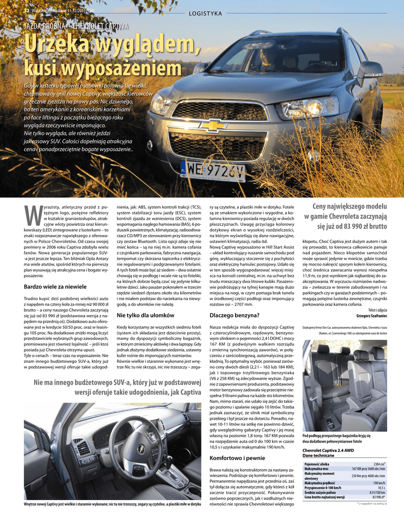 32 | Wiadomości Handlowe 11-12/2011 (110) LOGIST YK A JAZDA PRÓBNA – CHEVROLET CAPTIVA Urzeka wyglądem, kusi wyposażeniem Gdy w lusterku typowej osobówki pojawia się wielki, chromowany grill nowej Captivy, większość kierowców grzecznie zjeżdża na prawy pas. Nic dziwnego, bo ten amerykanin z koreańskimi korzeniami po face liftingu z początku bieżącego roku wygląda rzeczywiście imponująco. Nie tylko wygląda, ale również jeździ jak rasowy SUV. Całości dopełniają atrakcyjna cena i ponadprzeciętnie bogate wyposażenie.. W yrazisty, atletyczny przód z po tężnym logo, potężne reflektory w kształcie graniastosłupów, atrak cyjne wloty powietrza oraz kierun kowskazy (LED) zintegrowane z lusterkami – to znaki rozpoznawcze największego z oferowa nych w Polsce Chevroletów. Od czasu swojej premiery w 2006 roku Captiva zdobyła wielu fanów. Nowa generacja popularnego SUV ‑a jest jeszcze lepsza. Ten bliźniak Opla Antary ma wiele atutów, spośród których na pierwszy plan wysuwają się atrakcyjna cena i bogate wy posażenie. Bardzo wiele za niewiele Trudno kupić dziś podobnej wielkości auto z napędem na cztery koła za mniej niż 90 000 zł brutto – a ceny naszego Chevroleta zaczynają się już od 83 990 zł (podstawowa wersja z na pędem na przednią oś). Dodatkowo auto ofero wane jest w kredycie 50/50 proc. oraz w leasin gu 105 proc. Na dodatkowe zniżki mogą liczyć przedstawiciele wybranych grup zawodowych, premiowana jest również lojalność – jeśli ktoś posiada już Chevroleta otrzyma upust. Tyle o cenach – teraz czas na wyposażenie. Nie znam innego budżetowego SUV‑a, który już w podstawowej wersji oferuje takie udogod nienia, jak: ABS, system kontroli trakcji (TCS), system stabilizacji toru jazdy (ESC), system kontroli zjazdu ze wzniesienia (DCS), system wspomagania nagłego hamowania (BAS), 6 po duszek powietrznych, klimatyzację, radioodtwa rzacz CD/MP3 ze sterowaniem przy kierownicy czy zestaw Bluetooth. Lista opcji zdaje się nie mieć końca – są na niej m.in. kamera cofania z czujnikami parkowania, fabryczna nawigacja, tempomat czy skórzana tapicerka z elektrycz nie regulowanymi i podgrzewanymi fotelami. A tych foteli może być aż siedem – dwa ostatnie chowają się w podłogę i wcale nie są to foteliki, na których dobrze będą czuć się jedynie kilku letnie dzieci. Jako pasażer pokonałem w trzecim rzędzie siedzeń dystans około stu kilometrów i nie miałem podstaw do narzekania na niewy godę, a do ułomków nie należę. ry są czytelne, a plastiki miłe w dotyku. Fotele są ze smakiem wykończone i wygodne, a ko lumna kierownicy posiada regulację w dwóch płaszczyznach. Uwagę przyciąga kolorowy dotykowy ekran o wysokiej rozdzielczości, na którym wyświetlają się dane nawigacyjne, ustawień klimatyzacji, radia itd. Nową Captivę wyposażono w Hill Start Assist – układ kontrolujący ruszanie samochodu pod górę, wykluczający stoczenie się z pochyłości oraz elektryczny hamulec postojowy. Udało się w ten sposób wygospodarować więcej miej sca na konsoli centralnej, m.in. na uchwyt bez trudu mieszczący dwa litrowe kubki. Pasażero wie podróżujący na tylnej kanapie mają dużo miejsca na nogi, w czym pomaga brak tunelu w środkowej części podłogi oraz imponujący rozstaw osi – 2707 mm. Nie tylko dla ułomków Dlaczego benzyna? Kiedy korzystamy ze wszystkich siedmiu foteli (system ich składania jest dziecinnie prosty), mamy do dyspozycji symboliczny bagażnik, w którym zmieścimy aktówkę i dwa laptopy. Gdy jednak złożymy dodatkowe siedzenia, ustawny kufer rośnie do imponujących rozmiarów. Równie wielkie i starannie wykonane jest wnę trze Nic tu nie skrzypi, nic nie trzeszczy – zega Nasza redakcja miała do dyspozycji Captivę z czterocylindrowym, rzędowym, benzyno wym silnikiem o pojemności 2,4 l DOHC i mocy 167 KM (z podwójnym wałkiem rozrządu i zmienną synchronizacją zaworów), w połą czeniu z sześciobiegową, automatyczną prze kładnią. To optymalny wybór, ponieważ zarów no ceny dwóch diesli (2,2 l – 163 lub 184 KM), jak i topowego trzylitrowego benzyniaka (V6 z 258 KM) są zdecydowanie wyższe. Zgod nie z zapewnieniami producenta, podstawowy motor benzynowy zadowala się przeciętnie nie spełna 9 litrami paliwa na każde sto kilometrów. Nam, mimo starań, nie udało się zejść do takie go poziomu i spalanie sięgało 10 litrów. Trzeba jednak zaznaczyć, że silnik miał symboliczny przebieg i był jeszcze na dotarciu. Ponadto, na wet 10‑11 litrów na setkę nie powinno dziwić, gdy uwzględnimy gabaryty Captivy i jej masę własną na poziomie 1,8 tony. 167 KM pozwala na rozpędzenie auta od 0 do 100 km w czasie 10,5 s i uzyskanie maksymalnie 190 km/h. Nie ma innego budżetowego SUV-a, który już w podstawowej wersji oferuje takie udogodnienia, jak Captiva Komfortowo i pewnie Wnętrze nowej Captivy jest wielkie i starannie wykonane; nic tu nie trzeszczy, zegary są czytelne, a plastiki miłe w dotyku Brawa należą się konstruktorom za nastawy za wieszenia. Podróżuje się komfortowo i pewnie. Permanentnie napędzana jest przednia oś, zaś tył dołącza się automatycznie, gdy któreś z kół zacznie tracić przyczepność. Pokonywanie zarówno poprzecznych, jak i wzdłużnych nie równości nie sprawia Chevroletowi większego Ceny największego modelu w gamie Chevroleta zaczynają się już od 83 990 zł brutto kłopotu. Choć Captiva jest dużym autem i tak się prowadzi, to kierowca całkowicie panuje nad pojazdem. Nieco kłopotów samochód może sprawić jedynie w mieście, gdzie trzeba się mocno nakręcić sporym kołem kierownicy, choć średnica zawracania wynosi niespełna 11,9 m, co jest wynikiem jak najbardziej do za akceptowania. W wyczuciu rozmiarów nadwo zia – zwłaszcza w terenie zabudowanym i na parkingach czy w garażach podziemnych – po magają potężne lusterka zewnętrzne, czujniki parkowania oraz kamera