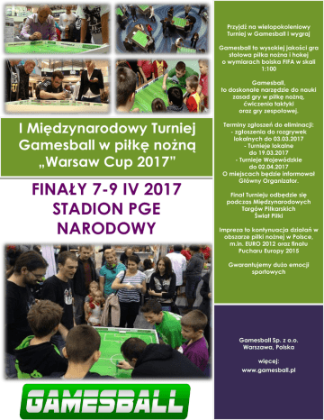 Przyjdź na wielopokoleniowy Turniej w Gamesball i wygraj Gamesball to wysokiej jakości gra stołowa piłka nożna i hokej o wymiarach boiska FIFA w skali 1:100 Gamesball, to doskonałe narzędzie do nauki zasad gry w piłkę nożną, ćwiczenia taktyki oraz gry zespołowej. I Międzynarodowy Turniej Gamesball w piłkę nożną „Warsaw Cup 2017” FINAŁY 7-9 IV 2017 STADION PGE NARODOWY Terminy zgłoszeń do eliminacji: - zgłoszenia do rozgrywek lokalnych do 03.03.2017 - Turnieje lokalne do 19.03.2017 - Turnieje Wojewódzkie do 02.04.2017 O miejscach będzie informował Główny Organizator. Finał Turnieju odbędzie się podczas Międzynarodowych Targów Piłkarskich Świat Piłki Impreza to kontynuacja działań w obszarze piłki nożnej w Polsce, m.in. EURO 2012 oraz finału Pucharu Europy 2015 Gwarantujemy dużo emocji sportowych Gamesball Sp. z o.o. Warszawa, Polska więcej: www.gamesball.pl