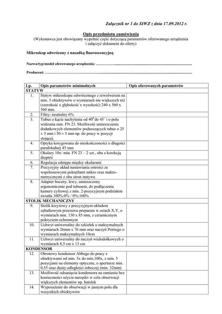 Załącznik nr 1 do SIWZ z dnia 17.09.2012 r. Opis przedmiotu zamówienia (Wykonawca jest obowiązany wypełnić część dotyczącą parametrów oferowanego urządzenia i załączyć dokument do oferty) Mikroskop odwrócony z nasadką fluoroscencyjną Nazwa/typ/model oferowanego urządzenia: ……………................................................................................... Producent: ……………………………………….................................................................................................. Lp. Opis parametrów minimalnych Opis oferowanych parametrów STATYW 1. Statyw mikroskopu odwróconego z rewolwerem na min. 5 obiektywów o wymiarach nie większych niż (szerokość x głębokość x wysokość) 240 x 560 x 560 mm. 2. Filtry: neutralny 6% 3. Tubus o kącie nachylenia od 400 do 45˚ i o polu widzenia min. FN 23. Możliwość umieszczenia dodatkowych elementów podnoszących tubus o 25 ± 5 mm i 50 ± 5 mm np. do pracy w pozycji stojącej. 4. Optyka korygowana do nieskończoności o długości parafokalnej 45 mm 5. Okulary 10x/ min. FN 23 – 2 szt., oba z korekcją dioptrii 6. Regulacja odstępu między okularami 7. Precyzyjny układ nastawiania ostrości ze współosiowymi pokrętłami mikro oraz makrometrycznymi z obu stron statywu 8. Adapter boczny, lewy, umieszczony ergonomicznie pod tubusem, do podłączenia kamery cyfrowej z min. 2-pozycyjnym podziałem światła 100%:0% / 0%:100% STOLIK MECHANICZNY 9. Stolik krzyżowy z precyzyjnym układem zębatkowym przesuwu preparatu w osiach X,Y, o wymiarach min. 130 x 85 mm, z ceramicznym pokryciem ochronnym 10. Uchwyt uniwersalny do szkiełek o maksymalnych wymiarach 26mm x 76 mm oraz naczyń Petriego o wymiarach maksymalnych 10cm 11. Uchwyt uniwersalny do naczyń wielodołkowych o wymiarach 8,5 cm x 13 cm KONDENSOR 12. Obrotowy kondensor Abbego do pracy z obiektywami od min. 5x do min.100x, z min. 5 pozycjami na elementy optyczne, o aperturze min. 0,55 oraz dużej odległości roboczej (min. 32mm) 13. Możliwość odsunięcia kondensora na ramieniu bez konieczności użycia narzędzi w celu obserwacji większych elementów np. butelek 14. Wyposażenie do obserwacji w jasnym polu dla wszystkich obiektywów Pełne wyposażenie do kontrastu fazowego dla obiektywów od 5x do 40x 16. Pełne wyposażenie do kontrastu reliefowego dla obiektywów 20x-40x, umożliwiającego obserwacje zarówno na szkle jak i w naczyniach plastikowych 17. Pełne wyposażenie do kontrastu DIC dla obiektywu 100x OŚWIETLENIE 18. Oświetlenie halogenowe o mocy min. 35W 19. Płynna regulacja natężenia światła OBIEKTYWY 20. Obiektywy planarne, korygowane na nieskończoność o powiększeniu/min. aperturze/min. odległości roboczej: - 5x/0,15/12mm PH1 - 10x/0,25/4,5mm PH1 - LD 20x/0,35/4,3mm (przy grubości dna preparatu D=1mm) PH1 - LD 40x/0,55/2mm (przy grubości dna preparatu D=1mm) PH2 - 100x/1,30/0,2mm olejowy, fluorytowy 15. WYPASAŻENIE DO FLUORESCENCJI 21. Wyposażenie do światła odbitego z wbudowaną przesłona polową oraz aperturową 22. Element obrotowy na min. 4 filtry fluorescencyjne 23. Układ kostek filtrów fluorescencyjnych montowany w rewolwerze obrotowym bez użycia narzędzi – szybka i prosta wymiana filtrów 24. Zestaw 3 pojedynczych filtrów fluorescencyjnych o parametrach (wzbudzenie, dzielnik światła, emisja): BP 330-370, 395, BP 420-470 BP 450-490, 495, BP 500-550 BP 540-552, 560, BP 575-640 Dopuszczamy zmiany zakresu ± 5 nm. 25. Oświetlacz do fluorescencji z lampą halogenkową o mocy co najmniej 120W (czas pracy min. 2000 godz.) z regulacją natężenia świecenia, podłączenie światłowodowe do statywu mikroskopu, wbudowana przesłona światła 26. Zasilacz z licznikiem czasu pracy lampy WYPASAŻENIE DODATKOWE 27. Antystatyczna osłona od kurzu 28. Kabel zasilający 29. Adapter mechaniczno-optyczny z optyką 0,60x ± 0,03 do podłączenia kamery KAMERA CYFROWA 30. Kolorowa kamera cyfrowa z gwintem typu C ze złączem typu FireWire/IEEE1394 31. Rozdzielczość min.: 2580 x 1930 pikseli 32. Chłodzenie w układzie Peltier 33. Głębia koloru min.: 36 bitów 34. Czasy ekspozycji regulowane w zakresie: 1ms – 60s 35. Funkcja biningu od min. 1x1 do min. 10x10 36. Wybór ręczny lub automatyczny parametrów ekspozycji. Tryb sterowania parametrami ekspozycji z komputera, podgląd obrazu w trybie „na żywo” na ekranie komputera OPROGRAMOWANIE DO ANALIZY OBRAZU pozwalające na wykonanie minimum 37. Oprogramowanie do analizy obrazu umożliwiające sterowanie funkcjami kamery pochodzące od producenta mikroskopu z możliwością zainstalowania na min. trzech komputerach. 38. Możliwość zapisania obrazu wraz z opisem w postaci bazy danych 39. Funkcje poprawy kontrastu, jasności, korekcja gamma, balans bieli, wygaszanie tła, funkcja wygładzania/wyostrzania 40. Import oraz eksport obrazów w standardowych rozszerzeniach 41. Opis obrazów: tekst, strzałki, wskaźniki, skala pomiarowa 42. Możliwość wielokanałowej rejestracji obrazów fluorescencyjnych (do kilku kanałów jednocześnie w jednym obrazie, możliwość niezależnego uaktywnienia lub nie każdego z kanałów) 43. Funkcje pomiarowe: pomiar długości, obwodu, powierzchni 44 Tworzenie raportów, przygotowywanie zdjęć i opisów do wydruku ZESTAW KOMPUTEROWY o parametrach nie gorszych niż 45. Procesor 4-rdzeniowy typu XEON 2,13GHz lub porównywalny Płyta główna 2-procesorowa 4GB RAM Karta graficzna 1GB Dwa dyski twarde 1TB w trybie RAID Karta FireWire Monitor 24” 1920x1080 Windows 7 Professional Bezprzewodowa klawiatura i myszka Gwarancja na komputer min. 36 miesięcy. POZOSTAŁE WYMAGANIA 46. Dostawa mikroskopu na III piętro budynku, instalacja i uruchomienie urządzeń wraz ze sprawdzeniem poprawności działania. 47. Instrukcje obsługi w języku polskim (pełne tłumaczenie wersji angielskojęzycznej) i angielskim, w formie drukowanej i na nośniku 48. Instruktaż dla min. 8 pracowników z obsługi mikros