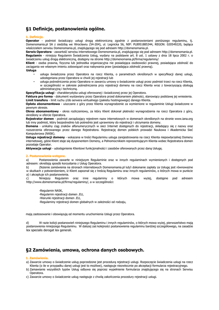 §1 Definicje, postanowienia ogólne. 1. Definicje. Operator - podmiot świadczący usługi drogą elektroniczną zgodnie z postanowieniami poniższego regulaminu, tj. Domenomania.pl SA z siedzibą we Wrocławiu (54-204), ul. Legnicka 56, NIP: PL8951885344, REGON: 020549220, będąca właścicielem serwisu Domenomania.pl, znajdującego się pod adresem http://domenomania.pl. Serwis Operatora - zawartość serwisu internetowego Domenomania.pl, znajdującego się pod adresem http://domenomania.pl. Regulamin - niniejszy Regulamin Świadczenia Usług, wydany na podstawie art. 8 ust. 1 ustawy z dnia 18 lipca 2002 r. o świadczeniu usług drogą elektroniczną, dostępny na stronie http://domenomania.pl/firma/regulaminy/ Klient - osoba prawna, fizyczna lub jednostka organizacyjna nie posiadająca osobowości prawnej, posiadająca zdolność do zaciągania we własnym imieniu zobowiązań oraz nabywania praw (posiadająca zdolność prawną). Usługa • usługa świadczona przez Operatora na rzecz Klienta, o parametrach określonych w specyfikacji danej usługi, udostępniana przez Operatora w chwili jej rejestracji lub • usługa pośredniczenia przez Operatora w zawarciu umowy o świadczenie usługi przez podmiot trzeci na rzecz Klienta, w szczególności w zakresie pośredniczenia przy rejestracji domeny na rzecz Klienta wraz z towarzyszącą obsługą administracyjną i techniczną. Specyfikacja usługi - charakterystyka usługi oferowanej i świadczonej przez jej Operatora. Faktura pro forma - dokument wystawiany przez Operatora przed dokonaniem płatności, stanowiący podstawę jej wniesienia. Limit transferu - limit ruchu z/do serwera wirtualnego (pakietu hostingowego) danego Klienta. Opłata abonamentowa - uiszczane z góry przez Klienta wynagrodzenie za wymienione w regulaminie Usługi świadczone w pewnym okresie. Okres abonamentowy - okres rozliczeniowy, za który Klient dokonał płatności wynagrodzenia na rzecz Operatora z góry, określony w ofercie Operatora. Rejestrator domen - podmiot zarządzający rejestrem nazw internetowych w domenach określonych na stronie www.iana.org lub inny podmiot, który bezpośrednio lub pośrednio jest uprawniony do rejestracji i utrzymania domeny. Domena - unikalny ciąg znaków alfanumerycznych w sieci Internet dostępnych do rejestracji, składający się z nazwy oraz rozszerzenia oferowanego przez danego Rejestratora. Rejestrację domen polskich prowadzi Naukowa i Akademicka Sieć Komputerowa (NASK). Usługa rejestracji domeny - wskazana w treści Regulaminu usługa zarejestrowania na rzecz Klienta niepowtarzalnej Domeny internetowej, gdzie Klient staje się dysponentem Domeny, a Pełnomocnikiem reprezentującym Klienta wobec Rejestratora domen pozostaje Operator. Aktywacja usługi - udostępnienie Klientowi funkcjonalności i zasobów oferowanych przez daną Usługę. 2. Postanowienia wstępne. a) Postanowienia zawarte w niniejszym Regulaminie oraz w innych regulaminach wymienionych i adresem: określają sposób korzystania z Usług Operatora. b) Złożenie zamówienia na stronach internetowych Domenomania.pl lub/i dokonanie zapłaty za Usługę w skutkach z potwierdzeniem, iż Klient zapoznał się z treścią Regulaminu oraz innych regulaminów, o których a) i akceptuje ich postanowienia. c) Niniejszy Regulamin oraz inne regulaminy o których mowa wyżej, dostępne http://www.domenomania.pl/firma/regulaminy/, a w szczególności: dostępnych pod jest równoważne mowa w punkcie pod adresem -Regulamin NASK, -Regulamin rejestracji domen .EU, -Warunki rejestracji domen .EU, -Regulaminy rejestracji domen globalnych w zależności od rodzaju, mają zastosowanie i obowiązują od momentu uruchomienia Usługi przez Operatora. d) W razie kolizji postanowień niniejszego Regulaminu i innych regulaminów, o których mowa wyżej, pierwszeństwo mają postanowienia niniejszego Regulaminu. W dalszej zaś kolejności postanowienia regulaminu bardziej szczegółowego, na zasadzie lex specialis derogat lex generali. §2 Zamówienia, umowa, ochrona danych osobowych. 1. Zamówienia. a) Zawarcie umowy o świadczenie usług poprzedzone jest procedurą rejestracji usługi. Rozpoczęcie świadczenia usługi na rzecz Klienta (o ile w przypadku danej usługi jest to możliwe), następuje niezwłocznie po akceptacji formularza rejestracyjnego. b) Zamawianie wszystkich typów Usług odbywa się poprzez wypełnienie formularza znajdującego się na stronach Serwisu Operatora. c) Zawarcie umowy o świadczenie usług następuje z chwilą zakończenia procedury rejestracji usługi. d) Umowa jest zawierana na czas okresu abonamentowego. e) Aktywacja zamówionych Usług następuje w momencie zaksięgowania wpłaty na koncie bankowym Operatora (Domenomania.pl SA, ul. Legnicka 56, 54-204 Wrocław, mBank SA, nr: 91 1140 1140 0000 2167 8400 1001) lub po przesłaniu (faksem na numer 71 716 47 05 lub e-mailem na adres [email protected]) potwierdzenia dokonanej wpłaty przez Klienta. f) Klient, aktywując Usługę, oświadcza, że nazwa, którą wybrał nie narusza praw osób trzecich. Wszelkie spory na tym tle rozstrzygane są bez udziału Operatora. W przypadku poniesienia przez Operatora jakiejkolwiek szkody, wynikającej z używania przez Klienta nazwy Usługi naruszającej prawa osób trzecich, Klient zobowiązuje się tę szkodę naprawić w pełnej wysokości. g) Klient oświadcza, że wszystkie dane, które podał podczas zamawiania Usługi są prawdziwe i zgodne ze stanem faktycznym. Wpisanie nieprawdziwych danych jest naruszeniem Regulaminu i upoważnia Operatora do zablokowania i zaprzestania kontynuacji świadczenia Usługi. h) W momencie zakończenia procesu zamówienia Usługi, zostanie automatycznie wygenerowana faktura pro forma, zawierająca zamówione usługi i szczegóły dotyczące płatności. Informację z potwierdzeniem zamówienia Klient otrzyma także na adres email podany podczas rejestracji. Szczegóły dotyczące płatności wraz z fakturą pro 