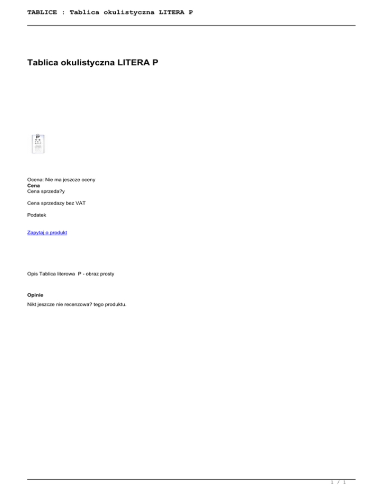 TABLICE : Tablica okulistyczna LITERA P Tablica okulistyczna LITERA P Ocena: Nie ma jeszcze oceny Cena Cena sprzeda?y Cena sprzedazy bez VAT Podatek Zapytaj o produkt Opis Tablica literowa P - obraz prosty Opinie Nikt jeszcze nie recenzowa? tego produktu. 1 / 1 Powered by TCPDF (www.tcpdf.org)