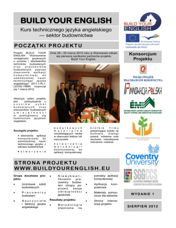 BUILD YOUR ENGLISH Kurs technicznego języka angielskiego — sektor budownictwa P O C Z ĄT K I P R O J E K T U Projekt BUILD YOUR ENGLISH “Wzmocnienie umiejętności językowych u uczniów i absolwentów techników budowlanych oraz pracowników budowlanych poprzez stworzenie aplikacji komputerowej do samodzielnej nauki technicznego języka angielskiego” 2011-1-PL1LEO05-19889 rozpoczął się 1 marca 2012. Dnia 29—30 marca 2012 roku w Warszawie odbyło się pierwsze spotkanie partnerów projektu Build Your English. Konsorcjum Projektu Głównym celem projektu jest podwyższenie u u c z n i ó w s z k ó ł budowlanych oraz pracowników budowlanych u m i e j ę t n o ś c i w p os ług i wani u się technicznym językiem angielskim. d o d a t k o w y c h m a t e r i a ł ó w umożliwiających naukę w obecności lektora lub nauczyciela. Szczegóły projektu: stworzenie aplikacji komputerowej do samodzielnej nauki technicznego języka z zakresu budownictwa. krótkie filmy prezentujące scenki na budowie, dialogi pisane, mówione oraz słuchane, interaktywne ćwiczenia i zadania. s t w o r z e n i e m e t o d o l o g i i dostosowanej do aplikacji komputerowej: s t w o r z e n i e STRONA PROJEKTU W W W. BU I L DY O U R E N G L I S H . E U Grupa docelowa projektu: Uczniowie szkół budowlanych Pracownicy budowlani Nauczyciele i lektorzy języka angielskiego Niewykwalif ik o wa n i pracownicy budowlani chcący poprawić swoje umiejętności językowe. Rezultaty projektu: Metodologia s twor zona na potrzeby aplikacji komputerowej Aplikacja puterowa Materiały pomocnicze dla lektorów Strona internetowa projektu kom- W Y D AN I E 1 SIERPIEŃ 2012 Strona 2 BU I L D Y O U R E N G L I S H M E T O D O LO G I A stworzony na poziomie A2 (pre-intermediate) W pierwszej fazie zostanie stworzona testowa aplikacja. Po wstępnej ewaluacji rozpoczną się prace nad wersją ostateczną szkolenia. użyteczny podczas zajęć w klasie, jak też jako narzędzie do samodzielnej nauki języka obcego Podstawowe celem metodologii BUILD YOUR ENGLISH jest zapewnienie, aby program był: prosty w przys wajaniu zarówno dla uczniów jak i nauczycieli materiałem szkoleniowym na okres około jednego roku nauki w szkole zaopatrzony w elektroniczny glosariusz. Pierwsze pięć miesięcy projektu zostało poświęcone stworzeniu metodologii szkolenia, na której zostanie oparty cały kurs. użyteczny dla uczestników szk olenia podczas ich codziennej pracy S C H E M AT T R E Ś C I S Z K O L E N I A Tytuły modułów szkoleniowych: Moduł 1 Podstawowe elementy budowlane wchodzą lekcje trwające około 45 min. Razem kurs będzie zawierał 60 lekcji - 15 lekcji składa się na jeden moduł. Moduł 2 Organizacja placu budowy. W ybrany sprzęt budowlany, narzędzia i maszyny. Moduł 3 Komunikacja i zatrudnienie. M o d u ł 4 D o k um e n ta c j a techniczna oraz BHP. W skład tych czterech modułów T E S T O WA A P L I K AC J A B Y E Aplikacja Build Your English będzie oparta na casual games technology. Casual games są odtwarzane jako zwykłe aplikacje na PC, aplikacje online, jak też na konsolach do gier oraz w telefonach komórkowych. Oprogramowanie zawierać będzie wątek fabularny związany z tematyką nauczania w który wplecione zostaną: interaktywne plansze, quizy, testy, mini gry, fragmenty wideo, nagrania native spearkers itp. Pierwszy wstępny kurs testowy aplikacji odbędzie się we wrześniu i paź- dzierniku 2012 roku. Celem testu jest ocena przez beneficjentów użyteczności programu, która pozwoli konsorcjum projektu opracować odpowiedni kurs skierowany do określonej grupy odbiorców.