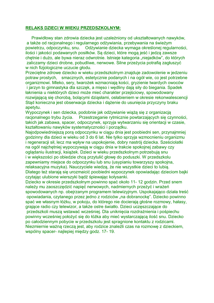 RELAKS DZIECI W WIEKU PRZEDSZKOLNYM: Prawidłowy stan zdrowia dziecka jest uzależniony od ukształtowanych nawyków, a także od racjonalnego i regularnego odżywiania, przebywania na świeżym powietrzu, odpoczynku, snu. Odżywianie dziecka wymaga określonej regularności, ilości i jakości podawanych posiłków. Są dzieci, które mogą jeść i jedzą zawsze chętnie i dużo, ale bywa nieraz odwrotnie. Istnieje kategoria „niejadków”, do których zaliczamy dzieci drobne, pobudliwe, nerwowe. Silne przeżycia potrafią zagłuszyć w nich fizjologiczne uczucie głodu. Przeciętne zdrowe dziecko w wieku przedszkolnym znajduje zadowolenie w jedzeniu potraw prostych, smacznych, estetycznie podanych i na ogół wie, co jest potrzebne organizmowi. Mleko, sery, twarożek wzmacniają kości, gryzienie twardych owoców i jarzyn to gimnastyka dla szczęk, a mięso i wędliny dają siły do biegania. Spadek łaknienia u niektórych dzieci może mieć charakter przejściowy, spowodowany rozwijającą się chorobą, bolącymi dziąsłami, osłabieniem w okresie rekonwalescencji Stąd konieczna jest obserwacja dziecka i dążenie do usunięcia przyczyny braku apetytu. Wypoczynek i sen dziecka, podobnie jak odżywianie wiążą się z organizacją racjonalnego trybu życia. Przestrzeganie rytmicznie powtarzających się czynności, takich jak zabawa, spacer, odpoczynek, sprzyja wytwarzaniu się orientacji w czasie, kształtowaniu nawyków systematyczności i porządku. Najodpowiedniejszą porą odpoczynku w ciągu dnia jest poobiedni sen, przynajmniej godzinny dla dzieci w wieku od 3 do 6 lat. Nie tylko sprzyja wzmocnieniu organizmu i regeneracji sił, lecz ma wpływ na uspokojenie, dobry nastrój dziecka. Sześciolatki na ogół najchętniej wypoczywają w ciągu dnia w trakcie spokojnej zabawy czy oglądaniu ilustracji, książek. Dzieci w wieku przedszkolnym potrzebują snu i w większości po obiedzie chcą przytulić głowę do poduszki. W przedszkolu zapewniamy miejsce do odpoczynku lub snu (usypianiu towarzyszy spokojna, relaksacyjna muzyka). Nauczyciele wiedzą, że nie wszystkie dzieci to lubią. Dlatego też starają się urozmaicić poobiedni wypoczynek opowiadając dzieciom bajki czytając ulubione wierszyki bądź śpiewając kołysanki. Dziecko w okresie przedszkolnym powinno spać około 11- 12 godzin. Przed snem należy mu zaoszczędzić napięć nerwowych, nadmiernych przeżyć i wrażeń spowodowanych np. obejrzanym programem telewizyjnym. Uspokajająco działa treść opowiadania, czytanego przez jedno z rodziców „na dobranockę”. Dziecko powinno spać we własnym łóżku, w pokoju, do którego nie docierają głośne rozmowy, hałasy, grające radio czy telewizor, a także ostre światło. Dzieci uczęszczające do przedszkoli muszą wstawać wcześniej. Dla uniknięcia rozdrażnienia i pośpiechu powinny wcześniej położyć się do łóżka aby mieć wystarczającą ilość snu. Dziecko po całodziennym pobycie w przedszkolu jest spragnione kontaktu z rodzicami. Niezmiernie ważną rzeczą jest, aby rodzice znaleźli czas na rozmowę z dzieckiem, wspólny spacer- najlepiej między godz. 17- 19.