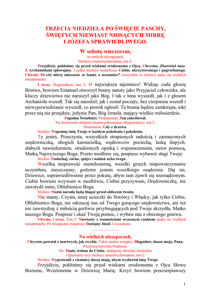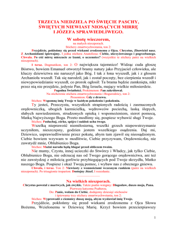 TRZECIA NIEDZIELA PO ŚWIĘCIE PASCHY, ŚWIĘTYCH NIEWIAST NIOSĄCYCH MIRRĘ I JÓZEFA SPRAWIEDLIWEGO. W sobotę wieczorem, na małych nieszporach. Stichery zmartwychwstania, ton 2: Przyjdźcie, pokłońmy się przed wiekami zrodzonemu z Ojca. Chrystus, Zbawiciel nasz. Z Archaniołami śpiewajmy. I jedna stichera Anatoliosa: Ciebie, ukrzyŜowanego i pogrzebanego. Chwała. Po cóŜ mirrę mieszacie ze łzami, o uczennice? (wszystkie te stichery patrz na wielkich nieszporach). I teraz. Dogmatikon, ton 2: O największa tajemnico! Widząc cuda głoszę Bóstwo, bowiem Emanuel otworzył bramy natury jako Przyjaciel człowieka, ale kluczy dziewictwa nie naruszył jako Bóg. I tak z łona wyszedł, jak i z głosem Archanioła wszedł. Tak się narodził, jak i został poczęty, bez cierpienia wszedł i niewypowiedzianie wyszedł, co prorok ogłosił: Ta brama będzie zamknięta, nikt przez nią nie przejdzie, jedynie Pan, Bóg Izraela, mający wielkie miłosierdzie. Pogodna Światłości. Prokimenon: Pan zakrólował. Na stichownie stichera zmartwychwstania i Bogurodzicy, ton 2: Prosomion: Gdy z drzewa. Stichos: Wspomnę imię Twoje w kaŜdym pokoleniu i pokoleniu. Ty jesteś, Przeczysta, wszystkich strapionych radością i zasmuconych orędowniczką, ubogich karmicielką, wędrowców pociechą, laską ślepych, słabych nawiedzeniem, strudzonych opieką i wspomoŜeniem, sierot pomocą, Matką NajwyŜszego Boga. Przeto modlimy się, pospiesz wybawić sługi Twoje. Stichos: Posłuchaj, córko, spójrz i nakłoń ucha twego. Wszelką nieprawość niemiłosierną, wszelki grzech niepowstrzymanie uczyniłem, nieszczęsny, godzien jestem wszelkiego osądzenia. Daj mi, Dziewico, usprawiedliwienie przez pokutę, abym tam zjawił się nieosądzonym. Ciebie bowiem wzywam w modlitwie, Ciebie przyzywam, Orędowniczkę, nie zawstydź mnie, Oblubienico Boga. Stichos: MoŜni narodu będą błagać przed obliczem twoim. Nie mamy, Czysta, innej ucieczki do Stwórcy i Władcy, jak tylko Ciebie, Oblubienico Boga, nie odrzucaj nas od Twego gorącego orędownictwa, ani teŜ nie zawstydzaj z miłością gorliwie przybiegających pod Twoje skrzydła, Matko naszego Boga. Pospiesz i okaŜ Twoją pomoc, i wybaw nas z obecnego gniewu. Chwała, i teraz. Ton 2: Niewiasty z wonnościami wczesnym rankiem (patrz na wielkich nieszporach). Po trisagionie troparion: Dostojny Józef. I rozesłanie. ______________ Na wielkich nieszporach. Chrystus powstał z martwych, jak zwykle. TakŜe psalm wstępny: Błogosław, duszo moja, Pana. Pierwsza katyzma Psałterza. Do: Panie, wołam do Ciebie, dodajemy dziesięć stichosów i śpiewamy trzy stichery zmartwychwstania, ton 2: Stichos: Wyprowadź z ciemnicy duszę moją, abym wysławiał imię Twoje. Przyjdźcie, pokłońmy się przed wiekami zrodzonemu z Ojca Słowu BoŜemu, Wcielonemu w Dziewicę Marię. KrzyŜ bowiem przecierpiawszy 1 poddał się pogrzebowi jak sam zapragnął i powstawszy z martwych zbawi mnie, zbłąkanego człowieka. Stichos: Sprawiedliwi oczekują mnie, aŜ Ty dasz mi odpłatę. Chrystus, Zbawiciel nasz, przygwoŜdŜony do krzyŜa rękopis grzechów naszych wymazał i zniszczył władzę śmierci. Kłaniamy się Jego zmartwychwstaniu trzeciego dnia. Stichos: Z głębokości wołam do Ciebie, Panie, Panie, usłysz głos mój. Z Archaniołami śpiewajmy zmartwychwstaniu Chrystusa, On bowiem jest wybawicielem i Zbawcą dusz naszych, i w chwale strasznej, i w mocy potęŜnej powróci, aby sądzić świat, który stworzył. Cztery stichery Anatoliosa, ton 2: Stichos: Niech uszy Twoje będą uwaŜne na głos modlitwy mojej. Ciebie, ukrzyŜowanego i pogrzebanego, Anioł głosił, Władco, i mówił do niewiast: Przyjdźcie, zobaczcie gdzie leŜał Pan. Powstał bowiem, jak i powiedział, jako Wszechmocny. Przeto kłaniamy się Tobie, jedynemu Nieśmiertelnemu. Dawco Ŝycia, Chryste, zmiłuj się nad nami. Stichos: JeŜeli będziesz pamiętać o nieprawościach, Panie, Panie któŜ się ostoi? Ale u Ciebie jest oczyszczenie. Przez Twój krzyŜ zniszczyłeś klątwę z drzewa biorącą swój początek, przez Twój pogrzeb zniewoliłeś władzę śmierci. Przez Twoje powstanie oświeciłeś rodzaj ludzki. Przeto śpiewamy Tobie: Łaskawco, Chryste BoŜe nasz, chwała Tobie. Stichos: Dla imienia Twego cierpiałem Panie, cierpiała dusza moja dla słowa Twego, dusza moja ma nadzieję w Panu. Przed Tobą, Panie, otworzyły się ze strachem bramy śmierci, ulękły się, widząc Ciebie, bramy otchłani, skruszyłeś bowiem bramy spiŜowe, starłeś Ŝelazne łańcuchy, wywiodłeś nas z ciemności i mroku śmierci, i rozbiłeś nasze więzy. Stichos: Od straŜy porannej do nocy, od straŜy porannej niech Izrael ma nadzieję w Panu. Z ust naszych, śpiewając zbawczą pieśń, Tobie ją posyłamy: Przyjdźcie wszyscy, upadnijmy w domu Pańskim, mówiąc: UkrzyŜowany na drzewie, z martwych powstały i będący w łonie Ojca, oczyść grzechy nasze. TakŜe stichery niewiastom z wonnościami, ton 2: Stichos: Albowiem u Pana jest zmiłowanie i wielkie u Niego wybawienie, On sam wybawi Izraela ze wszystkich nieprawości jego. Niewiasty wczesnym porankiem wzięły wonności i przyszły do grobu Pańskiego nawet nie mając nadziei na odsunięcie kamienia, a znalazły kamień odsunięty i jedna do drugiej wołały: „Gdzie są pieczęcie grobu?” „Gdzie jest straŜ Piłata i niebezpieczne zabezpieczenie?” Jaśniejący anioł głosił nic nie rozumiejącym niewiastom nowinę i rzekł do nich: Dlaczego z płaczem poszukujecie śywego i oŜywiającego rodzaj ludzki? Powstał Chrystus Bóg nasz z martwych jako wszechmocny, dając wszystkim nam niezniszczalność, Ŝycie, oświecenie i wielkie miłosierdzie. Stichos: Chwalcie Pana wszystkie narody, wysławiajcie Go wszyscy ludzie. 2 Po cóŜ mirrę mieszacie ze łzami, o uczennice? Kamień odsunięty, grób jest pusty. Widzicie zniszczenie zdeptane przez Ŝycie, pieczęcie świadczą wyraźnie o mocno śpiących niepokornych straŜn