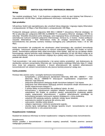 SWITCH 5(8) PORTOWY- INSTRUKCJA OBSŁUGI Wstęp Ten rozdział przedstawia Twój 5 lub 8-portowy przełączany switch do sieci lokalnej Fast Ethernet o przepustowości 10/100 Mbps i podaje podstawowe informacje o technologii switcha. Opis produktu: 5/8-portowy Switch jest zaprojektowany aby umożliwić łatwą integrację i migrację między Ethernetem o przepustowości 10 Mbps a Fast Ethernetem o przepustowości 100 Mbps. Przełącznik obsługuje zarówno połączenia IEEE 802.3 10BASE-T (dwużyłowy Ethernet działający 10 Mb na sekundę) jak i połączenia IEEE 802.3u100BASE-TX (.dwużyłowy Ethernet działający 100 Mb na sekundę) Wszystkie dwużyłowe porty obsługują auto-negocjację Nway umożliwiając koncentratorowi automatyczne wykrycie szybkości połączenia interneowego. Oznacza to, iż możesz możesz podłączyć wszyskie Ethernetowe i Fast Ethernetowe hosty do swojego koncenratora (lub zespołu koncentratorów) bez potrzeby wymiany instalacji wymaganej przy uaktualnianiu hosta z 10 do 100 Mb/s. Każdy koncentrator lub przełącznik ma wbudowany układ komutujący aby umożliwić komunikację pomiędzy końcowymi węzłami sieciowymi na różnych szykościach. Wskaźnik SW Enable na tylnym panelu koncentratora pokazuje kiedy układ komutujący może działać. Jeśli hub nie ma takiego układu komutującego, jedynie końcowe węzły działające z tą samą szybkością (10 lub 100 Mb/s) mogą się ze sobą komunikować, chyba że koncentrator znajduje się w jednej wieży (stack) z koncentratorem, kóry posiada taki obwód. Twój koncentrator ( lub wieża koncentratorów z tej samej rodziny produktów) jest dostosowany do standardów zarówno wzmacniaków Ethernetu jak i wzmacniaków szybkiego Ethernetu klasy II i dzięki temu może być połączony nadrzednie z innymi ethernetowymi lub szybkimi ethernetowymi koncentratorami lub wieżami koncentratorów aby jeszcze bardziej poszerzyć zasięg sieci. Cechy produktu Poniższa lista zawiera cechy i szczegóły techniczne koncentratora. - kompatybilny z przemysłowymi standardami Ethernetu IEEE 802. 10BASE-T i Fast Ethernetu 802.3u 100BASE-TX dotyczącymi współdziałania urządzeniami sieci Ethernet i Fast Ethernet. - połączenie Ethernetowe obsługują skrętki dwużyłowe kategorii 3 lub lepsze. - połączenia Fast Ethernetowe obsługują zarówno dwużyłowe skrętki ekranowane jak i skrętki nieekranowane kategorii 5. - 5 portów NWay na koncentrator aby podłączyć stacje do sieci. - koncentratory z wbudowanym zespołem układów komutujących (widocznym dzięki wskaźnikowi SW Enable na przednim panelu) automatycznie przekazują pakiety między połączeniami ethernetowymi i szybkimi ethernetowymi zezwalając na komunikację pomiędzy końcowymi węzłami działającymi z różną szybkością. - wskaźniki LED pokazują zasilanie, szybkość, kolizję, łącze/ działanie. - automatyczny podział na partycje dla ochrony sieci. - wykrywanie i obróbka kolizji danych. - wstępna regeneracja i rytmiczne powtarzanie sygnału. - wtyczka łącza nadrzędnego dla łatwego łączenia innych koncentratorów lub wież koncentratorów w celu poszerzenia sieci. Rozpakowanie i instalacja Rozdział ten dostarcza informacji na temat rozpakowania i wstępnej instalacji wieży koncentratorów. Rozpakowanie Otwórz pudełko z koncentratorem i ostrożnie rozpakuj zawartość. Pudełko powinno zawierać następujące przedmioty: www.techsolo.pl -1- SWITCH 5(8) PORTOWY- INSTRUKCJA OBSŁUGI - Jeden 5-portowy koncentrator lub 8-portowy koncentrator Fast Ethernetu - Jeden zasilacz DC 7.5V/1A do koncentratora lub jeden zasilacz 5V/1A do przełącznika - Instrukcję obsługi Sprawdź koncentrator i dodatkowe urządzenia. Jeżeli któregoś brakuje lub jest zniszczone natychmiast poinformuj o tym problemie swojego sprzedawcę sprzętu sieciowego. Identyfikacja części zewnętrznych Ta część opisuje wszystkie główne części zewnętrzne koncentratora.. Najpierw następuje opis tylnego panela a następnie opis cech poszczególnych paneli. Panel wskaźników opisany jest szczegółowo w następnym rozdziale. Tylny panel Rysunek pokazuje tylne panele wszystkich koncentratorów tej samej rodziny produktów. Pierwszy koncentrator ma wbudowany układ komutujący, drugi go nie posiada. Proszę zidentyfikować tylny panel swojego koncentratora na rysunku przed kontynuacją działania. • Panel ze wskaźnikiem LED Aby uzyskać dokładne informacje o każdym ze wskaźników LED proszę przejść do następnego rozdziału “Zrozumieć wskaźniki” • Gniazdka dwużyłowe Użyj tych gniazd (oznaczonych 1x-5x) aby podłączyć stacje do koncentratora. Sa to MDI-X (Medium-Dependent Interface, Cross-wired) gniazda co oznacza, że możesz użyć zwykłych prostych dwużyłowych obwodów aby przez nie połączyć komputer użytkownika i serwer do koncentratora. Jeżeli musisz połączyć inne urządzenie za pomocą wtyczki MDI-X jak np. kolejny koncentrator lub przełącznik ethernetowy, powinieneś użyć obwód krzyżujący się lub stworzyć połączenie za pomocą gniazda łącza nadrzędnego (opisanej poniżej) • Gniazdo łącza nadrzędnego Gniazdo łącza nadrzędnego to gniazdo MDI-II, co oznacza, że możesz podłączyć koncentrator (lub wieżę koncentratorów ) do urządzenia z portem MDI-X używając zwykłego prostego obwodu bez potrzeby używania krzyżującego się obwodu. Gniazdo portu IIX i gniazdo łącza nadrzędnego to w rzeczywistości ten sam port oprócz tego, że ich układy styków sa inne. Nie używaj równocześnie gniazda portu IIX i gniazda łącza nadrzędnego. Tworzenie połączeń Ten rozdział omawia sposób w jaki można połączyć końcowe węzły i dwa koncentratory (lub dwie wieże koncentratorów lub koncentrator i wieżę) . Zasady podłączania Sieci Ethernet (10 Mb/s): - - Maksymalna długość części obwodu dwużyłowego wynosi 100 metrów. Obwód powinien byc kategorii 3 lub lepszy. Pomiędzy który