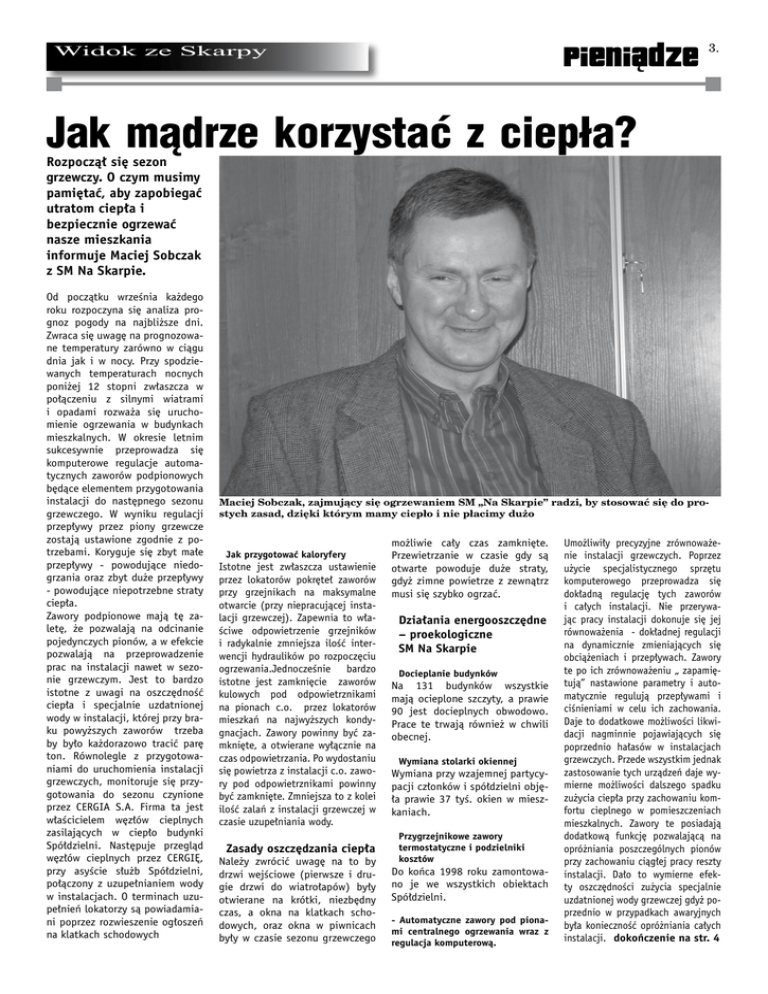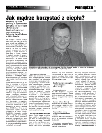 Widok ze Skarpy pieniądze Jak mądrze korzystać z ciepła? Rozpoczął się sezon grzewczy. O czym musimy pamiętać, aby zapobiegać utratom ciepła i bezpiecznie ogrzewać nasze mieszkania informuje Maciej Sobczak z SM Na Skarpie. Od początku września każdego roku rozpoczyna się analiza prognoz pogody na najbliższe dni. Zwraca się uwagę na prognozowane temperatury zarówno w ciągu dnia jak i w nocy. Przy spodziewanych temperaturach nocnych poniżej 12 stopni zwłaszcza w połączeniu z silnymi wiatrami i opadami rozważa się uruchomienie ogrzewania w budynkach mieszkalnych. W okresie letnim sukcesywnie przeprowadza się komputerowe regulacje automatycznych zaworów podpionowych będące elementem przygotowania instalacji do następnego sezonu grzewczego. W wyniku regulacji przepływy przez piony grzewcze zostają ustawione zgodnie z potrzebami. Koryguje się zbyt małe przepływy - powodujące niedogrzania oraz zbyt duże przepływy - powodujące niepotrzebne straty ciepła. Zawory podpionowe mają tę zaletę, że pozwalają na odcinanie pojedynczych pionów, a w efekcie pozwalają na przeprowadzenie prac na instalacji nawet w sezonie grzewczym. Jest to bardzo istotne z uwagi na oszczędność ciepła i specjalnie uzdatnionej wody w instalacji, której przy braku powyższych zaworów trzeba by było każdorazowo tracić parę ton. Równolegle z przygotowaniami do uruchomienia instalacji grzewczych, monitoruje się przygotowania do sezonu czynione przez CERGIA S.A. Firma ta jest właścicielem węzłów cieplnych zasilających w ciepło budynki Spółdzielni. Następuje przegląd węzłów cieplnych przez CERGIĘ, przy asyście służb Spółdzielni, połączony z uzupełnianiem wody w instalacjach. O terminach uzupełnień lokatorzy są powiadamiani poprzez rozwieszenie ogłoszeń na klatkach schodowych Maciej Sobczak, zajmujący się ogrzewaniem SM „Na Skarpie” radzi, by stosować się do prostych zasad, dzięki którym mamy ciepło i nie płacimy dużo Jak przygotować kaloryfery Istotne jest zwłaszcza ustawienie przez lokatorów pokręteł zaworów przy grzejnikach na maksymalne otwarcie (przy niepracującej instalacji grzewczej). Zapewnia to właściwe odpowietrzenie grzejników i radykalnie zmniejsza ilość interwencji hydraulików po rozpoczęciu ogrzewania.Jednocześnie bardzo istotne jest zamknięcie zaworów kulowych pod odpowietrznikami na pionach c.o. przez lokatorów mieszkań na najwyższych kondygnacjach. Zawory powinny być zamknięte, a otwierane wyłącznie na czas odpowietrzania. Po wydostaniu się powietrza z instalacji c.o. zawory pod odpowietrznikami powinny być zamknięte. Zmniejsza to z kolei ilość zalań z instalacji grzewczej w czasie uzupełniania wody. Zasady oszczędzania ciepła Należy zwrócić uwagę na to by drzwi wejściowe (pierwsze i drugie drzwi do wiatrołapów) były otwierane na krótki, niezbędny czas, a okna na klatkach schodowych, oraz okna w piwnicach były w czasie sezonu grzewczego możliwie cały czas zamknięte. Przewietrzanie w czasie gdy są otwarte powoduje duże straty, gdyż zimne powietrze z zewnątrz musi się szybko ogrzać. Działania energooszczędne – proekologiczne SM Na Skarpie Docieplanie budynków Na 131 budynków wszystkie mają ocieplone szczyty, a prawie 90 jest docieplnych obwodowo. Prace te trwają również w chwili obecnej. Wymiana stolarki okiennej Wymiana przy wzajemnej partycypacji członków i spółdzielni objęła prawie 37 tyś. okien w mieszkaniach. Przygrzejnikowe zawory termostatyczne i podzielniki kosztów Do końca 1998 roku zamontowano je we wszystkich obiektach Spółdzielni. - Automatyczne zawory pod pionami centralnego ogrzewania wraz z regulacja komputerową. Umożliwiły precyzyjne zrównoważenie instalacji grzewczych. Poprzez użycie specjalistycznego sprzętu komputerowego przeprowadza się dokładną regulację tych zaworów i całych instalacji. Nie przerywając pracy instalacji dokonuje się jej równoważenia - dokładnej regulacji na dynamicznie zmieniających się obciążeniach i przepływach. Zawory te po ich zrównoważeniu „ zapamiętują” nastawione parametry i automatycznie regulują przepływami i ciśnieniami w celu ich zachowania. Daje to dodatkowe możliwości likwidacji nagminnie pojawiających się poprzednio hałasów w instalacjach grzewczych. Przede wszystkim jednak zastosowanie tych urządzeń daje wymierne możliwości dalszego spadku zużycia ciepła przy zachowaniu komfortu cieplnego w pomieszczeniach mieszkalnych. Zawory te posiadają dodatkową funkcję pozwalającą na opróżniania poszczególnych pionów przy zachowaniu ciągłej pracy reszty instalacji. Dało to wymierne efekty oszczędności zużycia specjalnie uzdatnionej wody grzewczej gdyż poprzednio w przypadkach awaryjnych była konieczność opróżniania całych instalacji. dokończenie na str. 4