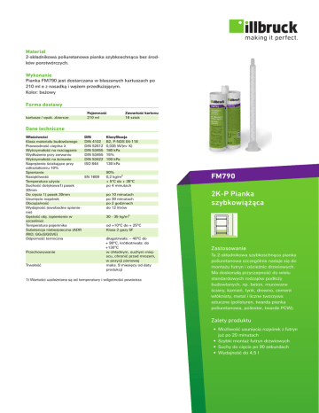 Materiał 2-składnikowa poliuretanowa pianka szybkoschnąca bez środków porotwórczych. Wykonanie Pianka FM790 jest dostarczana w blaszanych kartuszach po 210 ml e z nasadką i wężem przedłużającym. Kolor: beżowy Forma dostawy kartusze / opak. zbiorcze Pojemność 210 ml Zawartość kartonu 16 sztuk Dane techniczne Właściwości Klasa materiału budowlanego Przewodność cieplna λ Wytrzymałość na rozciąganie Wydłużenie przy zerwaniu Wytrzymałość na ścinanie Naprężenie ściskające przy odkształceniu 10% Spienianie Nasiąkliwość Temperatura użycia Suchość dotykowa1) pasek 30mm Do cięcia 1) pasek 30mm Usunięcie rozpórek Obciążalność Wydajność (swobodne spienienie) Gęstość obj. (spienienie w szczelinie) Temperatura pojemnika Substancja niebezpieczna (ADR /RID; GGvS/GGVE) Odporność termiczna Przechowywanie Trwałość DIN DIN 4102 DIN 52612 DIN 53455 DIN 53455 DIN 53422 ISO 844 EN 1609 Klasyfikacja B2, P-NDS 04-118 0,035 W/(m· K) 180 kPa 15% 100 kPa 130 kPa 90% 0,2 kg/m² + 5°C do + 35°C po 4 minutach po 10 minutach po 30 minutach po 2 godzinach do 12 litrów FM790 2K-P Pianka szybkowiążąca 30 - 35 kg/m³ od +10°C do + 25°C Klasa 2 gazy 5F długotrwała: – 40°C do + 90°C, krótkotrwała: do +130°C w chłodnym, suchym miejscu, chronić przed mrozem, w pozycji pionowej maks. 9 miesięcy od daty produkcji 1) Wartości uzależnione są od temperatury i wilgotności powietrza Zastosowanie Ta 2-składnikowa szybkoschnąca pianka poliuretanowa szczególnie nadaje się do montażu futryn i ościeżnic drzwiowych. Ma doskonałą przyczepność do wielu standardowych rodzajów podłoży budowlanych, np. beton, murowane ściany, kamień, tynk, drewno, cement włóknisty, metal i liczne tworzywa sztuczne (polistyren, twarda pianka poliuretanowa, poliester, twarde PCW). Zalety produktu • Możliwość usunięcia rozpórek z futryn już po 20 minutach • Szybki montaż futryn drzwiowych • Suchy do cięcia po 90 sekundach • Wydajność do 4,5 l FM790 2K-P Pianka szybkowiążąca Przygotowanie • Podłoże musi być czyste i wytrzymałe. Nieprzyczepione fragmenty, pył i tłuszcz należy usunąć • Przed nałożeniem pianki powierzchnie podłoża zwilżyć • Przylegające powierzchnie oraz okładziny ścienne i podłogowe w miejscu pracy należy zakryć • Odciąć końcówkę katusza i założyć nasadkę Użycie • Założyć nasadkę i rurki przedłużające z dyszą kątową na kartusz; • Włożyć kartusz do pistoletu, dozować za pomocą dźwigni; • Wyciskanie rozpocząć powoli, aby pianka mogą zacząć reagować w nasadce; • Zużyć szybko i bez przerywania, całkowicie opróżnić pojemnik; Przy wymianie kartusza wymienić również nasadkę. • Należy jednak pamiętać, że w podłożu nie może być zamarzniętej wody. Optymalna temperatura pojemnika wynosi 20°C; w niższej temperaturze należy liczyć się z mniejszą wydajnością pianki. W przypadku wprowadzania pianki przy elementach ulegających odkształceniu, np. parapetach lub ościeżnicach okiennych, należy zapewnić odpowiednio mocne osadzenie tych elementów. Czyszczenie Ewentualny nadmiar pianki należy odciąć po utwardzeniu się pianki. Odpryski pianki należy od razu usuwać za pomocą pistoletowego środka czyszczącego AA290 lub acetonu. Utwardzoną piankę można usunąć tylko sposobem mechanicznym. Po użyciu pistolet do pianki dokładnie wyczyścić środkiem AA290 i zakonserwować środkiem w sprayu illbruck AA291. Ilustracja 1: Pistolet do FM790, 2KP Pianki szybkowiążącej Ilustracja 2: Kątowa dysza do czystego i szybkiego rozprowadzania pianki bez pasków tektury Ilustracja 3: FM790 2-składnikowa pianka szybkoschnąca do futryn. Przystosowana do obróbki po 90 sekundach. Ilustracja 4: Możliwość wstawienia drzwi po 20 minutach, duża wydajność do 4,5 l Wskazówki bezpieczeństwa Najnowszą wersję karty charakterystyki znajdą Państwo na stronie www.tremco-illbruck.com Wskazówki Serwis techniczny Na życzenie klienta firma tremco illbruck udostępnia w każdej chwili fachową pomoc techniczną. Dodatkowe informacje Powyższe informacje mogą być tylko ogólnymi wskazówkami. Ze względu na to, że nie mamy wpływu na warunki obróbki i zastosowania, jak również z powodu różnorodności stosowanych materiałów, należy przeprowadzić odpowiednie próby we własnym zakresie, aby sprawdzić materiał pod kątem dopasowania produktu do konkretnego zastosowania. Zastrzega się możiwość zmian technicznych. Najnowszą wersję znajdziecie Państwo na stronie www.tremcoillbruck.com tremco illbruck Sp. z o.o. Kuźnicy Kołłątajowskiej 13 31-234 Kraków Polska T:+48 12 665 33 08 F:+48 12 665 33 09 [email protected] www.tremco-illbruck.com 119737 | 2014-05 Używać tylko w pomieszczeniach o powierzchni podłogi powyżej 5 m² (wysokość kondygnacji 2,5 m) i dobrej wentylacji. Nie palić! Chronić oczy, nosić rękawice i odzież roboczą. Nie wystawiać pianki na działanie czynników atmosferycznych przez dłuższy czas, ponieważ nie jest ona odporna na promieniowanie UV. Zawory pianek illbruck są dokładnie dopasowane do pistoletów oferowanych przez firmę illbruck. Używanie tych pistoletów zapewnia uzyskanie optymalnego otwarcia zaworu. W ten sposób zapewniona jest żądana prędkość wylotowa i całkowite opróżnienie pojemnika.