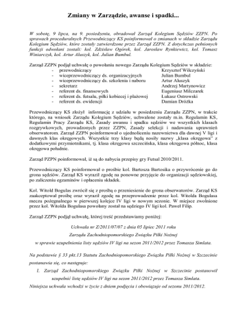 Zmiany w Zarządzie, awanse i spadki... W sobotę, 9 lipca, na 9. posiedzeniu, obradował Zarząd Kolegium Sędziów ZZPN. Po sprawach proceduralnych Przewodniczący KS poinformował o zmianach w składzie Zarządu Kolegium Sędziów, które zostały zatwierdzone przez Zarząd ZZPN. Z dotychczas pełnionych funkcji odwołani zostali: kol. Zdzisław Ogórek, kol. Jarosław Rynkiewicz, kol. Tomasz Winiarczyk, kol. Artur Aluszyk, kol. Julian Bumbul. Zarząd ZZPN podjął uchwałę o powołaniu nowego Zarządu Kolegium Sędziów w składzie: - przewodniczący Krzysztof Wilczyński - wiceprzewodniczący ds. organizacyjnych Julian Bumbul - wiceprzewodniczący ds. szkolenia i naboru Artur Aluszyk - sekretarz Andrzej Martynowicz - referent ds. finansowych Eugeniusz Milczarek - referent ds. futsalu, piłki kobiecej i plażowej Łukasz Ostrowski - referent ds. ewidencji Damian Dróżka Przewodniczący KS złożył informację z udziału w posiedzeniu Zarządu ZZPN, w trakcie którego, na wniosek Zarządu Kolegium Sędziów, uchwalone zostały m.in. Regulamin KS, Regulamin Pracy Zarządu KS, Zasady awansu i spadku sędziów we wszystkich klasach rozgrywkowych, prowadzonych przez ZZPN, Zasady selekcji i nadawania uprawnień obserwatorom. Zarząd ZZPN poinformował o ujednoliceniu nazewnictwa dla dawnej V ligi i dawnych klas okręgowych. Wszystkie trzy klasy będą nosiły nazwy „klasa okręgowa” z dodatkowymi przymiotnikami, tj. klasa okręgowa szczecińska, klasa okręgowa północ, klasa okręgowa południe. Zarząd PZPN poinformował, iż są do nabycia przepisy gry Futsal 2010/2011. Przewodniczący KS poinformował o prośbie kol. Bartosza Bartosika o przywrócenie go do grona sędziów. Zarząd KS wyraził zgodę na ponowne przyjęcie do organizacji sędziowskiej, po zaliczeniu egzaminów i opłaceniu składek. Kol. Witold Bogulas zwrócił się z prośbą o przeniesienie do grona obserwatorów. Zarząd KS zaakceptował prośbę oraz wyraził zgodę na przeprowadzenie przez kol. Witolda Bogulasa meczu pożegnalnego w pierwszej kolejce IV ligi w nowym sezonie. W miejsce zwolnione przez kol. Witolda Bogulasa powołany został na sędziego IV ligi kol. Paweł Filip. Zarząd ZZPN podjął uchwałę, której treść przedstawiamy poniżej: Uchwała nr Z/2011/07/07 z dnia 05 lipiec 2011 roku Zarządu Zachodniopomorskiego Związku Piłki Nożnej w sprawie uzupełnienia listy sędziów IV ligi na sezon 2011/2012 przez Tomasza Simlata. Na podstawie § 33 pkt.13 Statutu Zachodniopomorskiego Związku Piłki Nożnej w Szczecinie postanawia się, co następuje: I. Zarząd Zachodniopomorskiego Związku Piłki Nożnej w Szczecinie postanowił uzupełnić listę sędziów IV ligi na sezon 2011/2012 przez Tomasza Simlata. Niniejsza uchwała wchodzi w życie z dniem podjęcia i obowiązuje od sezonu 2011/2012. Zarząd KS zatwierdził listy klasyfikacyjne sędziów V ligi, klasy okręgowej i A (listy III i IV ligi oraz B klasy zostały zatwierdzone na poprzednim posiedzeniu Zarządu). Na ich podstawie Zarząd KS dokonał zmian w poszczególnych klasach. Wyglądają następująco: III LIGA - awansował do klasy wyższej Andrzej Martynowicz; spadają do klasy niższej: Tomasz Czyżak i Wiktor Wątroba; IV LIGA - awansowali do klasy wyższej: Dawid Błaszczak, Mateusz Augustynowicz, Marcin Siedlecki, spadają do klasy niższej: Wojciech Leske, Maciej Czernic, Łukasz Strabel; Klasa okręgowa „Szczecińska” (dawna V LIGA) - awansowali do klasy wyższej: Mirosław Kos, Paweł Nagadowski, Paweł Filip, spadają do klasy niższej: Radosław Zbaracki, Wiktor Kucharzewski, Tomasz Kowalski, Dariusz Czaczyk; KLASA OKRĘGOWA - do klasy wyższej awansowali: Grzegorz Kądziołka, Waldemar Cichecki, Damian Dróżka, Natalia Rynkiewicz; do klasy niższej spadają: Krzysztof Trojanowski, Paweł Gulbinowicz, Katarzyna Kochanek; KLASA A - do klasy wyższej awansowali: Marcin Maśniak, Przemysław Borkowski, Robert Szczygieł, Szymon Kwiatkowski, Michał Zając, Karol Arys; do klasy niższej spadają: Patryk Smacki, Grzegorz Posyniak, Paweł Baranowski, Dariusz Młodziejewski, Patryk Bywalec, Michał Linniczenko, Krzysztof Gromadzki; KLASA B - do klasy wyższej awansują: Robert Betlejewski, Bartosz Bryśkiewicz, Jerzy Kmieć, Jarosław Kowalczyk, Paweł Maćkowiak, Daniel Pędziwiatr, Robert Plackowski, Jakub Strugielski, Tomasz Stupak, Jakub Wścibski. Zarząd Kolegium Sędziów składa gratulacje wszystkim, którzy sukcesem zakończyli miniony sezon, a spadkowiczom życzy szybkiego powrotu do wyższych lig.