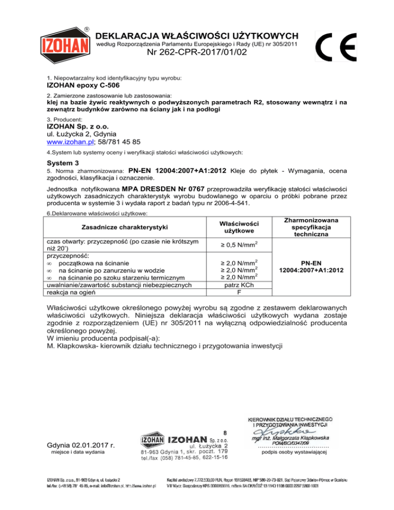 DEKLARACJA WŁAŚCIWOŚCI UŻYTKOWYCH według Rozporządzenia Parlamentu Europejskiego i Rady (UE) nr 305/2011 Nr 262-CPR-2017/01/02 1. Niepowtarzalny kod identyfikacyjny typu wyrobu: IZOHAN epoxy C-506 2. Zamierzone zastosowanie lub zastosowania: klej na bazie żywic reaktywnych o podwyższonych parametrach R2, stosowany wewnątrz i na zewnątrz budynków zarówno na ściany jak i na podłogi 3. Producent: IZOHAN Sp. z o.o. ul. Łużycka 2, Gdynia www.izohan.pl; 58/781 45 85 4.System lub systemy oceny i weryfikacji stałości właściwości użytkowych: System 3 5. Norma zharmonizowana: PN-EN 12004:2007+A1:2012 Kleje do płytek - Wymagania, ocena zgodności, klasyfikacja i oznaczenie. Jednostka notyfikowana MPA DRESDEN Nr 0767 przeprowadziła weryfikację stałości właściwości użytkowych zasadniczych charakterystyk wyrobu budowlanego w oparciu o próbki pobrane przez producenta w systemie 3 i wydała raport z badań typu nr 2006-4-541. 6.Deklarowane właściwości użytkowe: Zasadnicze charakterystyki czas otwarty: przyczepność (po czasie nie krótszym niż 20’) przyczepność: • początkowa na ścinanie • na ścinanie po zanurzeniu w wodzie • na ścinanie po szoku starzeniu termicznym uwalnianie/zawartość substancji niebezpiecznych reakcja na ogień Właściwości użytkowe ≥ 0,5 N/mm Zharmonizowana specyfikacja techniczna 2 2 ≥ 2,0 N/mm 2 ≥ 2,0 N/mm 2 ≥ 2,0 N/mm patrz KCh F PN-EN 12004:2007+A1:2012 Właściwości użytkowe określonego powyżej wyrobu są zgodne z zestawem deklarowanych właściwości użytkowych. Niniejsza deklaracja właściwości użytkowych wydana zostaje zgodnie z rozporządzeniem (UE) nr 305/2011 na wyłączną odpowiedzialność producenta określonego powyżej. W imieniu producenta podpisał(-a): M. Kłapkowska- kierownik działu technicznego i przygotowania inwestycji Gdynia 02.01.2017 r. miejsce i data wydania ……………………………… podpis osoby wystawiającej