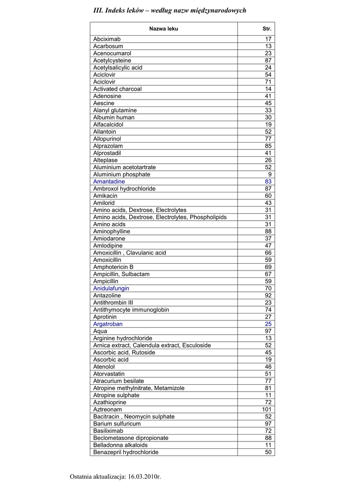 III. Indeks leków – według nazw międzynarodowych Nazwa leku Abciximab Acarbosum Acenocumarol Acetylcysteine Acetylsalicylic acid Aciclovir Aciclovir Activated charcoal Adenosine Aescine Alanyl glutamine Albumin human Alfacalcidol Allantoin Allopurinol Alprazolam Alprostadil Alteplase Aluminium acetotartrate Aluminium phosphate Amantadine Ambroxol hydrochloride Amikacin Amilorid Amino acids, Dextrose, Electrolytes Amino acids, Dextrose, Electrolytes, Phospholipids Amino acids Aminophylline Amiodarone Amlodipine Amoxicillin , Clavulanic acid Amoxicillin Amphotericin B Ampicillin, Sulbactam Ampicillin Anidulafungin Antazoline Antithrombin III Antithymocyte immunoglobin Aprotinin Argatroban Aqua Arginine hydrochloride Arnica extract, Calendula extract, Esculoside Ascorbic acid, Rutoside Ascorbic acid Atenolol Atorvastatin Atracurium besilate Atropine methylnitrate, Metamizole Atropine sulphate Azathioprine Aztreonam Bacitracin , Neomycin sulphate Barium sulfuricum Basiliximab Beclometasone dipropionate Belladonna alkaloids Benazepril hydrochloride Ostatnia aktualizacja: 16.03.2010r. Str. 17 13 23 87 24 54 71 14 41 45 33 30 19 52 77 85 41 26 52 9 83 87 60 43 31 31 31 88 37 47 66 59 69 67 59 70 92 23 74 27 25 97 13 52 45 19 46 51 77 81 11 72 101 52 97 72 88 11 50 Benzathine benzylpenicyllin Benzydamine hydrochloride Benzypenicillin potassium Benzypenicillin sodium Betahistine dihydrochloride Betamethasone dipropionate, Gentamicin sulphate Biborate sodium Bisacodyl Bisoprolol fumarate Bivalirudine Boric acid Bromhexine hydrochloride Budesonide Bupivacaine hydrochloride Calcium carbonate Calcium chloride Calcium dobesilate Calcium glubionate, Calcium lactobionate Calcium glubionate Calcium gluconate Calcium lactoglubionate Calcium polystyrene sulfonate Candesartanum cilexetilum Captopril Carbamazepine Carvedilol Caspofungin Cefamandol Cefazolin Cefepime dihydrochloride Cefoperazone , Sulbactam Ceftazidime Ceftriaxone Cefuroxime axetil Cefuroxime sodium Cetirizine dihydrochloride Chloramphenicol Chlorhexidine gluconate Chlorpromazine hydrochloride Chlorquinaldol Chlortalidone Choline salicylate Ciclosporin Cidofovir Cilazapril Cimetidine Ciprofloxacin Cisapride Cisatracurium Citalopram Clarithromycin Clemastine Clindamycin Clonazepam Clopidogrel Clorazepate dipotassium Clostridiopeptidase A Clotrimazole Clotrimazole Cloxacillin Cocarboxylase Codeine phosphate, Sulfogaiacol 61 8 64 64 86 53 8 13 46 25 52 91 89 79 21 21 45 21 21 21 21 94 49 49 82 47 69 61 65 63 65 60 63 60 60 90 53 55 13 89 43 8 73 71 50 9 68 12 76 85 62 90 61 82 25 83 54 53 56 65 19 90 Colecalciferol Colistin Co-trimoxazole Cyanocobalamin Cytomegalovirus immunoglobulin Dalteparin sodium Denotivir Desoxyribonuclease, Fibrinolysin Dexamethasone, Neomycin sulphate Dexamethasone sodium phosphate Dexpanthenol Dextran Dextromethorphan Dextrose, Electrolytes Dextrose, Sodium chloride Dextrose Diazepam Diclofenac sodium Digoxin Dihydralazine mesylate Dihydralazine sulphate Dihydroxyaluminii sodium carbonate Diltiazem hydrochloride Dimethicone Diosmin, Hesperidin Diprophylline Distigmine bromide Dobutamine Dopamine hydrochloride Doxazosin Doxepin Doxycycline Droperidol Drotaverine hydrochloride Drotrecogin alfa Eicosapentaenoic Acid Enalapril maleate Enoxaparin sodium Ephedrine hydrochloride Epinephrine bitartrate Eplerenon Epoetin Epoprostenol Eptifibatide Erythromycin Esmolol hydrochloride Esomeprazole Estazolam Etamsylate Ethacridine lactate Ethambutol dihydrochloride Ethyl chloride Etomidate Everolimus Factor VII A Famotidine Fenofibrate Fenoterol hydrobromide, Ipratropium bromide Fenoterol Fenpiverinium bromide + Metamizole sodium + Pitofenone hydrochloride Fentanyl Ferric oxide polymaltose complex 20 61 67 29 71 101 56 28 53 57 93 30 90 34 35 33 85 74 36 42 42 8 47 11 45 90 87 38 38 41 85 62 83 11 26 51 49 23 38 38 101 30 25 25 62 46 10 83 28 56 70 79 77 73 28 9 51 89 89 11 77 29 Ferrous sulfate Filagrastim Fish oil Flucitosine Fluconazole Flumazenil Flumetasone pivalate, Clioquinol Flumetasone pivalate, Salicylic acid Flunarizine Fluocinolone acetonide Fluoxetine Fluticasone propionate Fluticasone propionate Fluvastatin Folic acid Formoterol fumarate Foscarnet Furagin Furosemide Galantamine hydrobromide Ganciclovir Gentamicin sulphate Gliclazidum Glimepiridum Glycerol trinitrate Glycerol Haloperidol Halothane Heparin sodium Heparin sodium Hydrochlorothiazide Hydrocorisone butyrate Hydrocortisone acetas, Oxytetracycline Hydrocortisone acetate, Oxytetracycline Hydrocortisone acetate Hydrocortisone sodium succcinate Hydrocortisone, Neomycin,Natamycin Hydrogen peroxide Hydroxyethyl starch Hydroxyzine hydrochloride Imipenem, Cilastatin sodium Immunoglobulins human Indapamide Indometacin Insulin aspart Insulin human, Isophanic human Insulin human Insulin isophanic human Insulin lispro Insulin lispro Insulin single peak Iodixanol Ioverol Ipratropium bromide Isoflurane Isoniazid, Rifampicin Isoniazid Isoproterenol hydrohloride Isosorbide dinitrate Isosorbide mononitrate Itraconazole Ivabradine 29 73 34 69 70 94 54 54 86 54 85 53 91 51 29 91 71 68 43 86 71 62 18 18 40 14 84 78 24 45 42 54 93 55 54 57 55 54 31 84 66 72 42 75 16 17 16 17 17 17 16 98 98 88 77 64 70 38 39 39 70 41 Ketamine Ketoconazole Ketoprofen Labetalol hydrochloride Lactobacillus rhamnosus Lactulol Lamivudine, Zydovudine Levothyroxine sodium Lidocaine hydrochloride Lidocaine Linezolid Lisinopril Loperamide hydrochloride Loratadine Lorazepam Losartan potassium Magnesium hydroasparte Magnesium sulfate Magnesium/Potassium hydroaspartate Mannitol Meropenem Metamizole sodium Metformin hydrochloride Methylprednisolone Methylthionium chloride Metildigoxin Metoclopramide hydrochloride Metoprolol tartrate Metoprololi succinas Metronidazole, Chloquinaldol Metronidazole Metronidazole Metronidazole Metronidazole Mexiletine hydrochloride Mianserin hydrochloride Midazolam Milrinone Minerals ,Vitamins Minerals Mivacurium chloride Mofetil mycophenolate Molsidomine Mometasone furoate Mo