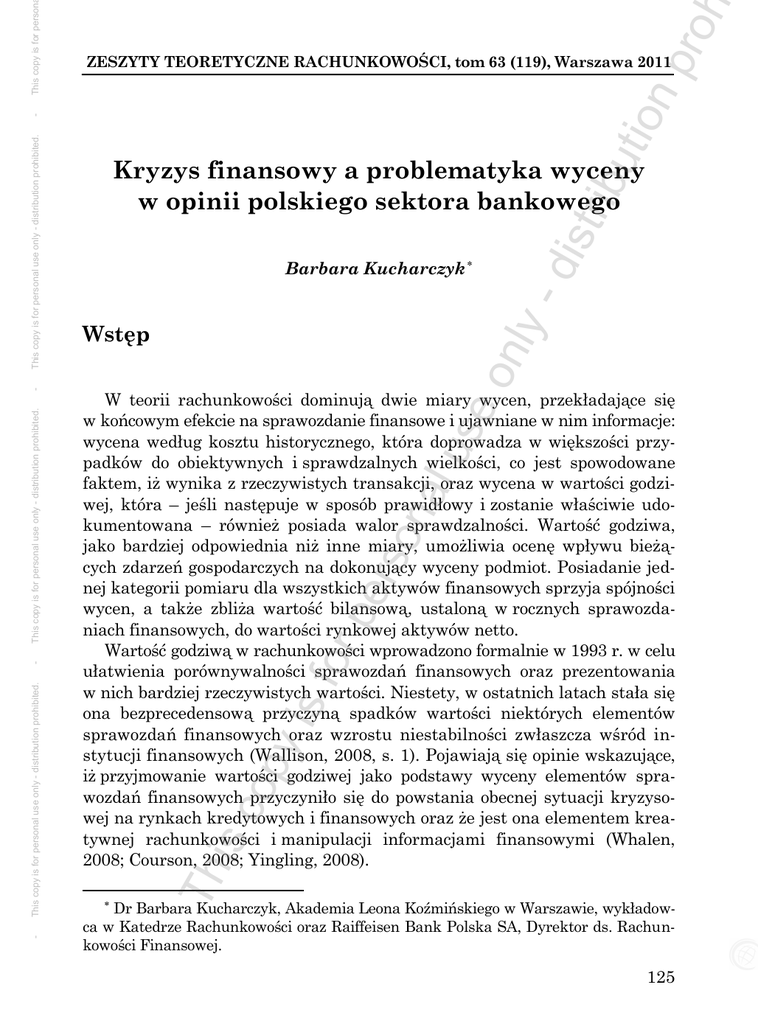 ibu tio np roh This copy is for person - dis tr Kryzys finansowy a problematyka wyceny w opinii polskiego sektora bankowego on ly - Barbara Kucharczyk Wstęp is c op y is for pe rso na lu se W teorii rachunkowości dominują dwie miary wycen, przekładające się w końcowym efekcie na sprawozdanie finansowe i ujawniane w nim informacje: wycena według kosztu historycznego, która doprowadza w większości przypadków do obiektywnych i sprawdzalnych wielkości, co jest spowodowane faktem, iż wynika z rzeczywistych transakcji, oraz wycena w wartości godziwej, która – jeśli następuje w sposób prawidłowy i zostanie właściwie udokumentowana – również posiada walor sprawdzalności. Wartość godziwa, jako bardziej odpowiednia niż inne miary, umożliwia ocenę wpływu bieżących zdarzeń gospodarczych na dokonujący wyceny podmiot. Posiadanie jednej kategorii pomiaru dla wszystkich aktywów finansowych sprzyja spójności wycen, a także zbliża wartość bilansową, ustaloną w rocznych sprawozdaniach finansowych, do wartości rynkowej aktywów netto. Wartość godziwą w rachunkowości wprowadzono formalnie w 1993 r. w celu ułatwienia porównywalności sprawozdań finansowych oraz prezentowania w nich bardziej rzeczywistych wartości. Niestety, w ostatnich latach stała się ona bezprecedensową przyczyną spadków wartości niektórych elementów sprawozdań finansowych oraz wzrostu niestabilności zwłaszcza wśród instytucji finansowych (Wallison, 2008, s. 1). Pojawiają się opinie wskazujące, iż przyjmowanie wartości godziwej jako podstawy wyceny elementów sprawozdań finansowych przyczyniło się do powstania obecnej sytuacji kryzysowej na rynkach kredytowych i finansowych oraz że jest ona elementem kreatywnej rachunkowości i manipulacji informacjami finansowymi (Whalen, 2008; Courson, 2008; Yingling, 2008). Th This copy is for personal use only - distribution prohibited. - This copy is for personal use only - distribution prohibited. - This copy is for personal use only - distribution prohibited. - ZESZYTY TEORETYCZNE RACHUNKOWOŚCI, tom 63 (119), Warszawa 2011 Dr Barbara Kucharczyk, Akademia Leona Koźmińskiego w Warszawie, wykładowca w Katedrze Rachunkowości oraz Raiffeisen Bank Polska SA, Dyrektor ds. Rachunkowości Finansowej. 125 ibu tio np roh dis tr on ly - This copy is for person - This copy is for personal use only - distribution prohibited. Źródłem obecnych problemów jest kryzys na amerykańskim rynku kredytów hipotecznych o podwyższonym ryzyku1, który rozpoczął się w USA w 2006 r. i w konsekwencji doprowadził do upadłości znaczących banków oraz instytucji finansowych. Dlaczego możemy dopatrywać się związku kryzysu z wartością godziwą? Związek ten wynika z wzajemnego powiązania światowych rynków finansowych na skutek procesów globalizacji. Ryzyko kredytowe niewywiązania się ze spłaty zobowiązania było przenoszone przez banki udzielające tego typu kredytów na inne podmioty w wyniku procesów sekurytyzacji2 lub sprzedaży złych długów. Egzekucje nieruchomości powiązanych z kredytami o podwyższonym ryzyku doprowadziły do spadku wartości rynkowej papierów wartościowych zabezpieczonych tego typu kredytami. W tej sytuacji wartość godziwa instrumentów finansowych, takich jak: Mortgage Backed Securities3, Collateraliezed Debt Obligations4, a także listów Angielska nazwa tego typu aktywów finansowych to: sub-prime mortgages, rodzaj kredytu hipotecznego, zazwyczaj wyżej oprocentowanego, udzielanego osobom, które w przeszłości miały problem ze spłatą zobowiązań. 2 W rachunkowości sekurytyzacja polega na wykupie wierzytelności ze środków uzyskanych z emisji obligacji. Sekurytyzacja określa proces emisji papierów wartościowych, które są zabezpieczone przez grupę wyselekcjonowanych aktywów. Sekurytyzacja jest procesem, w którym dłużne papiery wartościowe, takie jak obligacje czy certyfikaty inwestycyjne, są sprzedawane bezpośrednio inwestorom. 3 Mortgage Backed Securities (MBS) – hipoteczne listy zastawne, papiery wartościowe, których zabezpieczenie stanowią wierzytelności hipoteczne dające niepodzielne prawo do pobierania pożytku z grupy lub puli jednego lub większej liczby hipotek. Zebrane razem papiery muszą być ocenione przez uznane agencje ratingowe oraz uzyskać najwyższe kwalifikacje. Co więcej, kredyt musi być początkowo udzielony przez podlegającą regulacji i autoryzowaną instytucję finansową, która z góry ustala spłaty kredytu. W rzeczywistości MBS polega na zamianie przyszłej spłaty za dom przez kupującego na papiery wartościowe, które trafiają na rynek finansowy w postaci uregulowanych i zabezpieczonych transzy za pomocą instytucji emitujących ten rodzaj obligacji. W USA ważną rolę emiterów odgrywały m.in. dwie instytucje: Fannie Mae i Freddie Mac. Były to prywatne spółki akcyjne w randze instytucji federalnej, działające w tej formie od początku lat siedemdziesiątych. Ich głównym zadaniem było stwarzanie dogodnych warunków finansowych dla pożyczkodawców, potrzebnych do udzielania niskooprocentowanych pożyczek, oraz zwiększanie ich płynności finansowej. W związku z tym, zamiast czekać na spłatę pożyczek, np. Fannie Mae odkupywał pożyczki zapaczkowane w grupy o podobnej charakterystyce na rynku wtórnym. Właśnie te papiery były przyczyną kryzysu na rynku finansowym w 2008 r., gdyż pożyczkobiorcy, poprzez podwyższenie stóp procentowych, nie byli w stanie spłacać swych należności wobec pożyczkodawców takich jak Fannie Mae oraz Freddie Mac. 4 Collateraliezed Debt Obligations (CDO) – instrumenty sekurytyzacji oparte na obligacjach razem z instrumentami emitowanymi na podstawie kredytów hurtowych należą do grupy papierów wartościowych opartych na długu. - se lu na rso pe for y is op is c Th This copy is for personal use only - distribution prohibited. - This copy is for personal use only - distribut