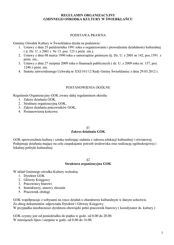 REGULAMIN ORGANIZACYJNY GMINNEGO OŚRODKA KULTURY W ŚWIERKLAŃCU PODSTAWA PRAWNA Gminny Ośrodek Kultury w Świerklańcu działa na podstawie: 1. Ustawy z dnia 25 października 1991 roku o organizowaniu i prowadzeniu działalności kulturalnej ( tj. Dz. U. z 2001 r. Nr 13. poz. 123 z późn. zm.), 2. Ustawy z dnia 08 marca 1990 roku o samorządzie gminnym (tj. Dz. U. z 2001 nr 142, poz.1591 z późn. zm., 3. Ustawy z dnia 27 sierpnia 2009 roku o finansach publicznych ( dz. U. z 2009 roku nr. 157, poz. 1240 z późn. zm. 4. Statutu zatwierdzonego Uchwałą nr XXI/161/12 Rady Gminy Świerklaniec z dnia 29.03.2012 r. POSTANOWIENIA OGÓLNE Regulamin Organizacyjny GOK zwany dalej regulaminem określa: 1. Zakres działania GOK, 2. Strukturę organizacyjną GOK, 3. Zakres działania pracowników GOK, 4. Postanowienia końcowe. §1 Zakres działania GOK GOK upowszechnia kulturę i sztukę realizując zadania z zakresu edukacji kulturalnej i oświatowej. Podejmuje działania mające na celu zaspakajanie potrzeb środowiska oraz realizację ogólnokrajowej i lokalnej polityki kulturalnej. §2 Struktura organizacyjna GOK W skład Gminnego ośrodka Kultury wchodzą: 1. Dyrektor GOK 2. Główny Księgowy 3. Pracownicy biurowi 4. Instruktorzy, umowy zlecenie 5. Pracownik obsługi GOK współpracuje z sołtysami na rzecz działań o charakterze kulturalnym w danym sołectwie. Za obieg dokumentów odpowiada Dyrektor i Główny Księgowy W przypadku nieobecności dyrektora obowiązki pełni pracownik biurowy ( koordynator ds. kultury ) GOK czynny jest od poniedziałku do piątku w godz. od 8.00 do 20.00. W miesiącach lipcu i sierpniu w godz. od 8.00 do 16.00. 1 §3 Zakres działania pracowników GOK Do wspólnych zadań pracowników należy w szczególności: 1. Wypracowywanie programu działalności kulturalno wychowawczej, 2. Inspirowanie i opieka nad działalnością zespołów, 3. Organizowanie imprez kulturalno-oświatowych, artystycznych i rozrywkowych dla mieszkańców, 4. Utrwalanie tradycji gminnych i regionalnych, 5. Organizowanie różnych form pracy z dziećmi, 6. Organizowanie obchodów z okazji ważnych wydarzeń historycznych i regionalnych w formie przeglądów, konkursów, wystaw, festiwali i innych imprez kulturalno oświatowych, 7. Realizacja zespołów i indywidualnej aktywności kulturalnej i twórczości artystycznej, 8. Opracowanie planów, sprawozdań działalności kulturalnej i rekreacyjnej, 9. Inne zadania zlecone przez Dyrektora. Na czele GOK stoi Dyrektor, który kieruje jego działalnością, reprezentuje GOK na zewnątrz i jest za niego odpowiedzialny. Dyrektora powołuje i odwołuje Wójt Gminy Świerklaniec. Wszyscy pracownicy GOK podlegają bezpośrednio Dyrektorowi. Dyrektor przyjmuje i zwalnia pracowników oraz określa ich zakres czynności. Do zadań Dyrektora należy: 1. Opracowywanie planów finansowych i planu działania GOK, 2. Dysponowanie określonymi w planie środkami finansowymi i sprawowanie nadzoru nad działalnością finansowo-gospodarczą GOK, 3. Sporządzanie sprawozdań z działalności, 4. Właściwe administrowanie oraz dbałość o powierzone mienie, 5. Wprowadzenie w życie uchwał i zarządzeń organów nadrzędnych, 6. Realizacje innych zadań zleconych przez Wójta Gminy Świerklaniec, 7. Zapewnienie pracownikom przydziału pracy zgodnie z treścią zawartej umowy o pracę, 8. Zapewnienie pracownikom potrzebnych materiałów niezbędnych do wykonywania pracy, 9. Zaznajomienie pracowników z zakresem ich obowiązków, sposobem wykonywania pracy na wyznaczonym stanowisku, 10. Zapewnienie bezpiecznych i higienicznych warunków pracy, 11. Ułatwianie podnoszenia kwalifikacji zawodowych. Do zadań Głównego Księgowego należy: 1. Zapewnienie prawidłowości, terminowości i zgodności sprawozdań finansowych, 2. Kierowanie rachunkowością GOK, 3. Opracowywanie analizy wydatków w stosunku do przelanych środków mających na celu, niedopuszczenie do przekroczeń, 4. Dekretacje otrzymanych dokumentów finansowych i zatwierdzenie dokumentów księgowych do wypłaty, 5. Przygotowanie wszelkich pism z zakresu spraw finansowych, 6. Opracowywanie planów finansowych, 7. Dokonywanie okresowych analiz z wykorzystania środków, 8. Prowadzenie wszelkich czynności dotyczących księgowości, 9. Ochrona mienia będącego w posiadaniu instytucji oraz terminowe i prawidłowe rozliczenie osób majątkowo odpowiedzialnych za to mienie. Główny Księgowy ponosi odpowiedzialność za całokształt prowadzenia działalności finansowej. 2 Do zadań pracowników biurowych należy: 1. Opracowanie i realizowanie planu pracy GOK, 2. Asystowanie w przygotowaniu ofert, raportów danych i wniosków, 3. Tworzenie strony internetowej, 4. Zabezpieczenie dokumentów, 5. Organizacja spotkań, zebrań, wyjazdów służbowych i konferencji, 6. Prowadzenie działu kadr, 7. Pomoc przy organizowaniu imprez plenerowych i w GOK, 8. Współuczestniczenie w opracowaniu gminnego kalendarza imprez, 9. Pomoc merytoryczna przy planowaniu imprez i organizowaniu imprez na terenie gminy, 10. Dążenie do uruchomienia kół zainteresowań dla dzieci i młodzieży. Do zadań instruktorów należy: 1. Kultywowanie i rozwijanie regionalnych tradycji kulturalnych, twórczości kulturowej i folkloru, rękodzieła ludowego i artystycznego, 2. Inspirowanie i organizowanie grup młodzieży, dorosłych mieszkańców do aktywnego i twórczego uczestnictwa w życiu kulturalnym środowiska, 3. Udział w przeglądach i konkursach, 4. Wypełnianie na bieżąco dzienników zajęć i przedstawianie ich dyrektorowi na koniec każdego miesiąca, 5. Prowadzenie zajęć i kółek zainteresowań, 6. Organizacja imprez, spektakli, występów z uczestnikami zajęć, 7. Współpraca z pracownikami Gminnego Ośrodek Kultury w Świerklańcu. Do zadań pracownika obsługi należy: 1. Utrzymywanie bieżącej czystości i porządku w pomieszczeniach i sprzętach. 2. Inne czynności wynikające z potrzeb placówki zle