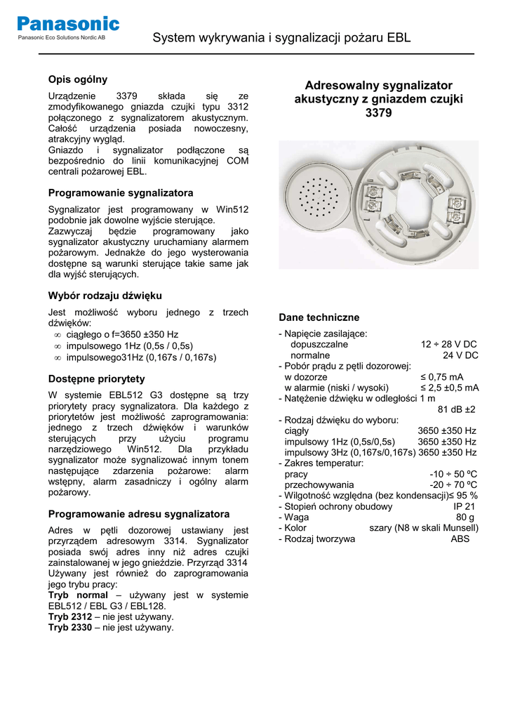 Panasonic Panasonic Eco Solutions Nordic AB System wykrywania i sygnalizacji pożaru EBL Opis ogólny Urządzenie 3379 składa się ze zmodyfikowanego gniazda czujki typu 3312 połączonego z sygnalizatorem akustycznym. Całość urządzenia posiada nowoczesny, atrakcyjny wygląd. Gniazdo i sygnalizator podłączone są bezpośrednio do linii komunikacyjnej COM centrali pożarowej EBL. Adresowalny sygnalizator akustyczny z gniazdem czujki 3379 Programowanie sygnalizatora Sygnalizator jest programowany w Win512 podobnie jak dowolne wyjście sterujące. Zazwyczaj będzie programowany jako sygnalizator akustyczny uruchamiany alarmem pożarowym. Jednakże do jego wysterowania dostępne są warunki sterujące takie same jak dla wyjść sterujących. Wybór rodzaju dźwięku Jest możliwość wyboru jednego z trzech dźwięków: • ciągłego o f=3650 ±350 Hz • impulsowego 1Hz (0,5s / 0,5s) • impulsowego31Hz (0,167s / 0,167s) Dostępne priorytety W systemie EBL512 G3 dostępne są trzy priorytety pracy sygnalizatora. Dla każdego z priorytetów jest możliwość zaprogramowania: jednego z trzech dźwięków i warunków sterujących przy użyciu programu narzędziowego Win512. Dla przykładu sygnalizator może sygnalizować innym tonem następujące zdarzenia pożarowe: alarm wstępny, alarm zasadniczy i ogólny alarm pożarowy. Programowanie adresu sygnalizatora Adres w pętli dozorowej ustawiany jest przyrządem adresowym 3314. Sygnalizator posiada swój adres inny niż adres czujki zainstalowanej w jego gnieździe. Przyrząd 3314 Używany jest również do zaprogramowania jego trybu pracy: Tryb normal – używany jest w systemie EBL512 / EBL G3 / EBL128. Tryb 2312 – nie jest używany. Tryb 2330 – nie jest używany. Dane techniczne - Napięcie zasilające: dopuszczalne 12 ÷ 28 V DC normalne 24 V DC - Pobór prądu z pętli dozorowej: w dozorze ≤ 0,75 mA w alarmie (niski / wysoki) ≤ 2,5 ±0,5 mA - Natężenie dźwięku w odległości 1 m 81 dB ±2 - Rodzaj dźwięku do wyboru: ciągły 3650 ±350 Hz impulsowy 1Hz (0,5s/0,5s) 3650 ±350 Hz impulsowy 3Hz (0,167s/0,167s) 3650 ±350 Hz - Zakres temperatur: pracy -10 ÷ 50 ºC przechowywania -20 ÷ 70 ºC - Wilgotność względna (bez kondensacji)≤ 95 % - Stopień ochrony obudowy IP 21 - Waga 80 g - Kolor szary (N8 w skali Munsell) - Rodzaj tworzywa ABS System wykrywania i sygnalizacji pożaru EBL Sposób podłączenia urządzenia 3379. Wejście z pętli COM Wskaźnik zadziałania Do gniazda można wstawić czujki analogowe szeregów: 33xx i 43xx Wyjście do pętli COM Tylko jeden wskaźnik zadziałania 2218 może być podłączony do gniazda. UWAGA: Adres (numer techniczny) sygnalizatora akustycznego należy zaprogramować przed jego podłączeniem do pętli komunikacyjnej COM. W czujce zamontowanej w gnieździe należy zaprogramować inny adres. RAJ International Sp. z o.o. www.raj-international.net ul. Wał Miedzeszyński 552 B e-mail: [email protected] 03-994 Warszawa Przedstawiciel firmy: Panasonic Eco Solutions Nordic AB tel. (022) 679 92 11 fax. (022) 679 49 87 3379 / 04.08.2016 / Rev.1