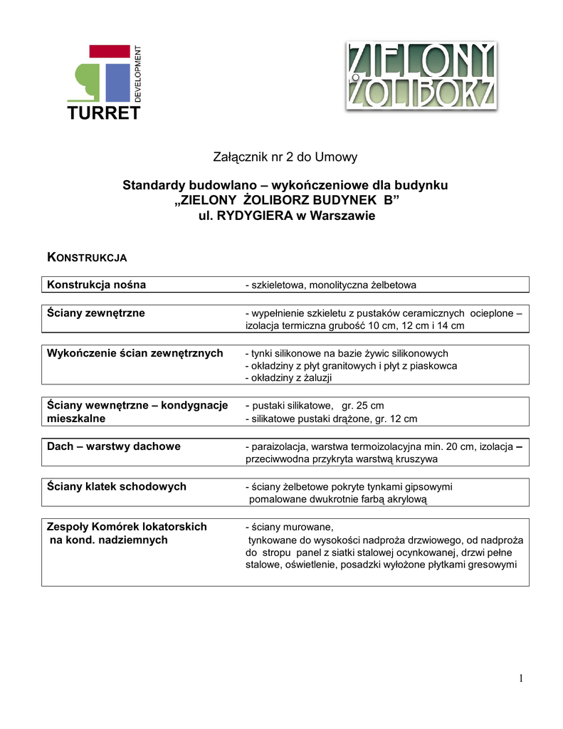 Załącznik nr 2 do Umowy Standardy budowlano – wykończeniowe dla budynku „ZIELONY ŻOLIBORZ BUDYNEK B” ul. RYDYGIERA w Warszawie KONSTRUKCJA Konstrukcja nośna - szkieletowa, monolityczna żelbetowa Ściany zewnętrzne - wypełnienie szkieletu z pustaków ceramicznych ocieplone – izolacja termiczna grubość 10 cm, 12 cm i 14 cm Wykończenie ścian zewnętrznych - tynki silikonowe na bazie żywic silikonowych - okładziny z płyt granitowych i płyt z piaskowca - okładziny z żaluzji Ściany wewnętrzne – kondygnacje mieszkalne - pustaki silikatowe, gr. 25 cm Dach – warstwy dachowe - paraizolacja, warstwa termoizolacyjna min. 20 cm, izolacja – przeciwwodna przykryta warstwą kruszywa Ściany klatek schodowych - ściany żelbetowe pokryte tynkami gipsowymi pomalowane dwukrotnie farbą akrylową Zespoły Komórek lokatorskich na kond. nadziemnych - ściany murowane, tynkowane do wysokości nadproża drzwiowego, od nadproża do stropu panel z siatki stalowej ocynkowanej, drzwi pełne stalowe, oświetlenie, posadzki wyłożone płytkami gresowymi - silikatowe pustaki drążone, gr. 12 cm 1 Komórki lokatorskie na kond. nadziemnych - ściany murowane, tynkowane, drzwi pełne stalowe, oświetlenie, posadzki wyłożone płytkami gresowymi Komórki lokatorskie na kond. - 2 i –1 - ściany murowane z pustaków betonowych do wysokości nadproża drzwiowego, od nadproża do stropu panele z siatki stalowej ocynkowanej, drzwi stalowe pełne, oświetlenie, posadzki betonowe zatarte metodą przemysłową MIESZKANIA Podłogi mieszkań - posadzka betonowa pod wykończenie indywidualne przez lokatorów. Podłogi i balustrady portfenetrów, loggii i tarasów - płytki gresowe mrozoodporne, balustrady z profili stalowych malowane proszkowo, wypełnione szkłem laminowanym bezpiecznym nieprzeziernym z pochwytem drewnianym, oświetlenie. Ściany - ściany międzylokalowe z bloczków silikatowych gr. 25 cm - ściany działowe wewnątrz lokali mieszkalnych – bloczki silikatowe gr. 12 cm. - tynki gipsowe malowane jednokrotnie farbą emusyjną na kolor biały - w łazienkach tynk cementowo-wapienny lub tynk gipsowy na ostro Sufity - tynki gipsowe, malowane jednokrotnie farbą emulsyjną na kolor biały. - łazienki – tynk cementowo-wapienny lub gipsowy malowany jednokrotnie farbą emulsyjną - wysokość mieszkań: SILVER – 283 cm - kondygnacje GOLD – 300 cm - kondygnacje PLATINIUM – 300 cm - kondygnacje 2 Ogródki - wybrane mieszkania na parterze wyposażone są w ogródki dostępne z loggii mieszkania. - tymczasowe wydzielenie ogródków: słupki stalowe i siatka z drutu ocynkowanego z nasadzeniami żywopłotu - mieszkania wyposażone są w zawory ze złączką do węża w loggii mieszkania Instalacje Mieszkania wyposażone są w instalacje: - wodno – kanalizacyjna : instalacja wodna doprowadzona pod przybór instalacja kanalizacyjna wyprowadzona z szachtu - centralnego ogrzewania - instalacja elektryczna z osprzętem (jednofazowa) - instalacja trójfazową do kuchni elektrycznych - instalacja wideodomofonowa z osprzętem - instalację antynapadową z osprzętem - instalacja telefoniczna (wyłącznie orurowanie) - instalacja telewizji kablowej (wyłącznie orurowanie) - instalacja mechaniczna wywiewna - napowietrzanie mieszkań – nawiewniki okienne i ścienne - klimantyzacja: SILVER – możliwość zamontowania klimatyzacji indywidualnej typu SPLIT z jedną jednostką zewnętrzną (montowaną w loggii) i jednostką wewnętrzną montowaną w jednym pokoju ( montaż jednostek klimatyzacji i instalacji w zakresie lokatora) GOLD - możliwość zamontowania klimatyzacji indywidualnej typu MULTISPLIT z jedną jednostką zewnętrzną (montowaną w loggii) i kilkoma jednostkami wewnętrznymi montowanymi we wszystkich pokojach w mieszkaniu ( montaż jednostek klimatyzacji i instalacji w zakresie lokatora) PLATINIUM - przewidziana jest klimatyzacja indywidualna typu MULTISPLIT z jedną jednostką zewnętrzną montowaną na dachu i kilkoma jednostkami wewnętrznymi montowanymi we wszystkich pokojach w mieszkaniu - opomiarowanie mediów znajduje się w szachtach w hollu windowym 3 Mieszkania na piętrach: parter, 1, 2, 3 i 5 w kuchni i łazience mogą być wyposażone w klapy rewizyjne Stolarka okienna - okna drewniane – szyby zespolone. - od strony ulicy Rydygiera okna o podwyższonym poziomie tłumienia hałasu. - okna i drzwi balkonowe na parterze antywłamaniowe Parapety - konglomerat Drzwi wejściowe - standard DIERRE, antywłamaniowe klasy „C” Portale drzwi wejściowych do mieszkań: SILVER – 1 glif +panel 205x30 płyta MDF fornirowana GOLD - glify + panel 205x30 płyta MDF fornirowana PLATINIUM – glify + panel 205x30 +panel nad drzwiami do wysokości sufitu podwieszonego – płyta MDF fornirowana HOLE I KLATKI SCHODOWE Drzwi wejściowe do klatek schodowych - aluminiowe, szklone - drzwi stalowe przeciwpożarowe wejściowe z garażu do przedsionków klatek schodowych. Klatki schodowe - gres na stopniach, podestach i spocznikach - balustrada stalowa z pochwytem drewnianym Holle windowe Przedsionki Wiatrołapy holle windowe: - posadzka gresowa - ściany tynkowane malowane dwukrotnie - portale windowe – płytki gresowe - na parterze i piętrach z mieszkaniami standard Pla tinium hole windowe wyposażone są w lustra. - posadzka – płyty kamienne granitowe lub piaskowiec. - ściany - płyty kamienne granitowe - skrzynki na listy-stal nierdzewna szczotkowana 4 - wycieraczka systemowa - oświetlenie Windy - firmy „OTIS” lub „SCHINDLER” lub równorzędne GARAŻE Miejsca postojowe - numerowane, wyznaczone liniami poziomymi - powierzchnia min. 230 cm x 500 cm - posadzka: płyta bet. z spadkiem i posypką utwardzająca - bramy garażowe firmy HÖRMANN lub równorzędne. OTOCZENIE Wejścia do budynków - wyłożone kostką betonową z elementami kostki granitowej lub elementami imitującymi kostkę granitową Drogi i chodniki - wyłożone kostką betonową z elementami kost